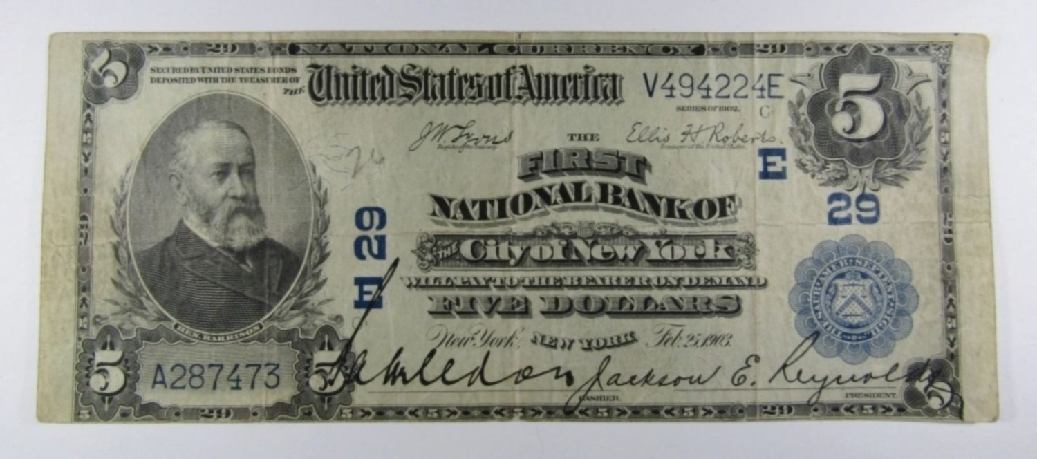 NICE CONDITION – THE FIRST NATIONAL BANK OF THE CITY OF NEW YORK, NY – FIVE DOLLAR NATIONAL CURRENCY
