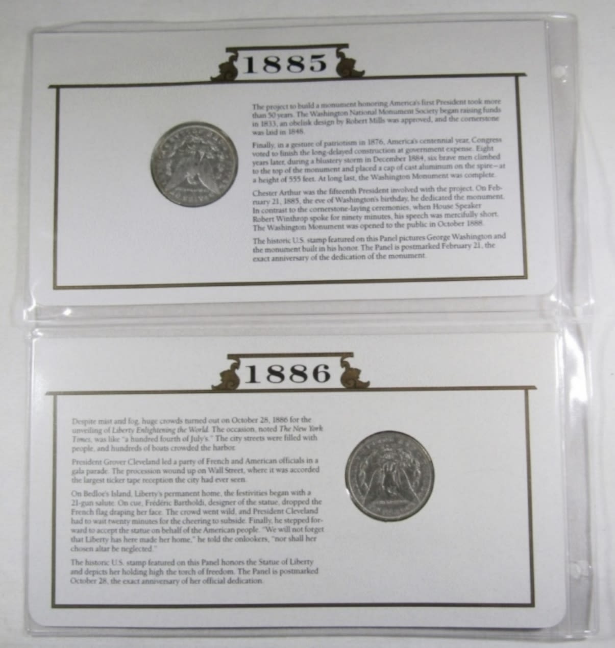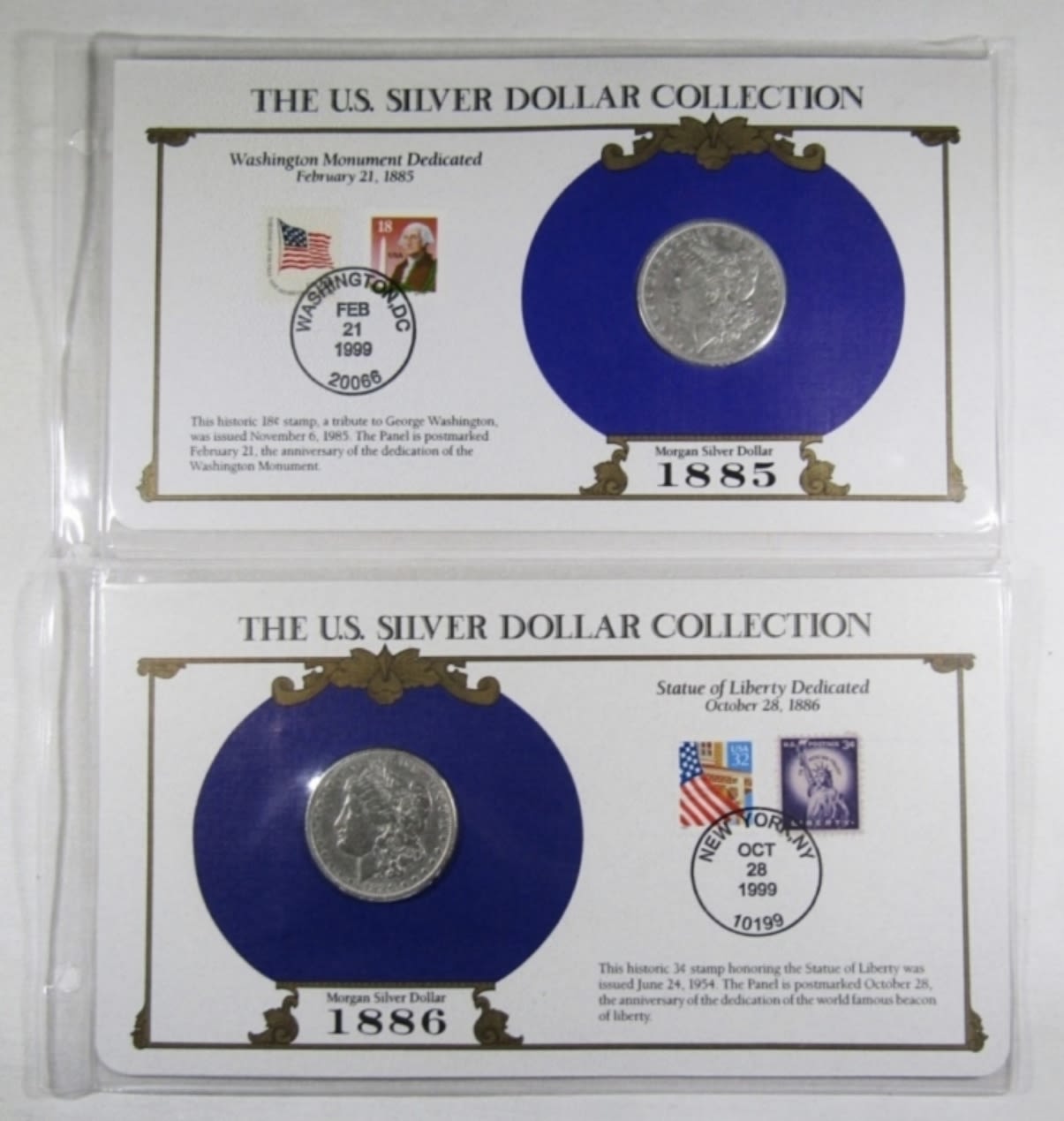 SILVER DOLLARS COMBINED WITH HISTORIC STAMPS AND POST MARKS. FROM POSTAL COMMEMORATIVE SOCIETY THE US SILVER DOLLAR COLLECTION.