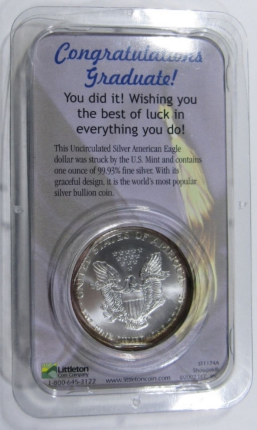 AMERICAN SILVER EAGLE 1ozt .999 PURE SILVER. “CONGRATULATIONS GRADUATE!” DESIGN
