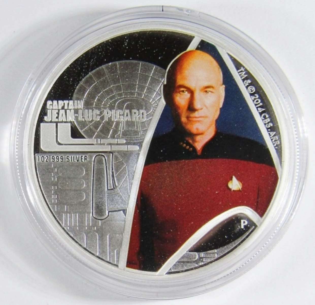 TUVALU 1oz SILVER, CAPTAIN JEAN-LUC PICARD, WITH ORIGINAL BOX, DISPLAY, AND COA.