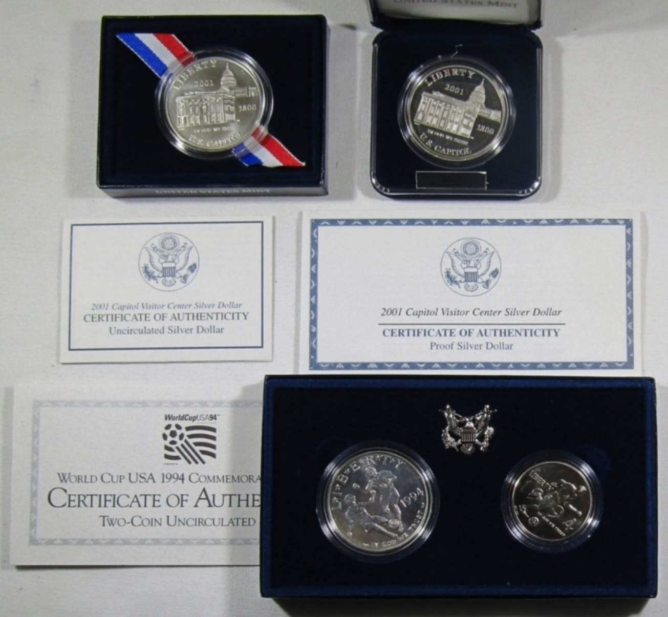 1994 2PC UNC WOLRD CUP SILVER DOLLAR AND HALF AND TWO 2001 U.S. CAPITOL VISITOR CENTER ONE PROOF AND ONE UNC SILVER DOLLARS