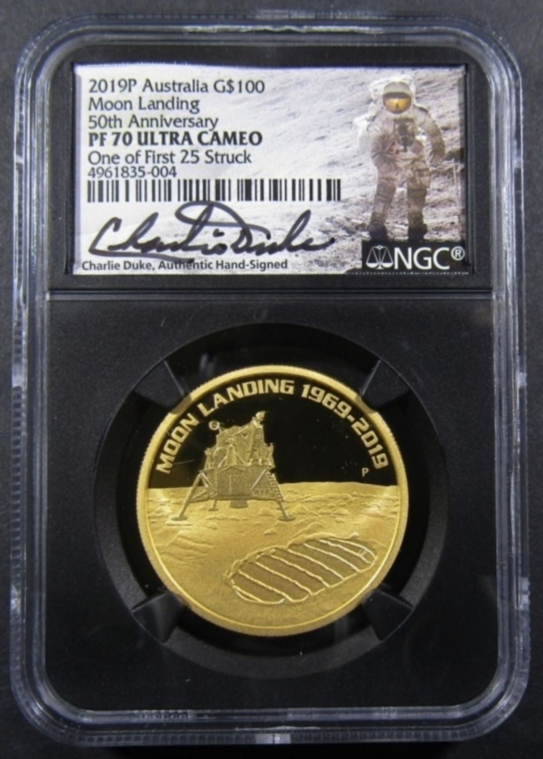 NGC PF-70 ULTRA CAMEO, 50TH ANNIV. CHARLIE DUKE SIGNED, ONE OF FIRST 25 STRUCK IN BOX WITH COA