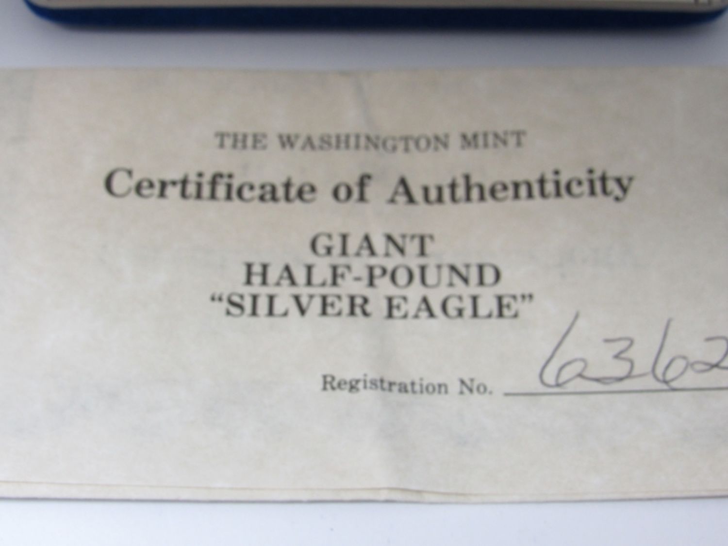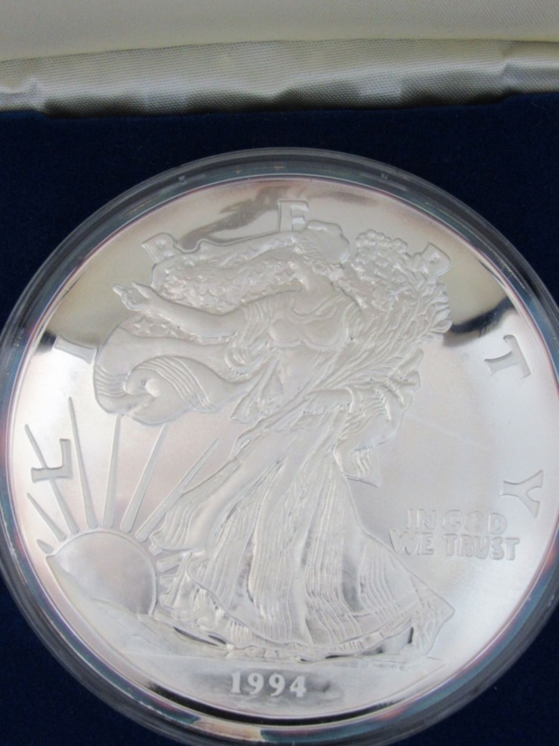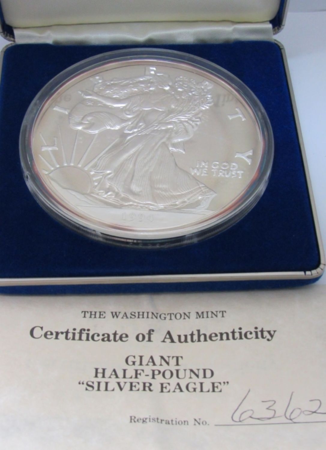 8 TROY OZ SILVER PROOF REPLICA OF 1994 SILVER EAGLE, IN VELVET BOX WITH COA. WASHINGTON MINT.