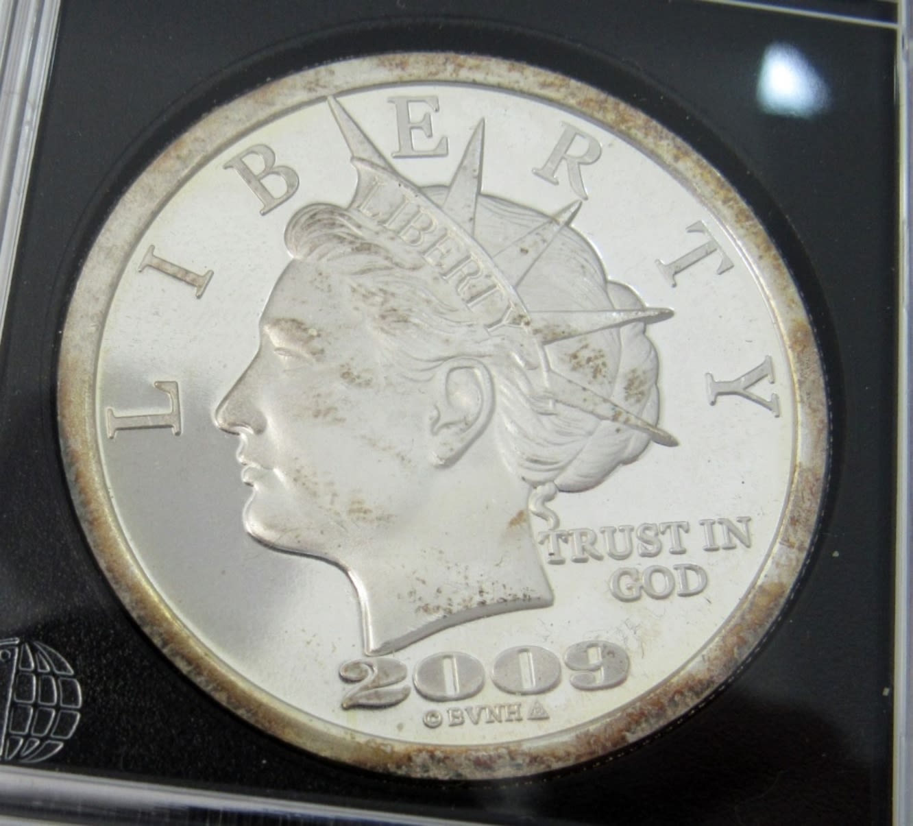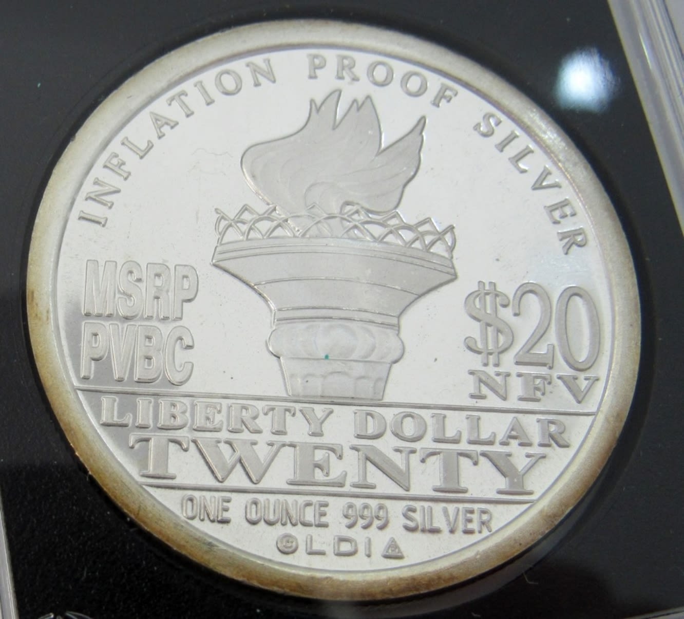 “$20 LIBERTY DOLLAR” SILVER ROUND IN PLASTIC SLAB.