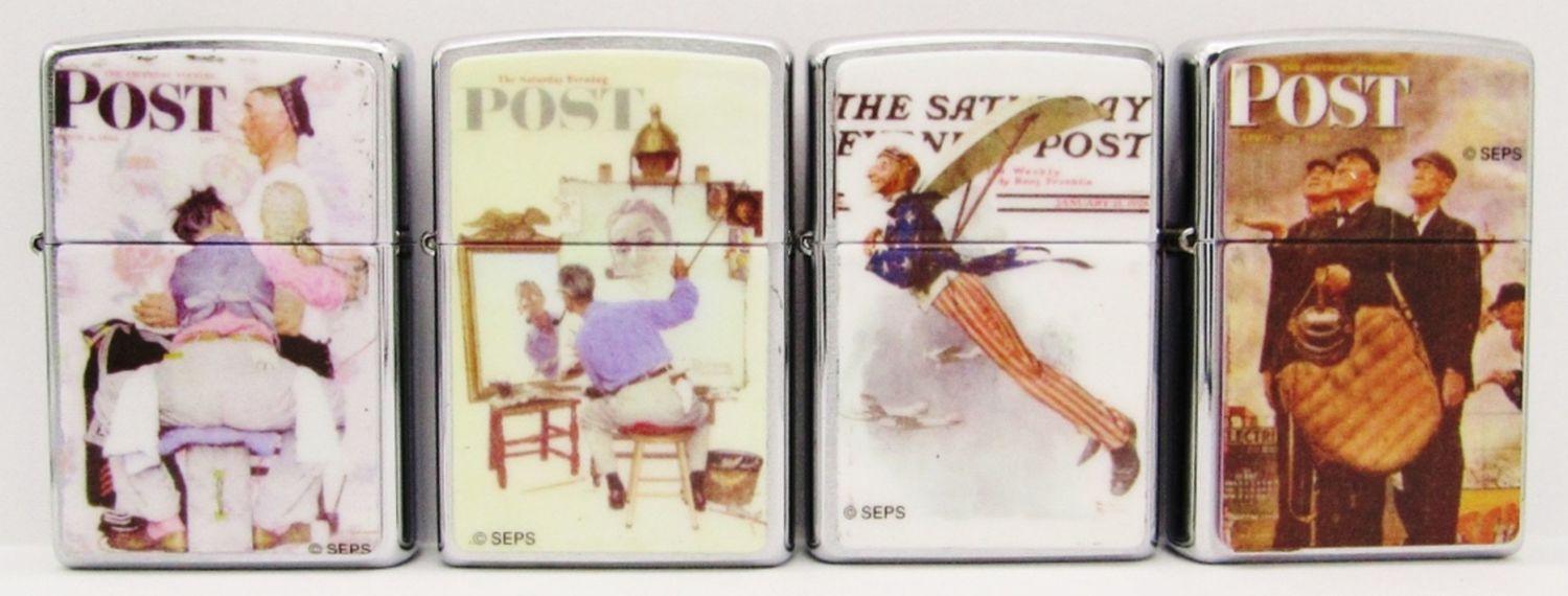 2002 The Saturday Evening Post; “Flying Uncle Sam”, “Baseball Umpires”, “Self Portrait”, “Tattoo Artist”! All SEALED Zippo Lighters!