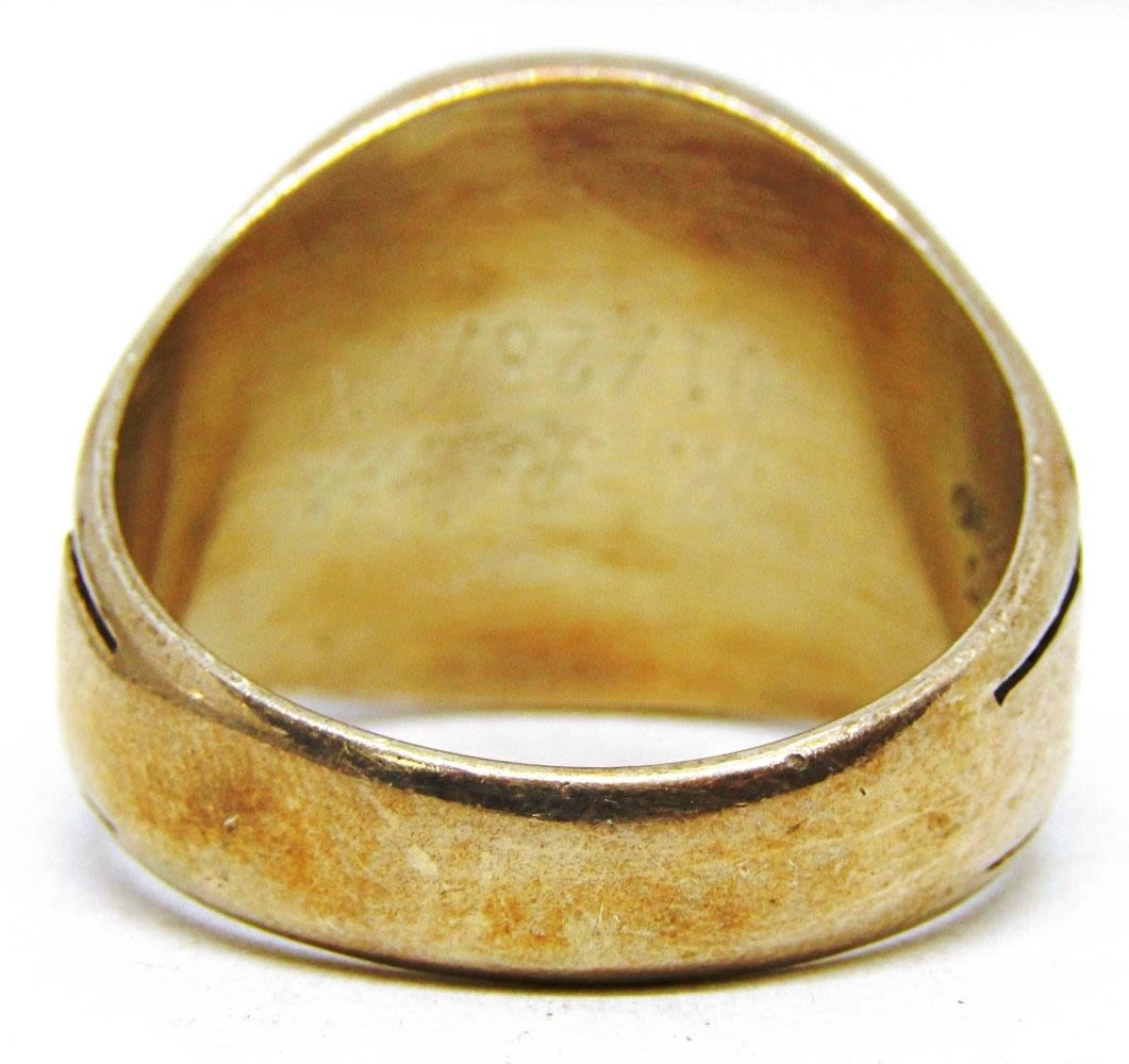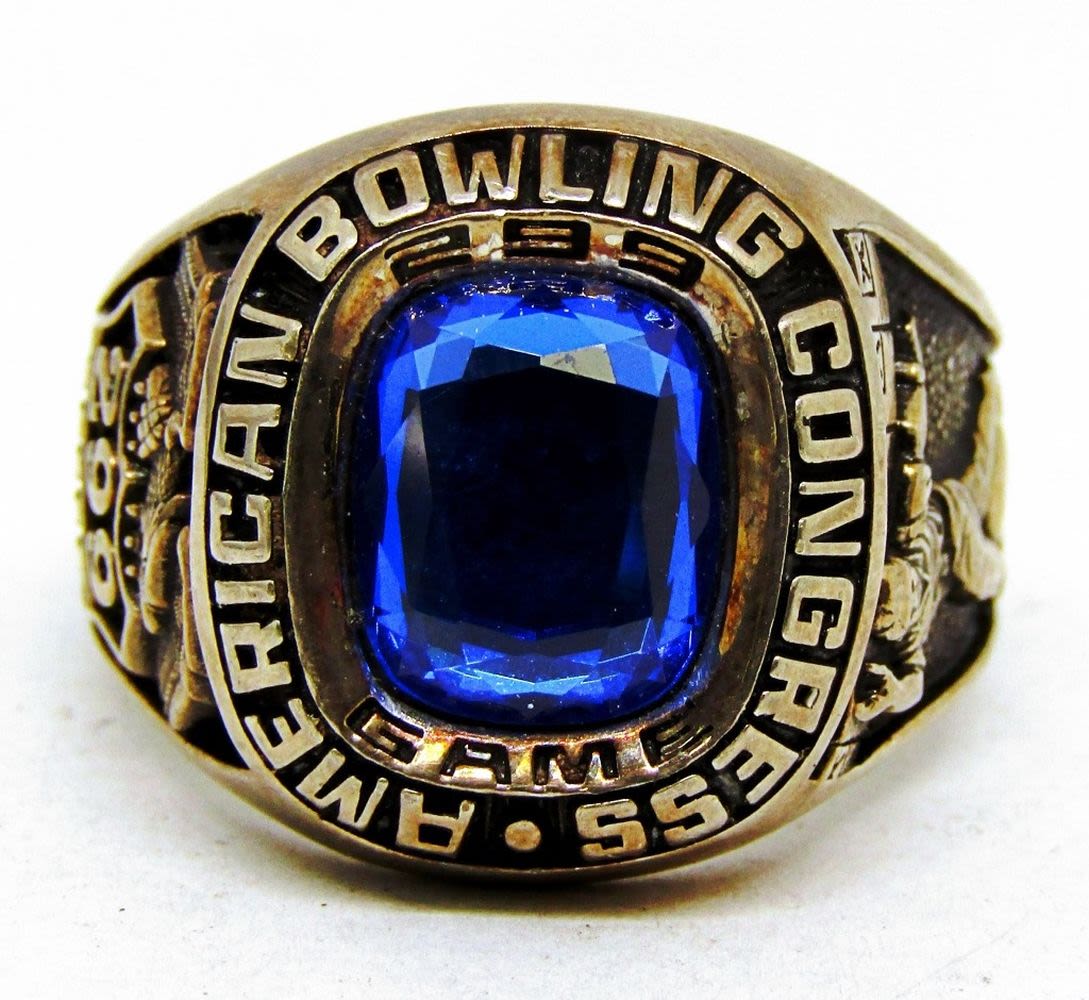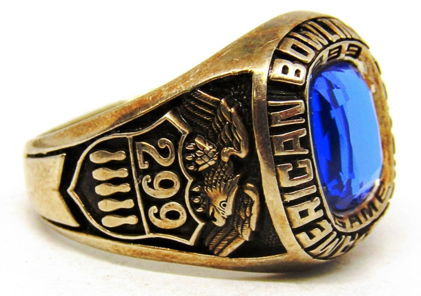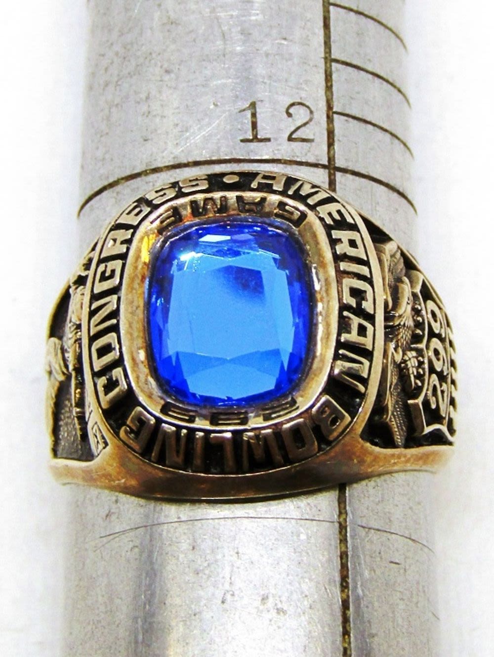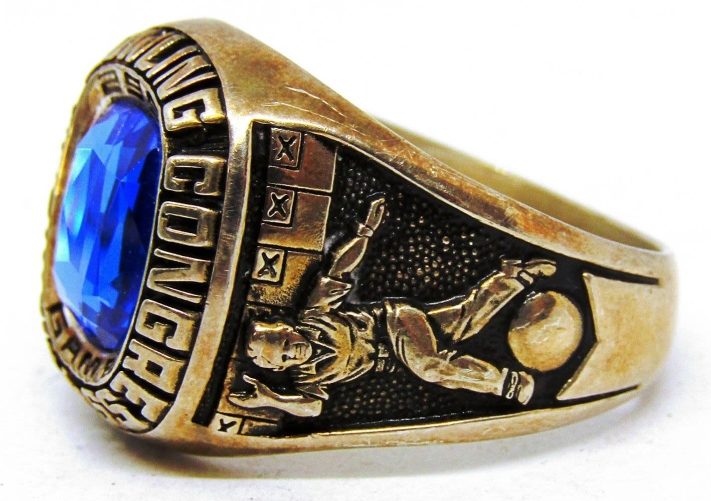 ACHIEVEMENT RING WITH NAVY BLUE CENTER STONE-RING SIZE 13-TOTAL 11 DWT