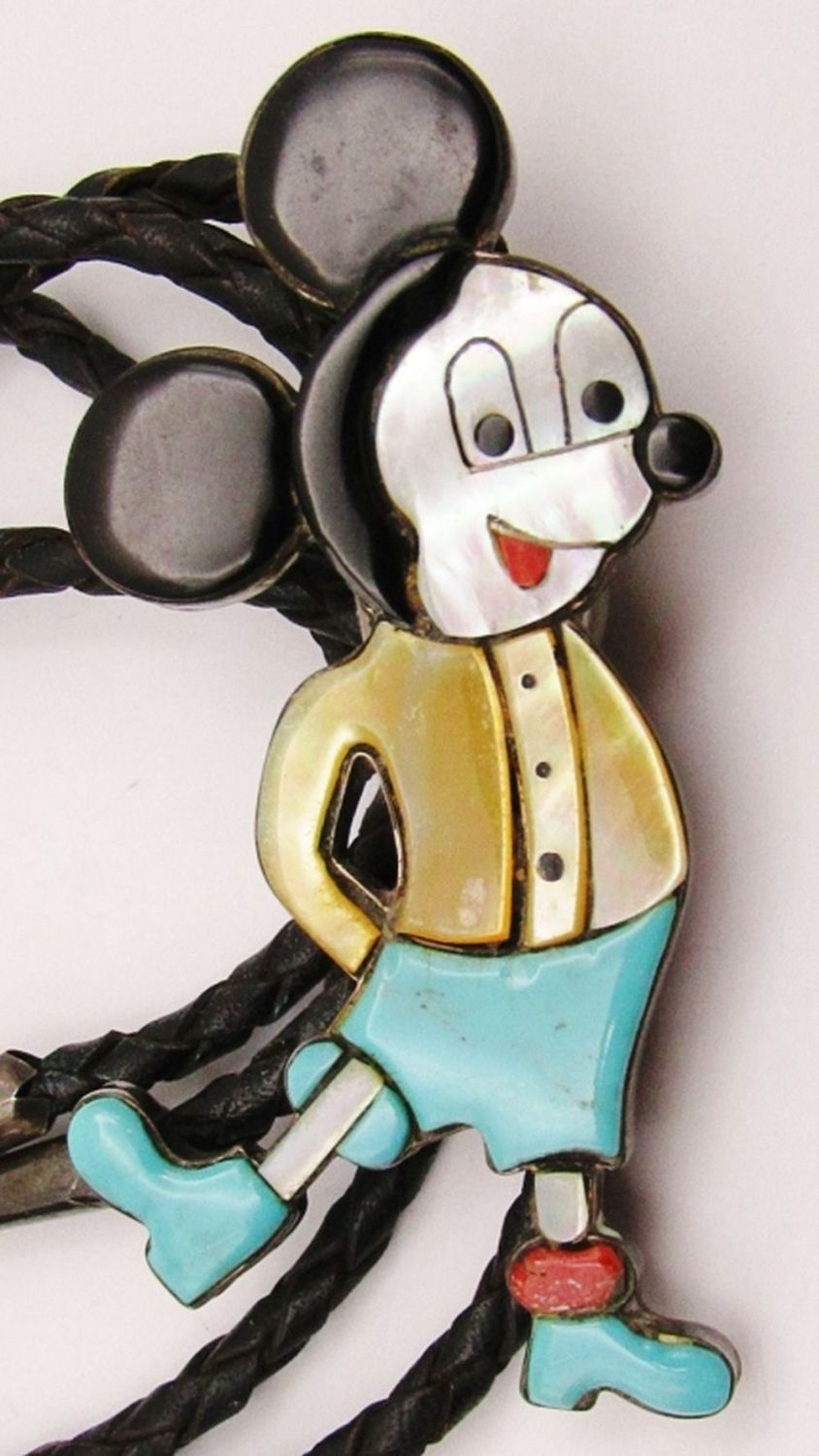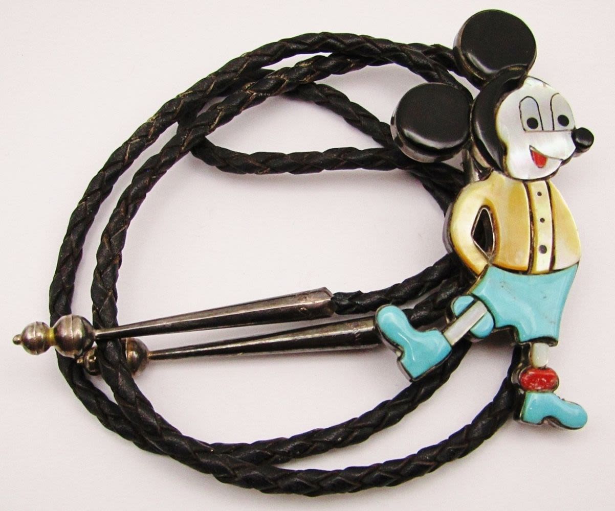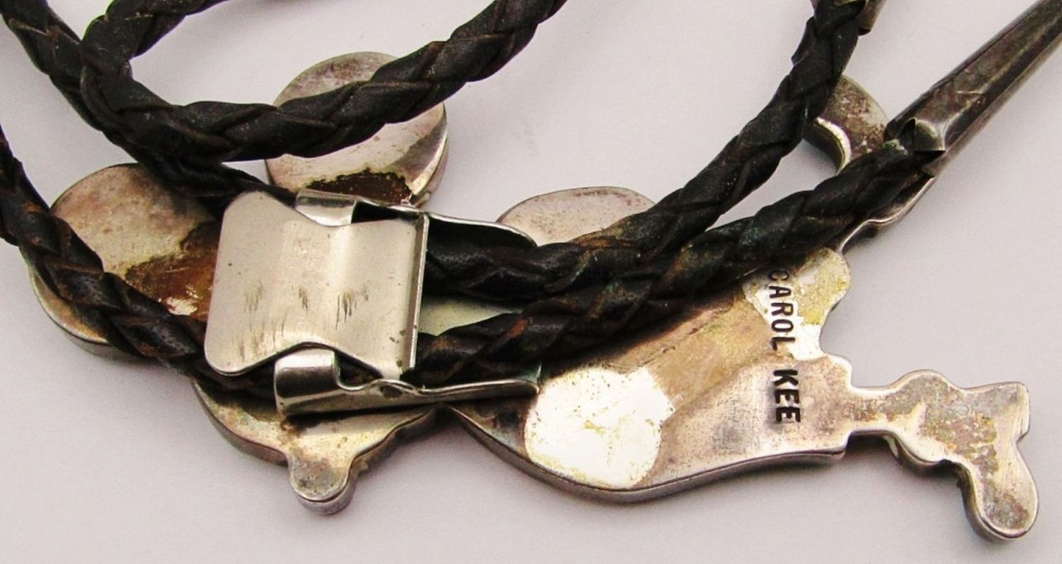 STAMPED with INLAY STONES – 3 1/2″ TALL on LEATHER BOLO TIE with STERLING TIPS (26 DWT)
