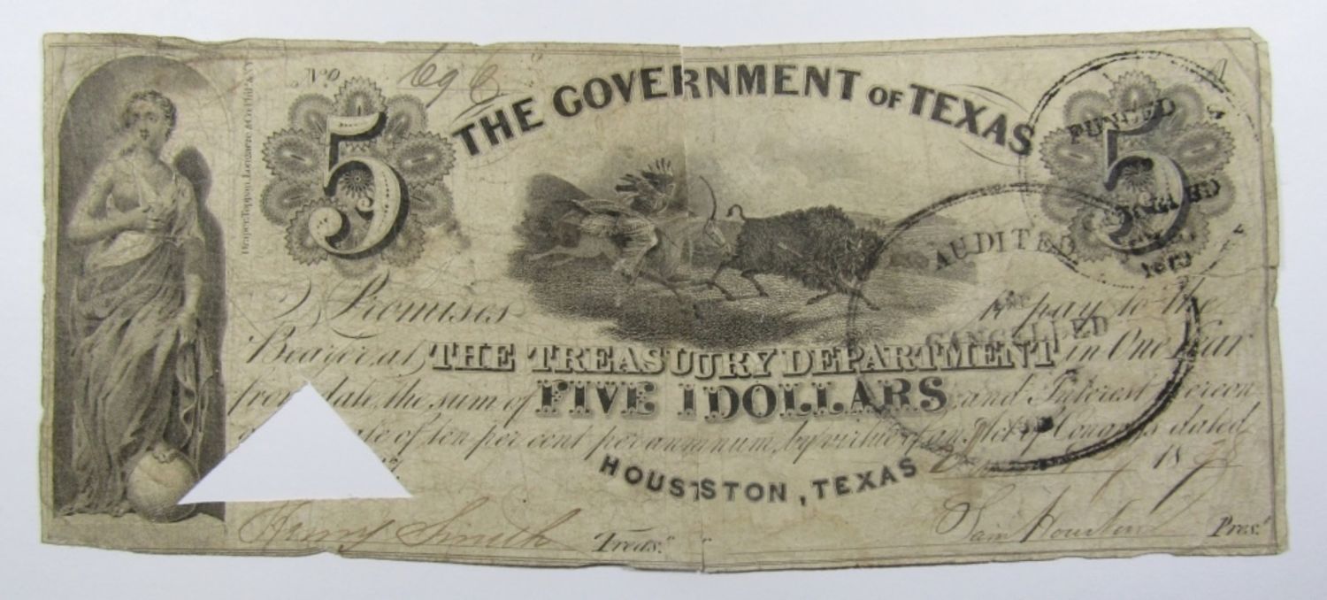 THE GOVERNMENT OF TEXAS, HOUSTON. LOOKS LIKE TWO HALVES OF DIFFERENT BILLS TAPED TOGETHER