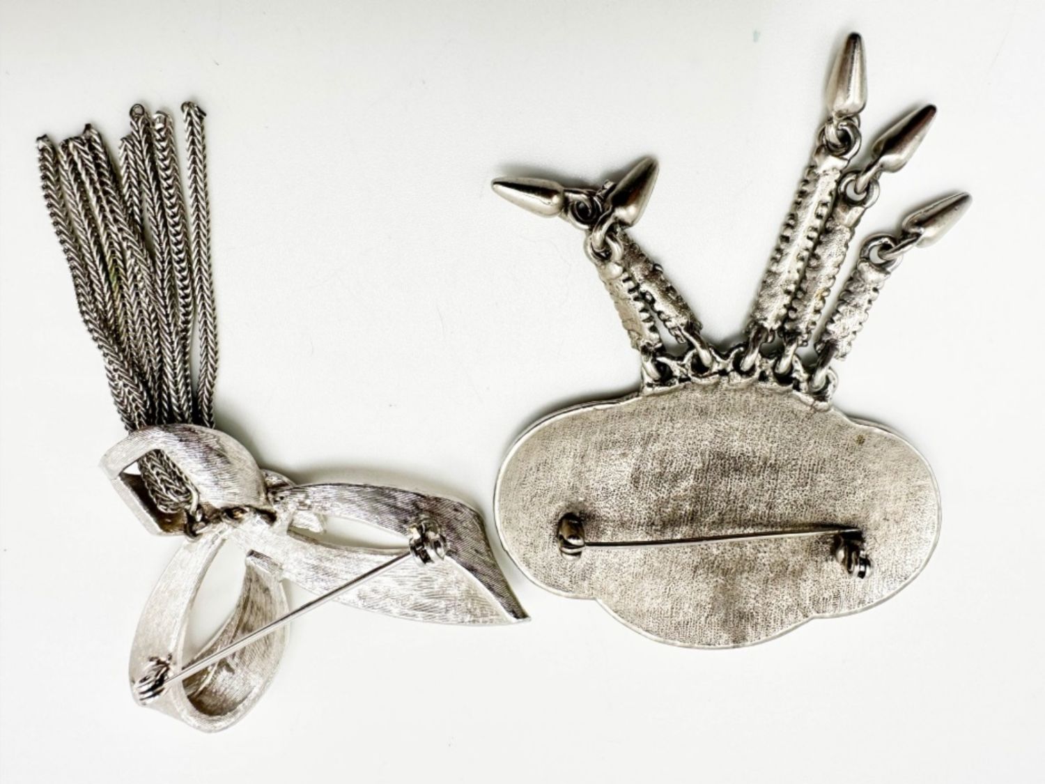TWO DANGLE BROOCHES IN SILVER TONES