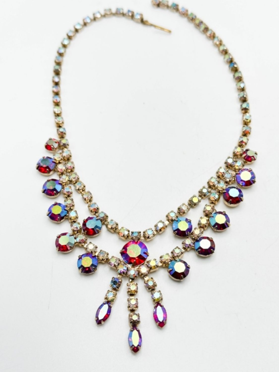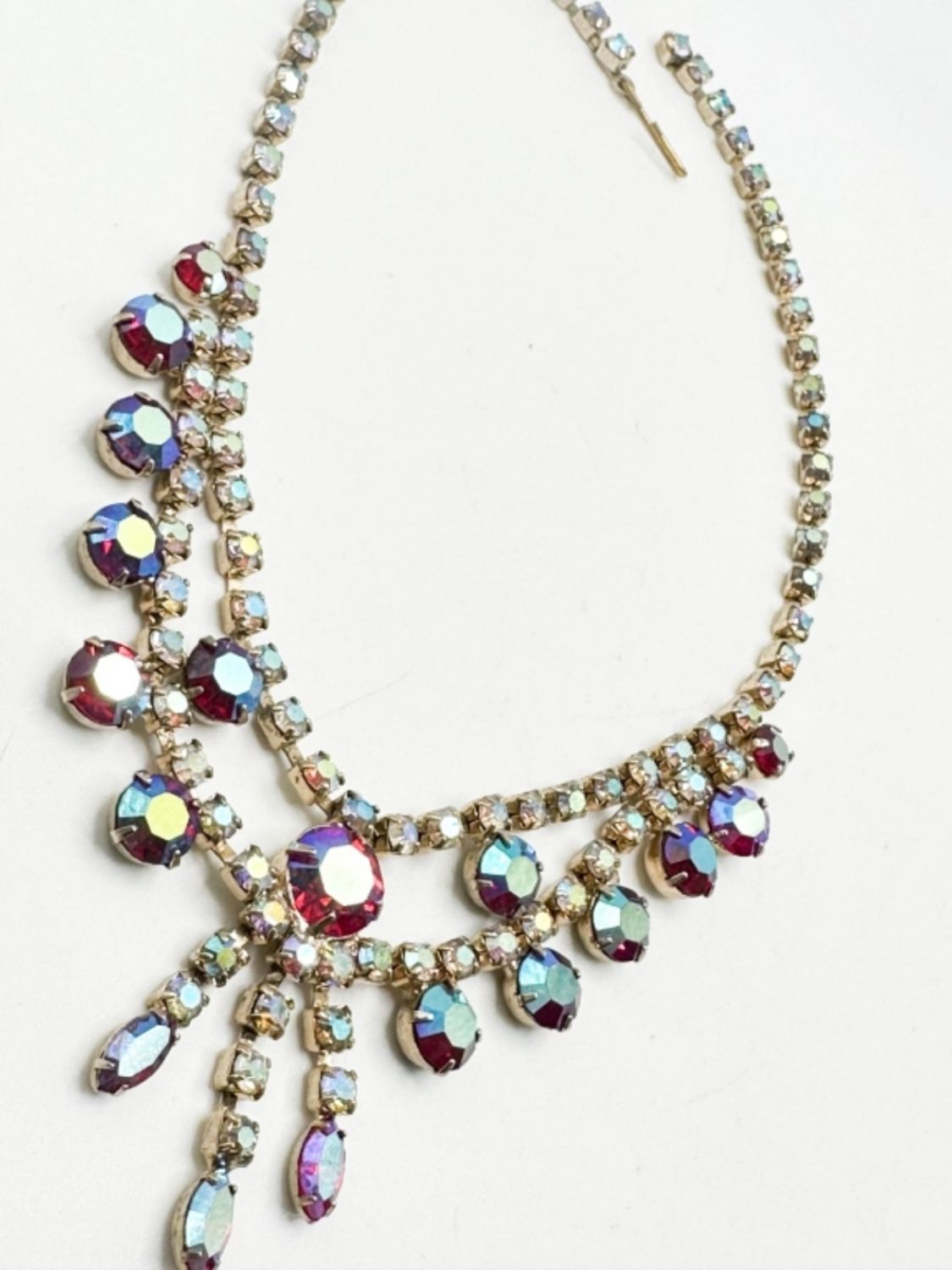 AMAZING AURORA BOREALIS NECKLACE WITIH TRIPLE DROP DANGLE, LARGE AND SMALL STONES INTERMIXED, SO PRETTY