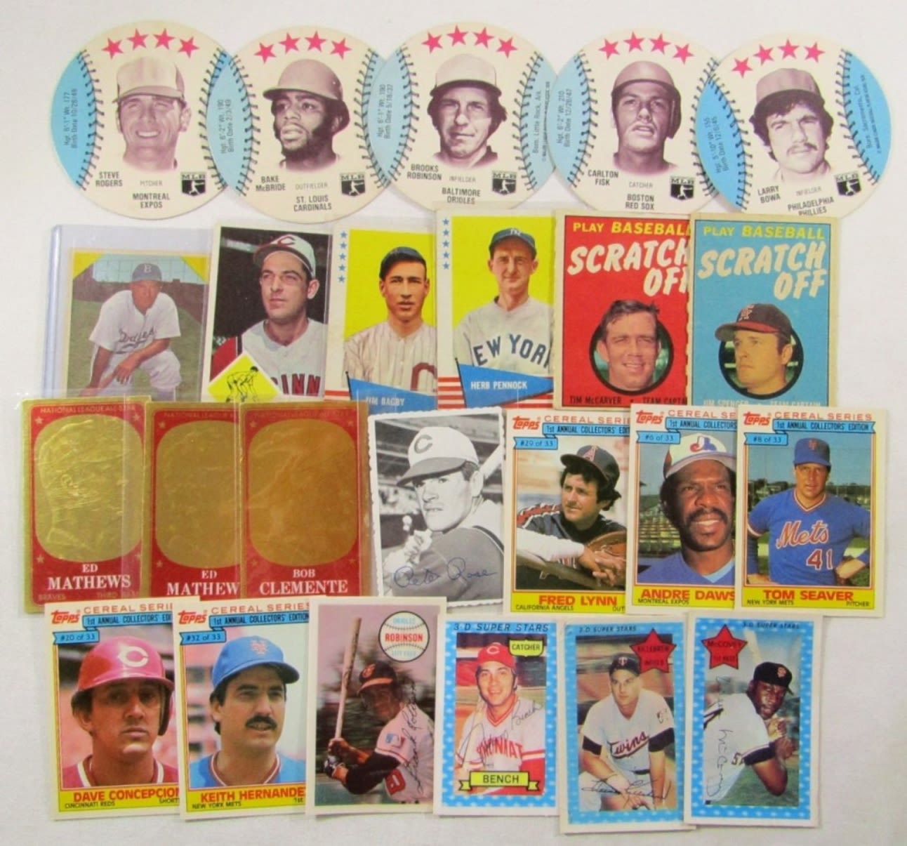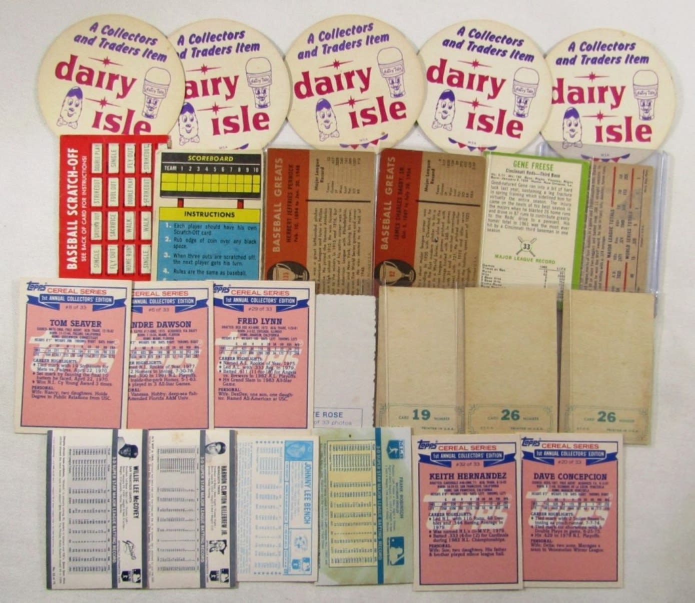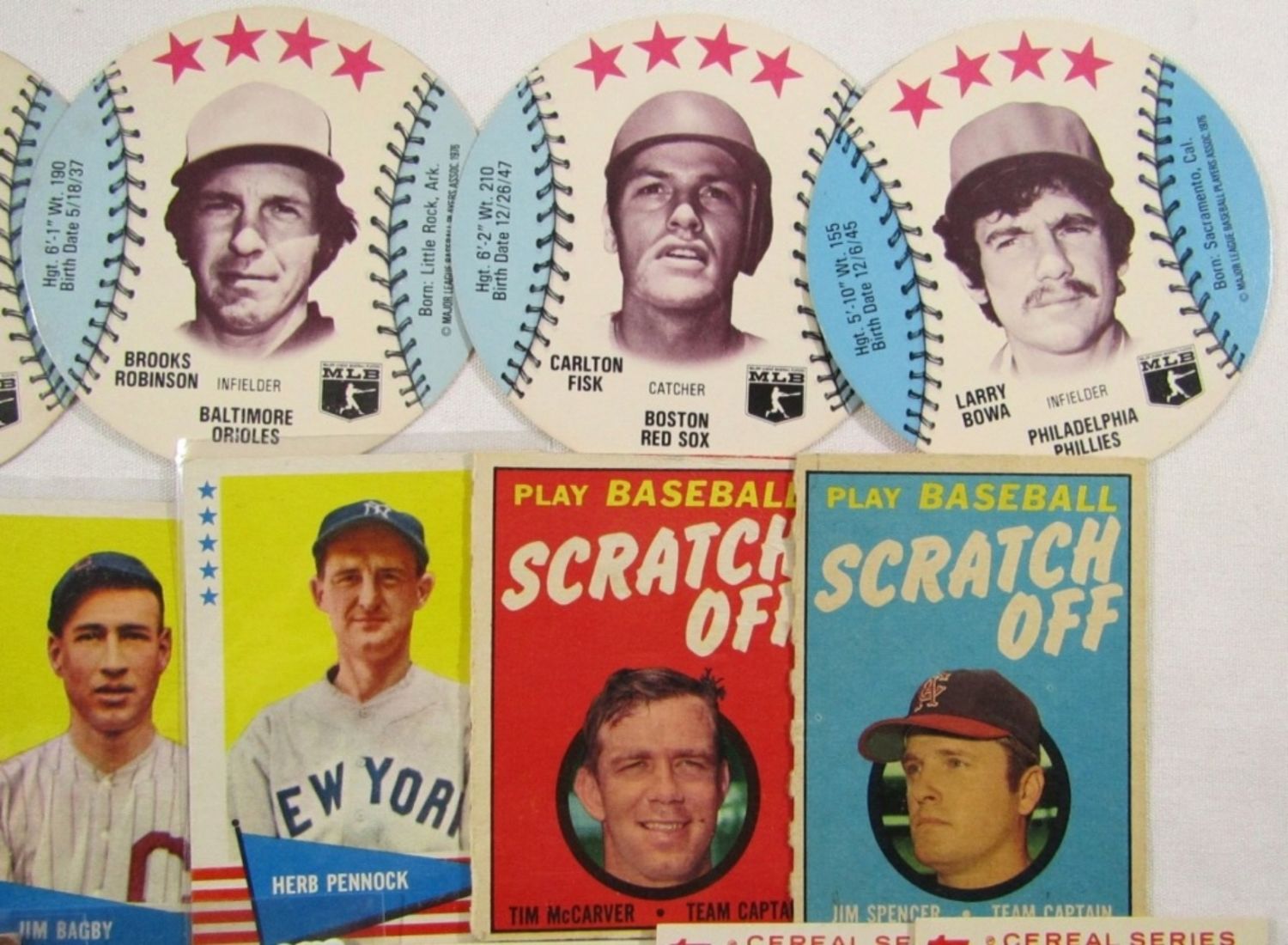 1969 TOPPS, SCRATCH OFFS, (5) DISC CARDS “DAIRY ISLE”, (4) 1970’s 3-D CARDS, (5) TOPPS CERIAL 1984, (4) FLEER 1960’s CARDS – FUN COLLECTORS LOT!