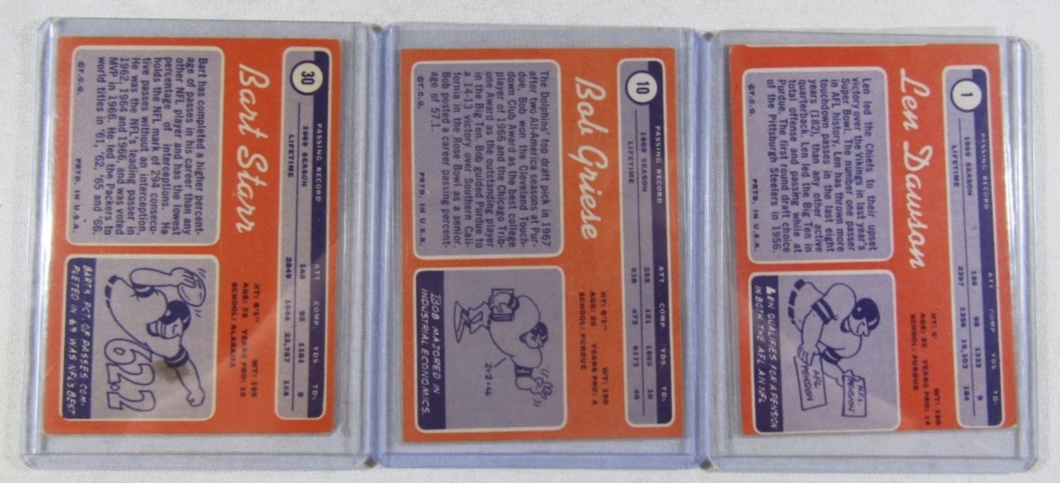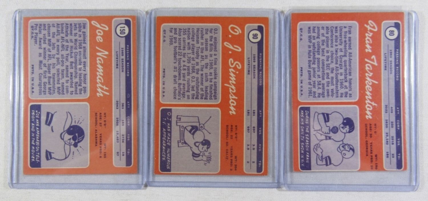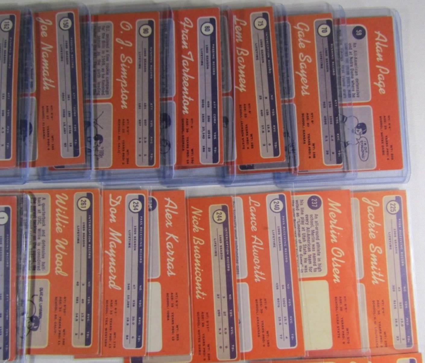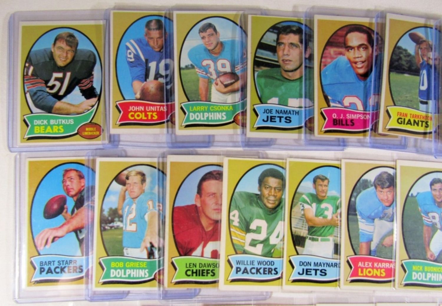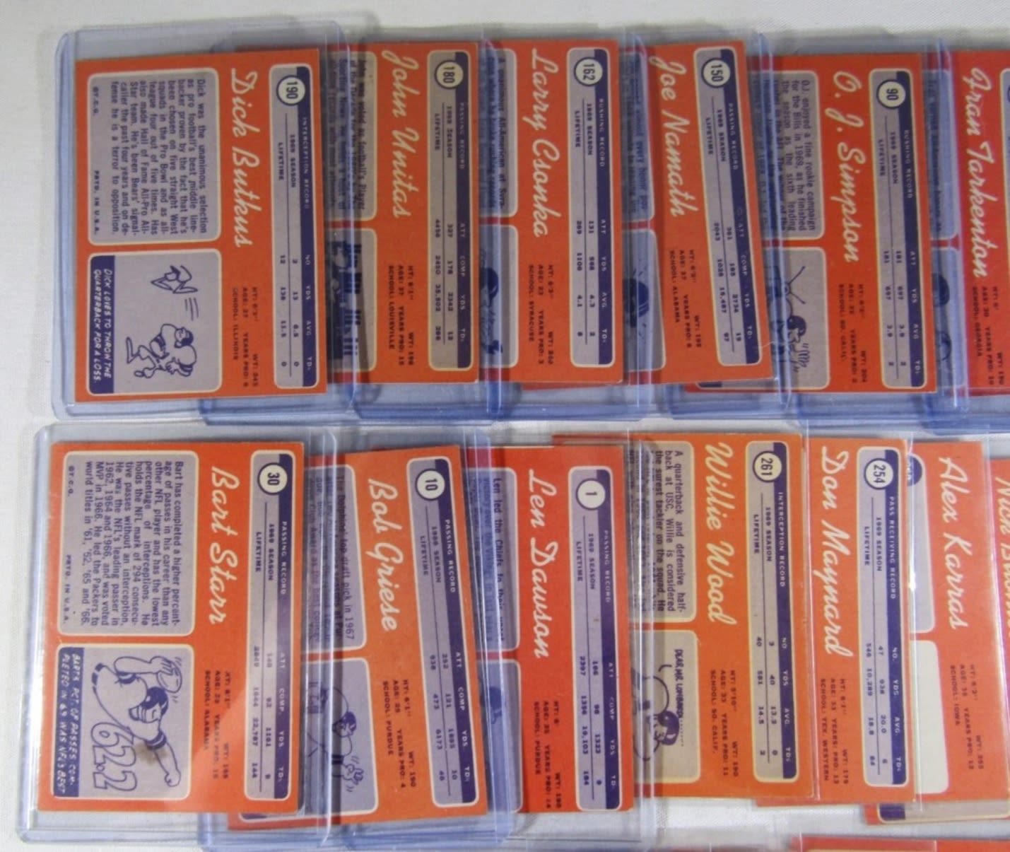 ALL DIFFERENT – VERY NICE EX++ , SOME EM , SOME VGEX+ – VERY CLEAN SURFACE – includes #1 DAWSON, 10 GRIESE, 30 STARR, 59 PAGE (R), 70 SAYERS, 75 BARNEY, 80 TARKENTON, 90 O.J. SIMPSON (R), 150 NAMATH, 162, CSONKA, 180