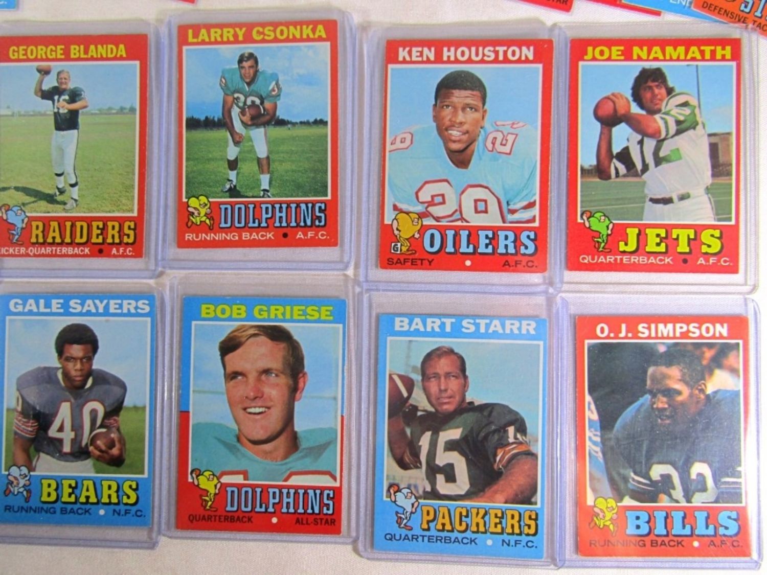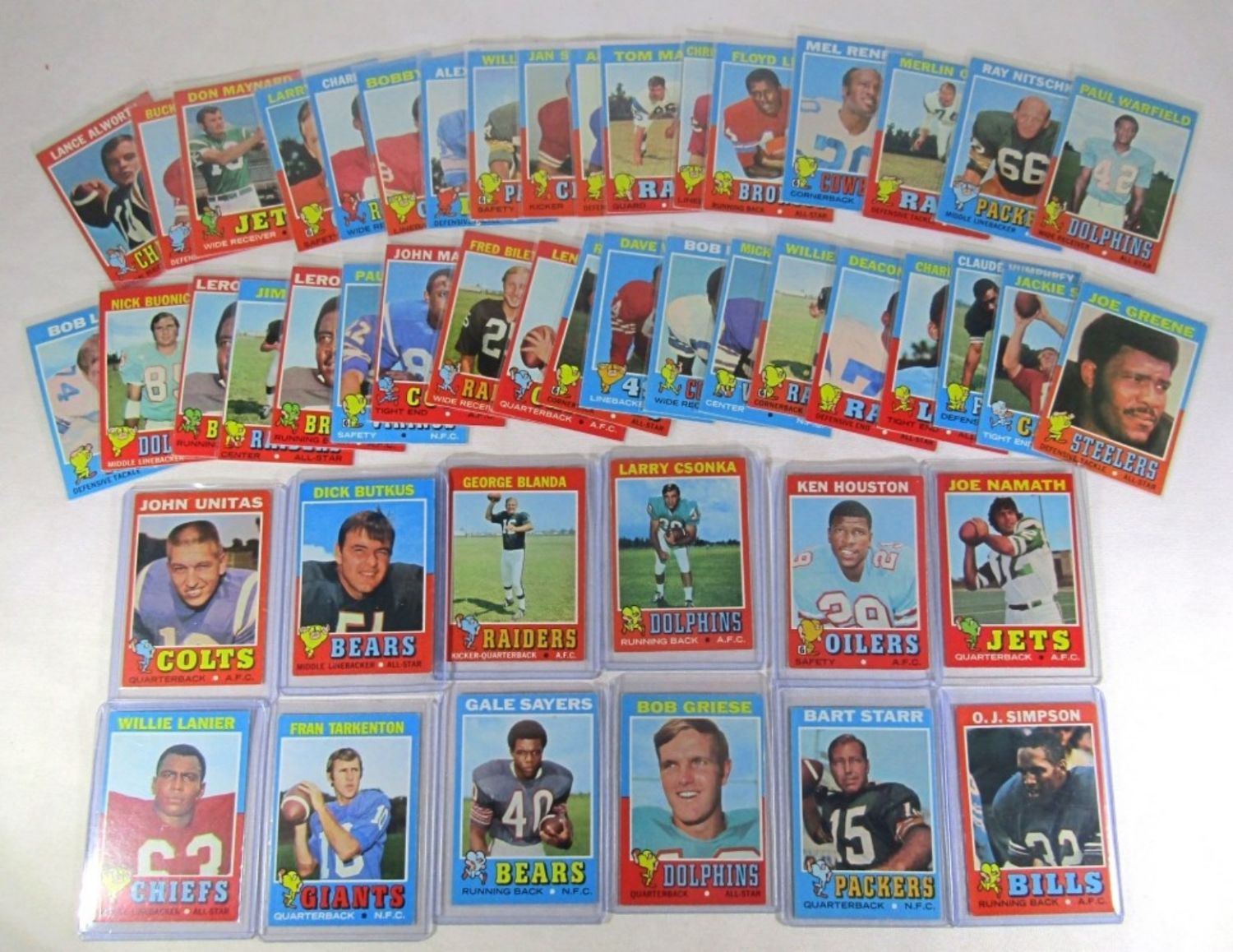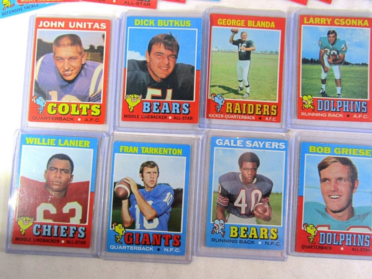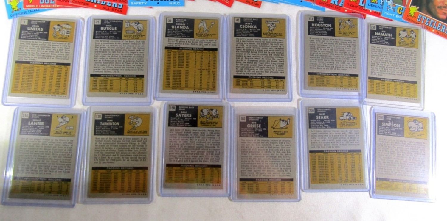 ALL DIFFERENT – VERY NICE EX-VGEX+, SOME EM, FEW VG+ includes #1 UNITAS, #25 BUTKUS, #39 BLANDA, #45 CSONKA, #113 HOUSTON, #114 LANIER, #120 TARKENTON, #150 SAYERS, #160 GRIESE, #200 STARR, #250 NAMATH, #260 SIMPSON