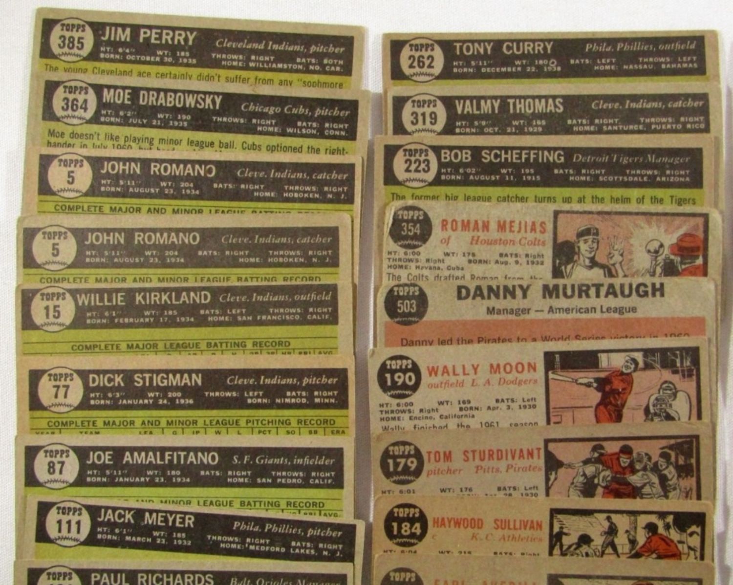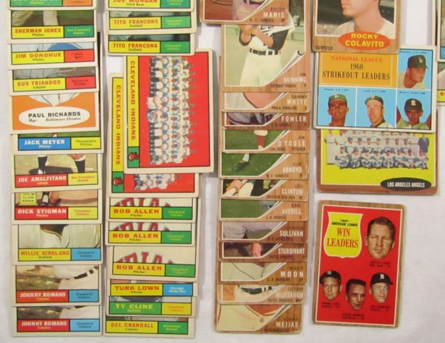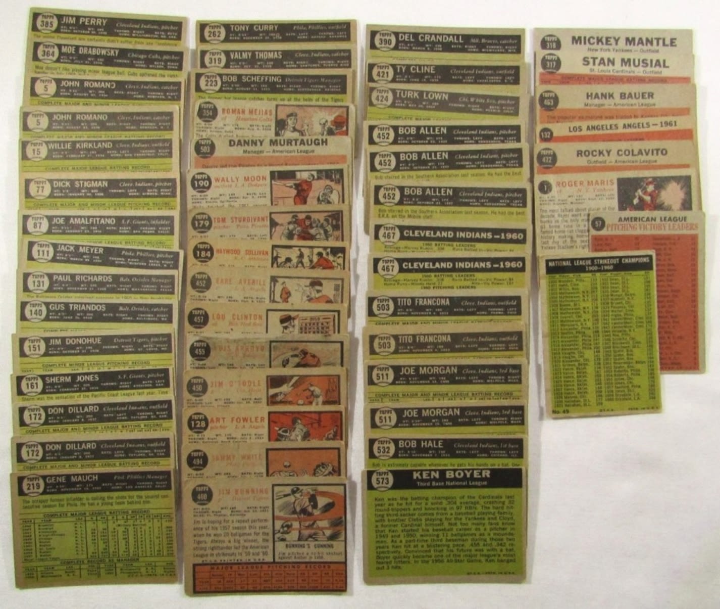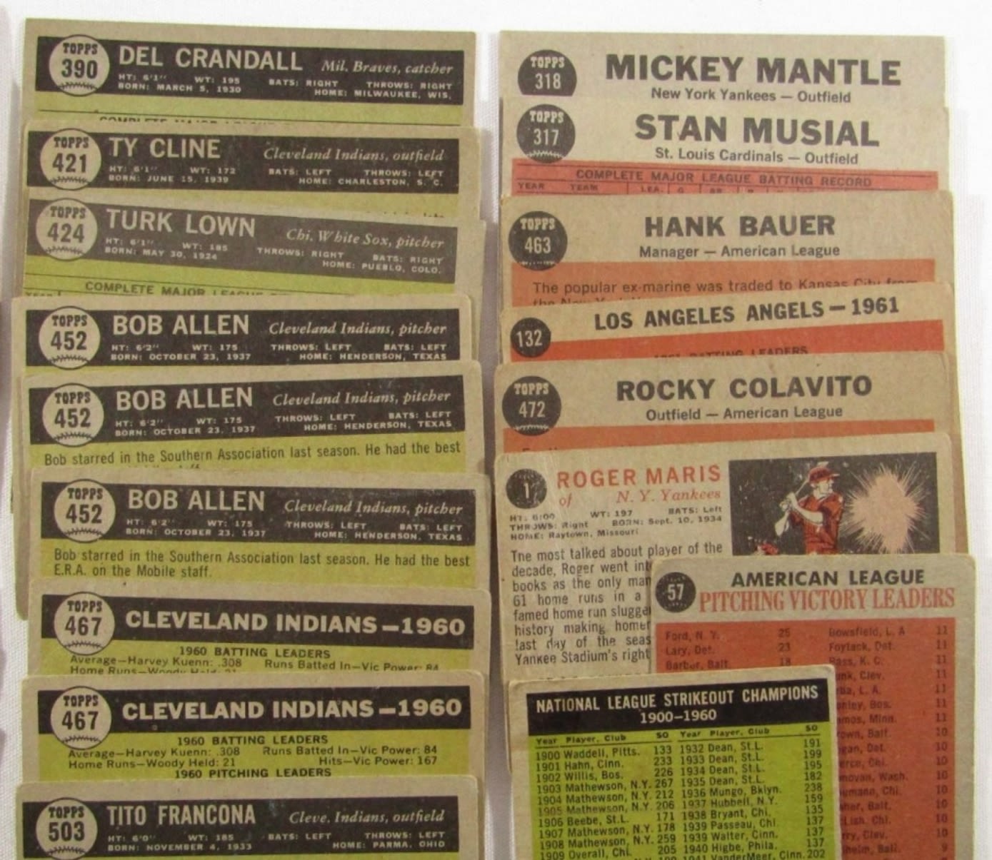 THIS LOT INCLUDES (33) 1961 TOPPS with 7 duplicates & #49 STRIKEOUT LDRS KOUFAX; (19) 1962 TOPPS with #1 ROGER MARIS FAIR/GOOD KEY CARD, # 318 MICKEY MANTLE SWITCH HITTERS VGEX, PLUS (5) STAR CARDS – OVERALL CONDITION