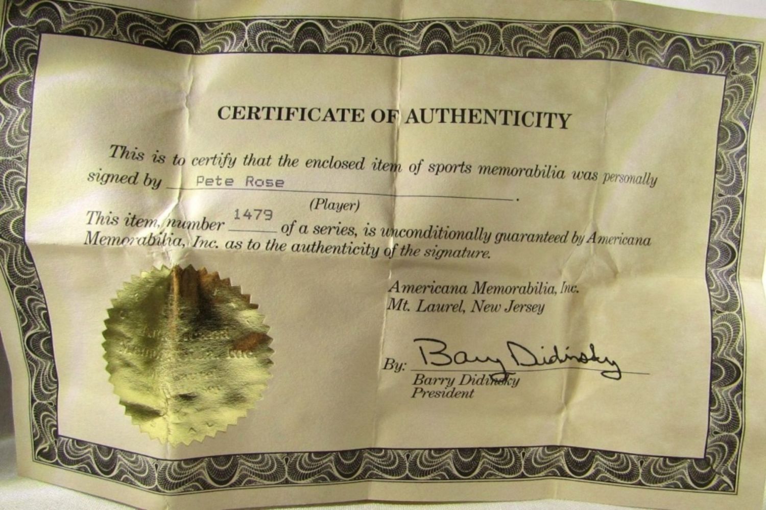 OFFICIAL BALL NATIONAL LEAGUE – COA by AMERICANA MEMORABILIA INC