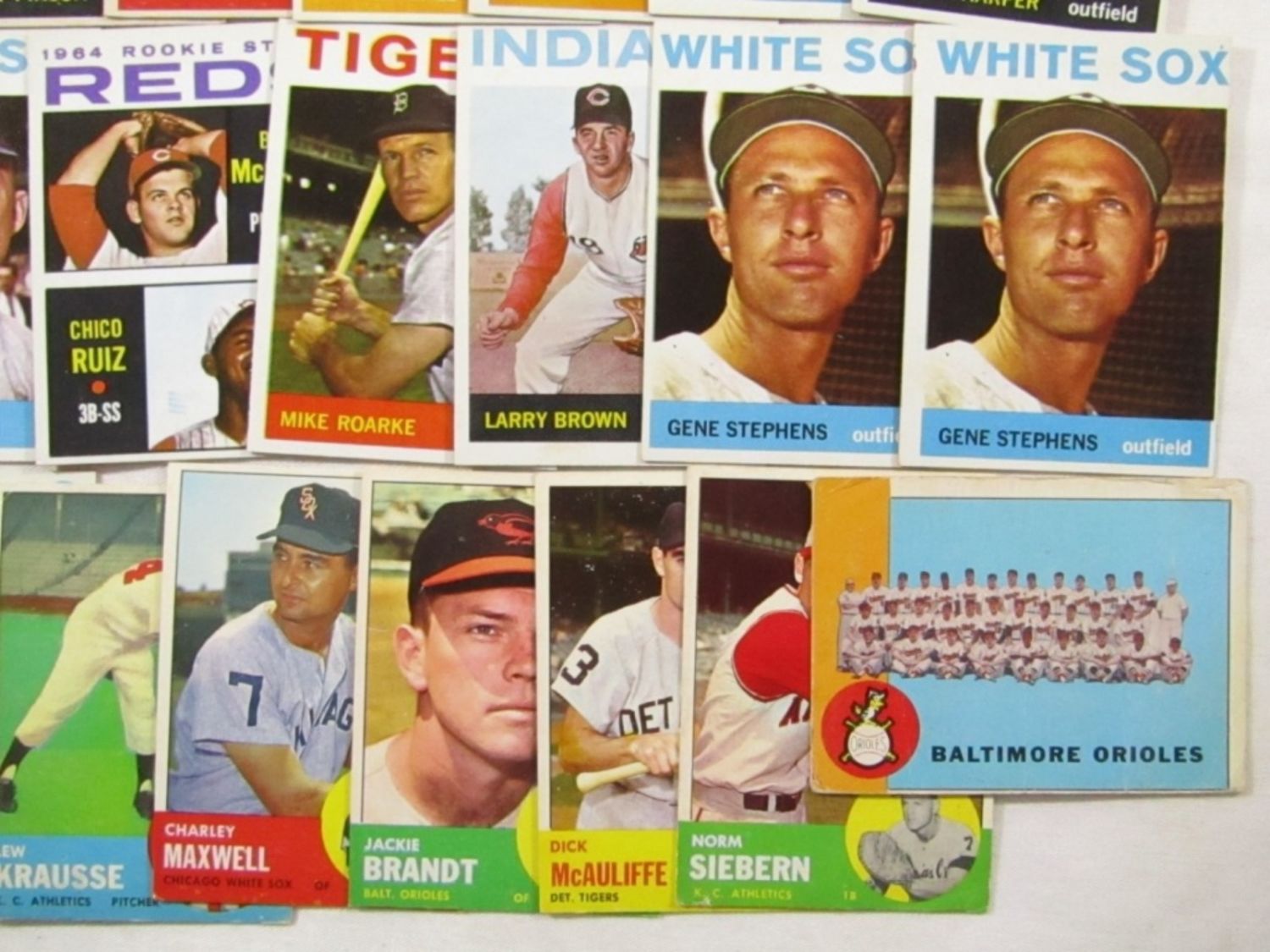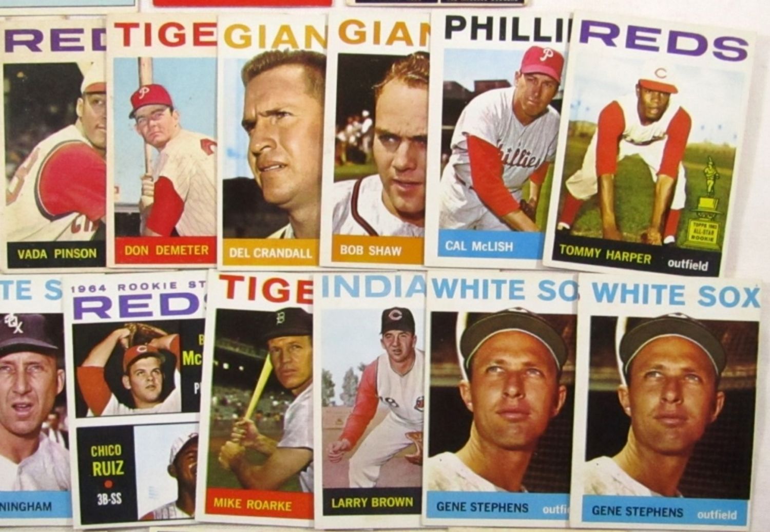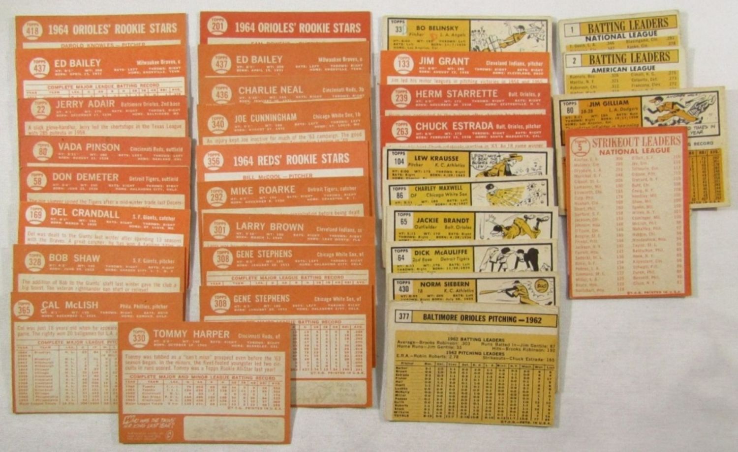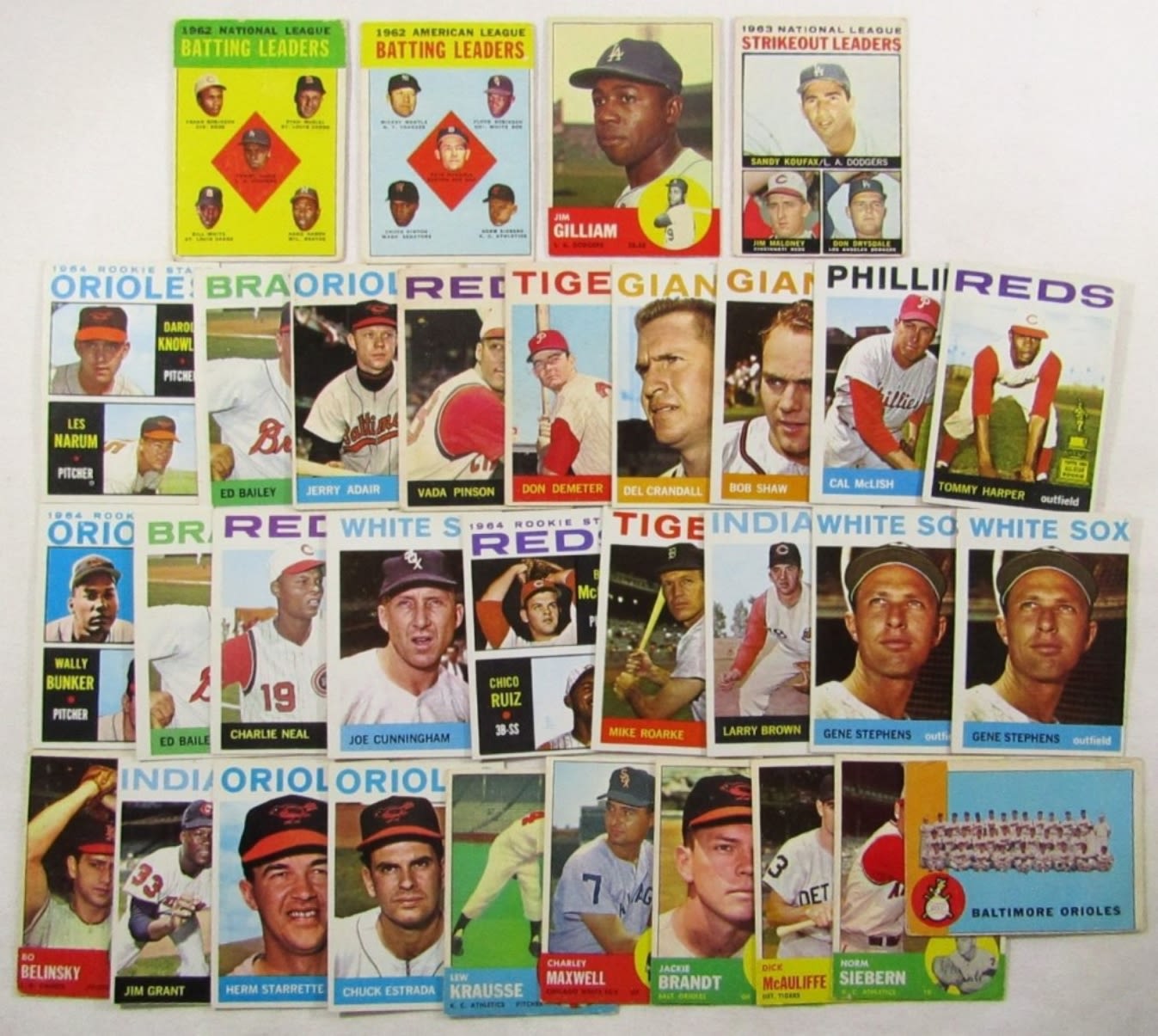 THIS LOT INCLUDES (10) 1963 TOPPS with #1 AARON LDRS VG & #2 MANTLE LDRS VG+; (22) 1964 TOPPS with #5 KOUFAX LDRS VGEX – OVERALL 1963’s VG/VGEX – 1964’s EX