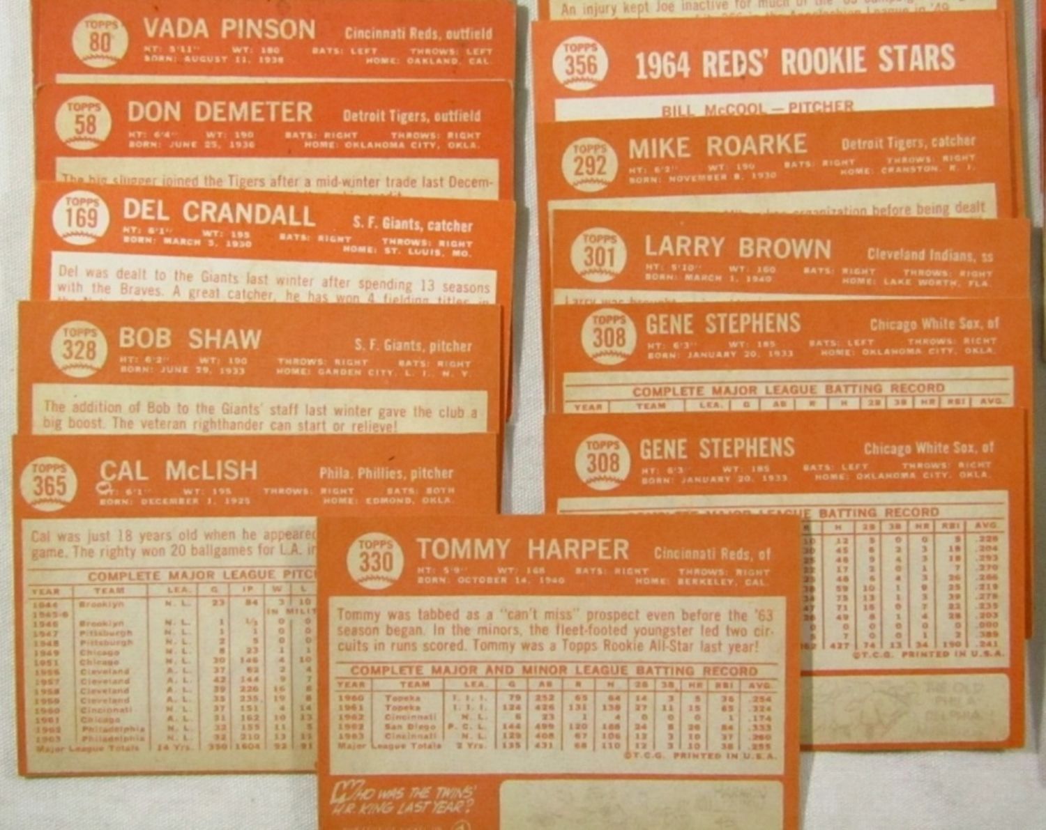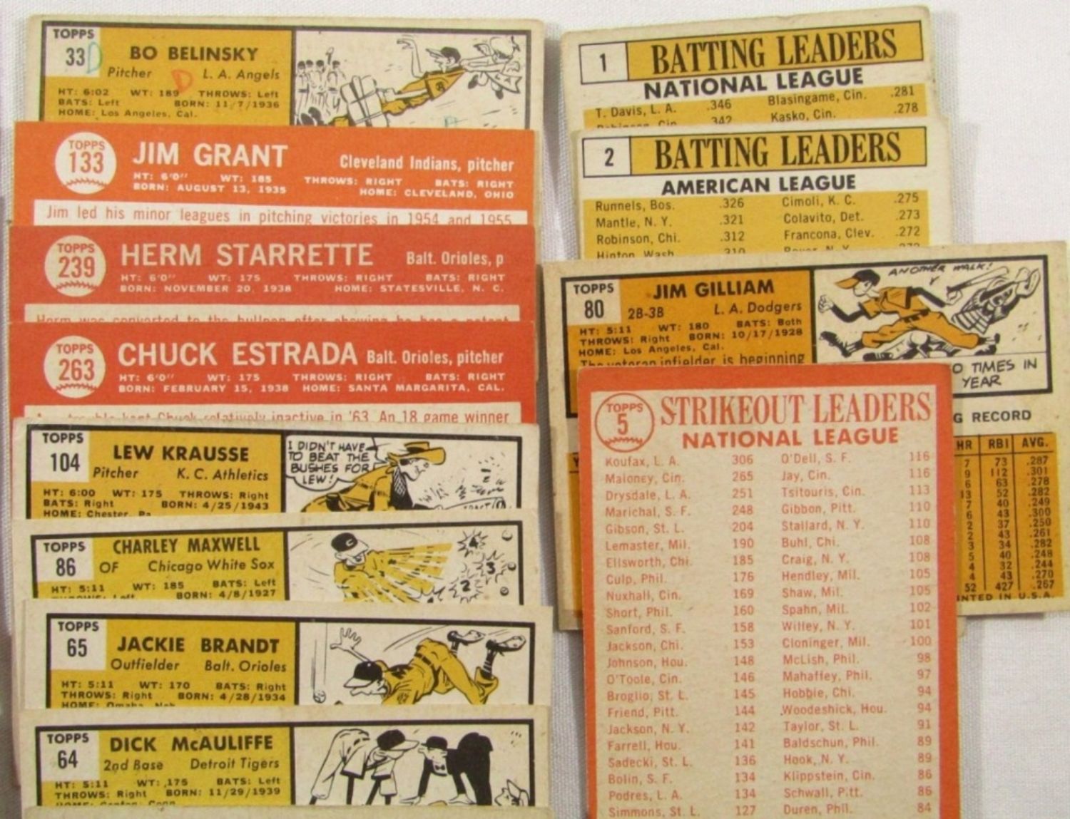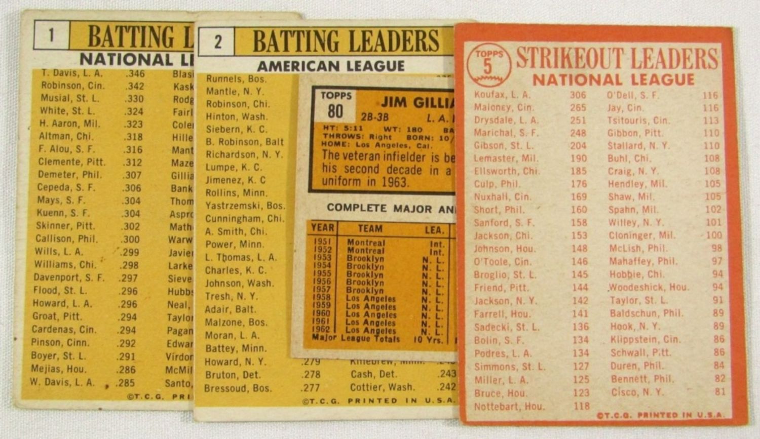 THIS LOT INCLUDES (10) 1963 TOPPS with #1 AARON LDRS VG & #2 MANTLE LDRS VG+; (22) 1964 TOPPS with #5 KOUFAX LDRS VGEX – OVERALL 1963’s VG/VGEX – 1964’s EX