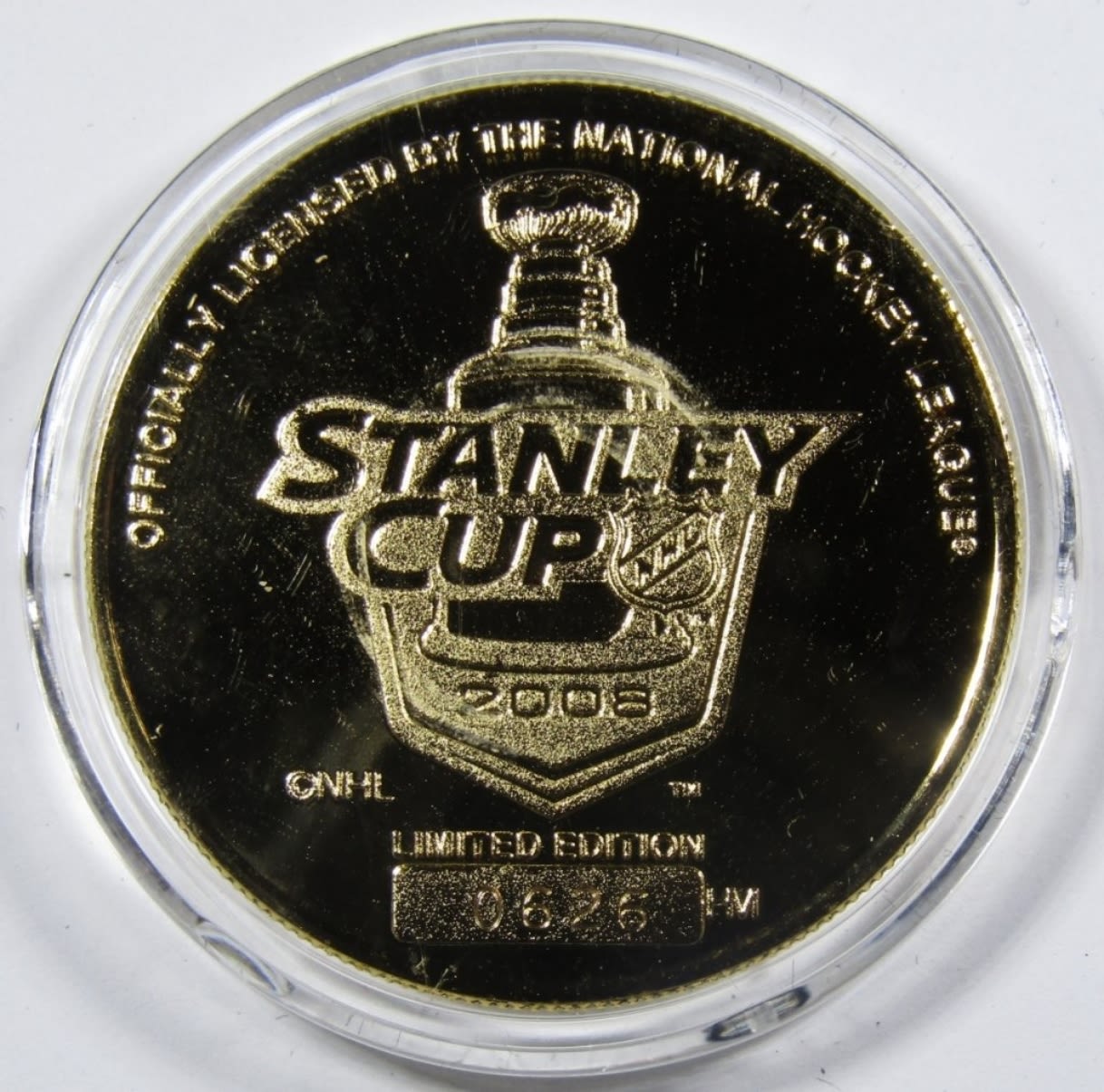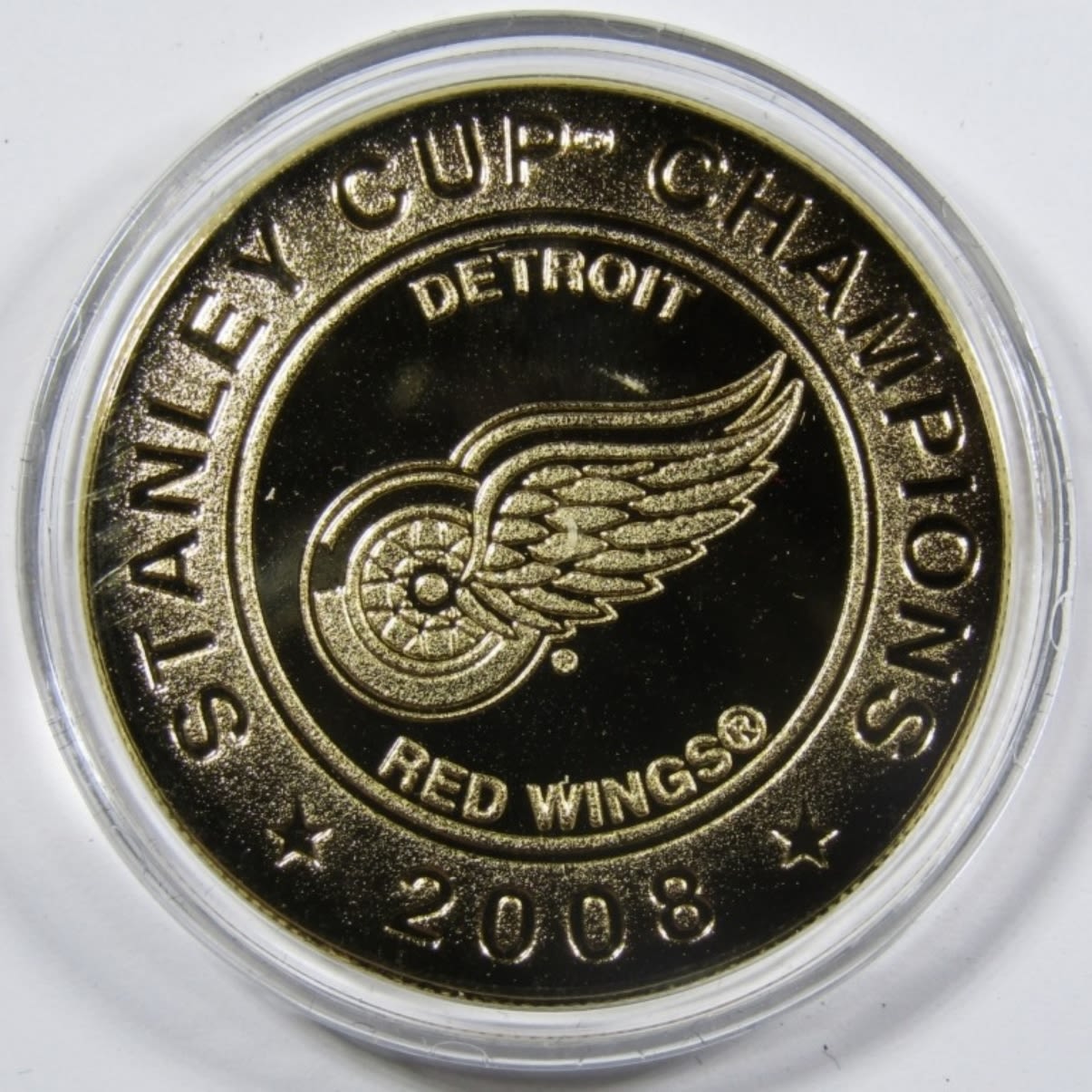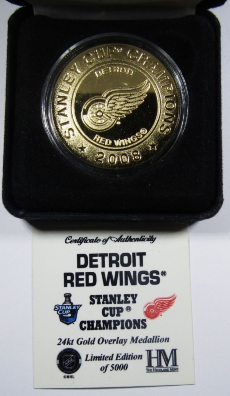 DETROIT RED WINGS STANLEY CUP CHAMPIONS 24k GOLD OVERLAY MEDALLION. THE HIGHLAND MINT, IN VELVET BOX WITH COA