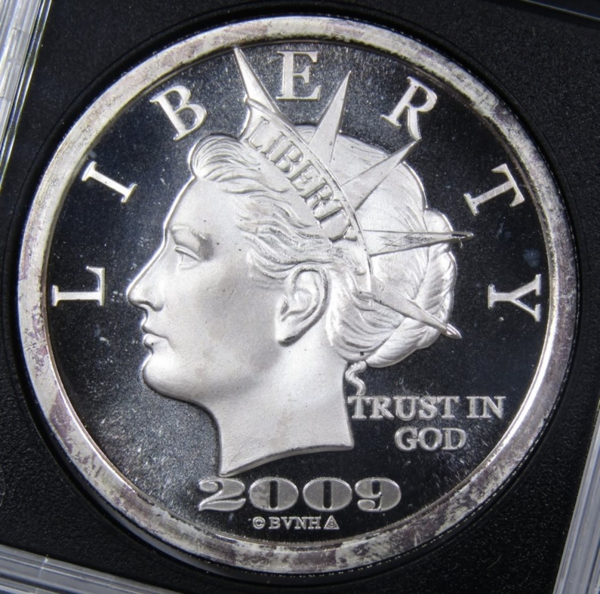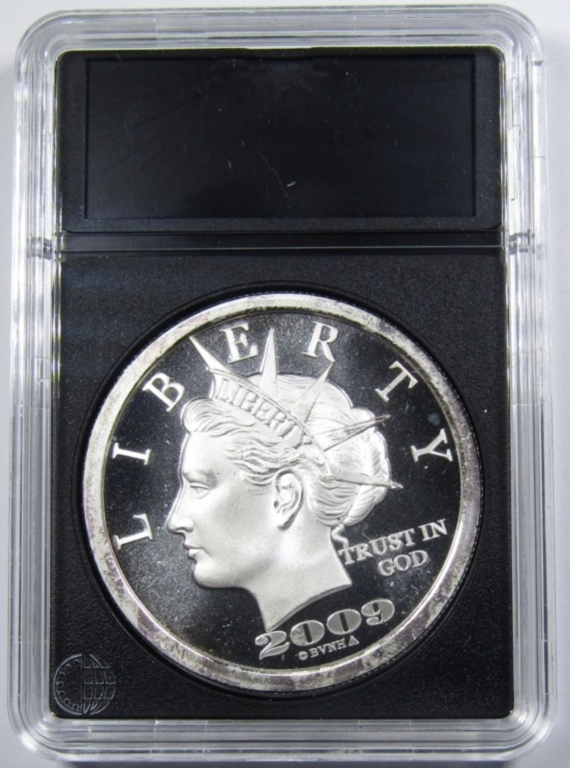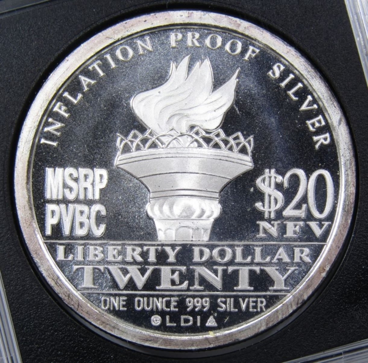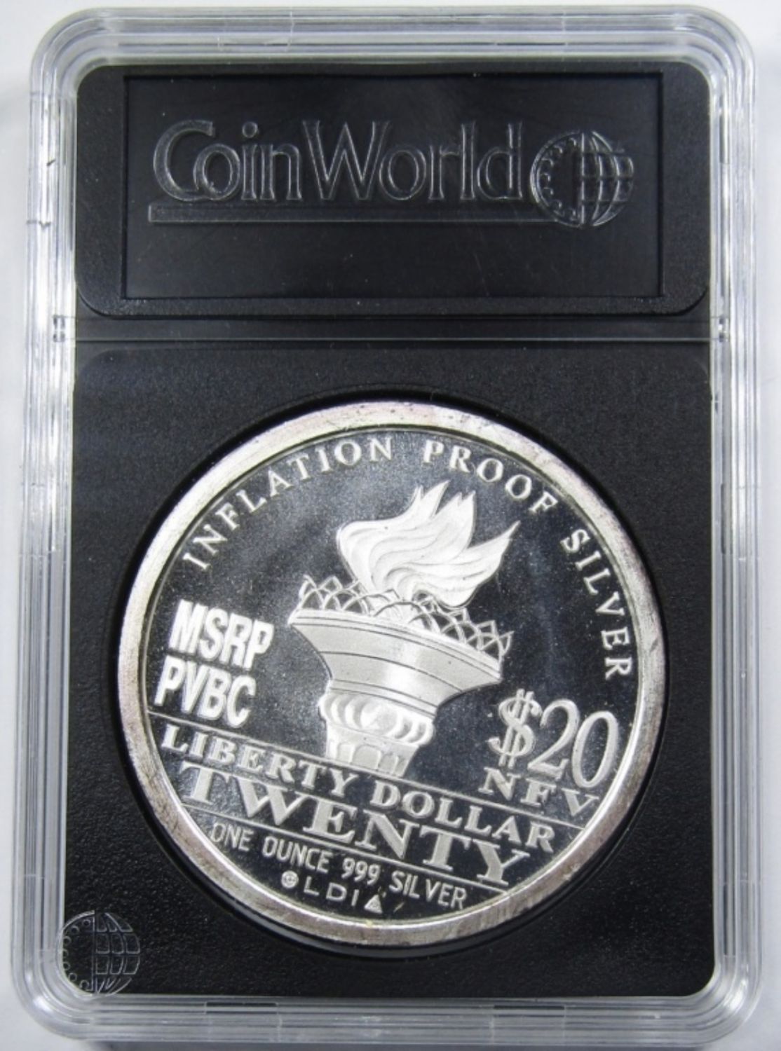 “$20 LIBERTY DOLLAR” SILVER ROUND IN PLASTIC SLAB.