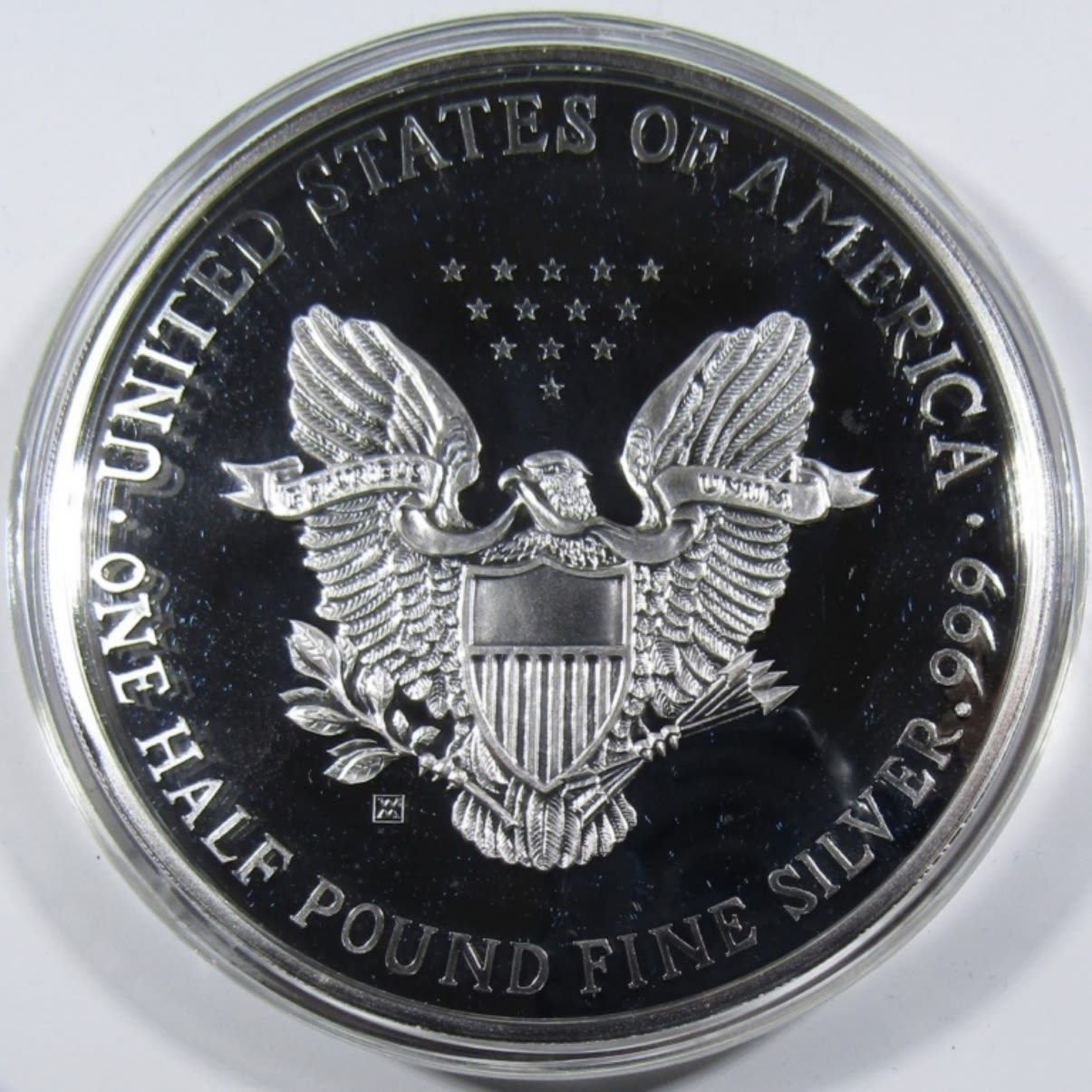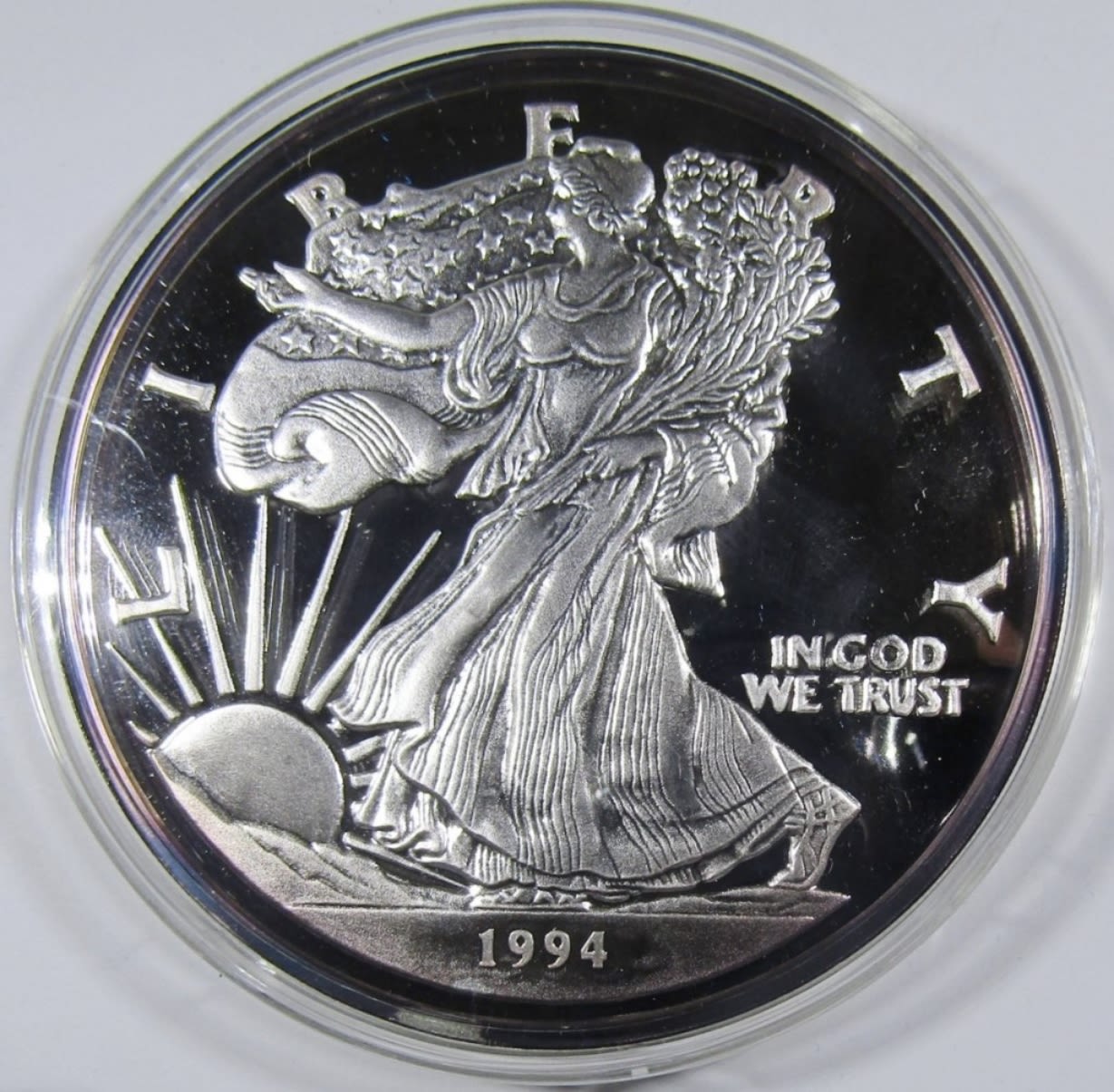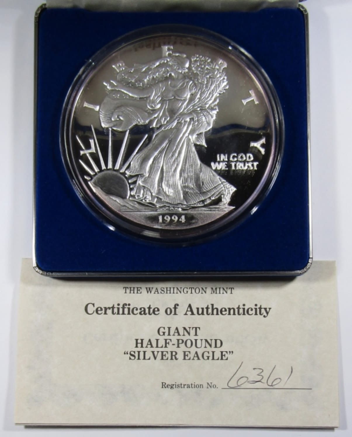 8 TROY OZ SILVER PROOF REPLICA OF 1994 SILVER EAGLE, IN VELVET BOX WITH COA. WASHINGTON MINT.