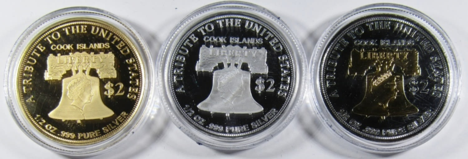 (3) 1/2 oz .999 SILVER COINS (1.5oz TOTAL). A TRIBUTE TO THE UNITED STATES. IN VELVET BOX. NO COA