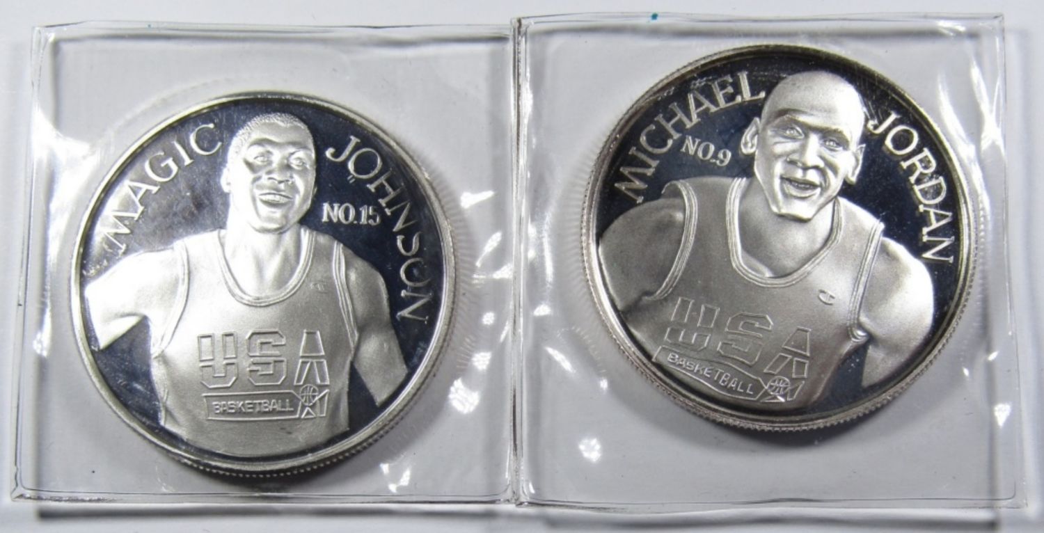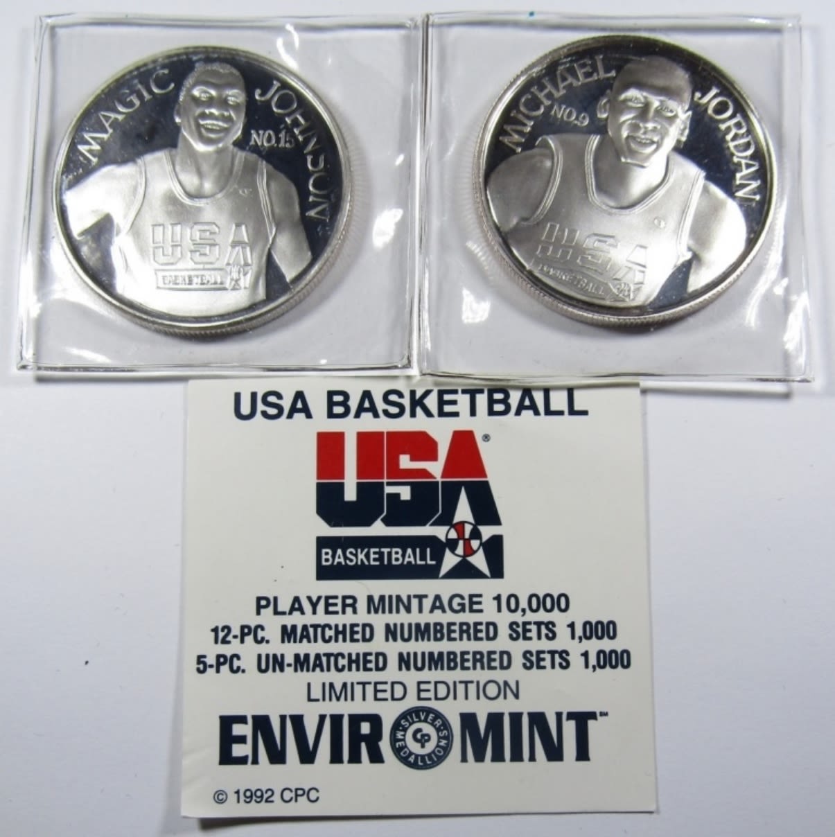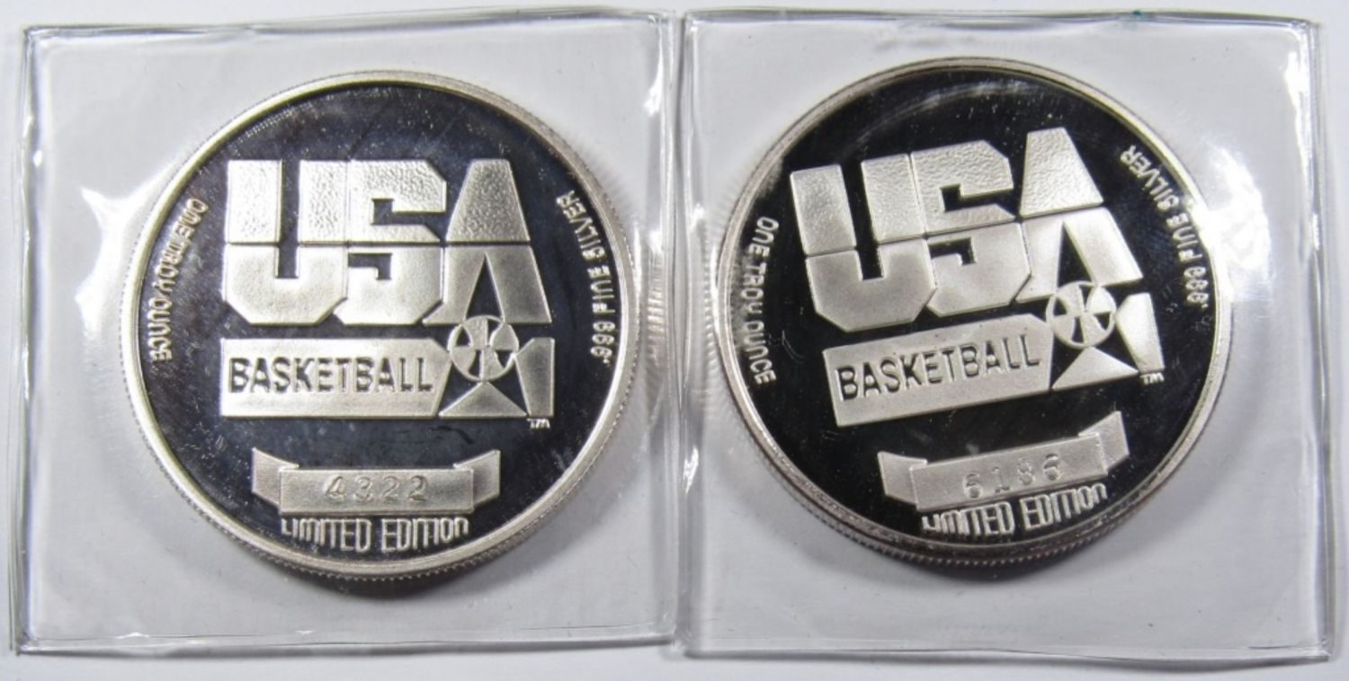 (2) 1oz .999 SILVER MEDALLIONS. USA BASKETBALL, SEALED IN PLASTIC WITH SINGLE COA. ENVIROMINT.