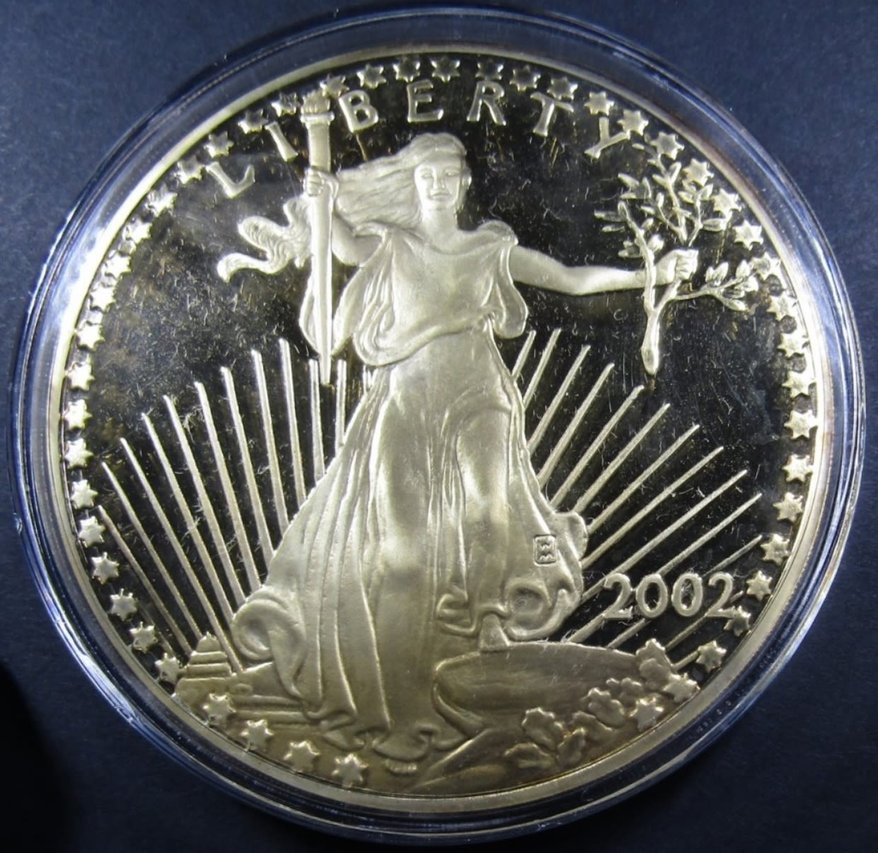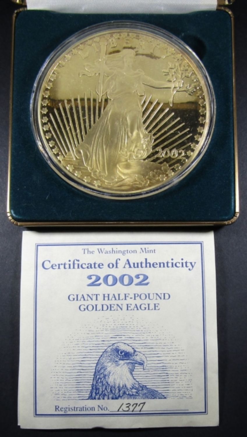 8 TROY OZ SILVER LAYERED WITH 24K GOLD PROOF REPLICA OF 2002 GOLDEN EAGLE, IN VELVET BOX WITH COA. WASHINGTON MINT.