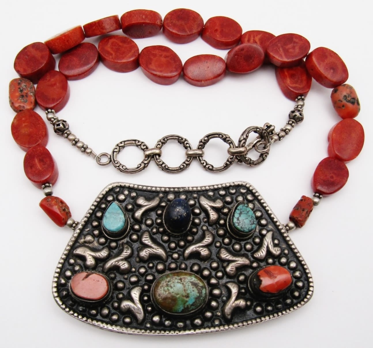 NECKLACE WITH STERLING PENDANT WITH TURQUOISE RED CORAL AND JASPER BEAD ACCENTS-STERLING CLASP-MEASURES 24 INCHES-TOTAL 74 DWT