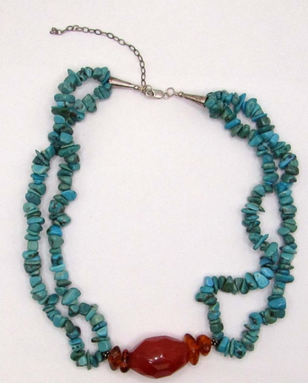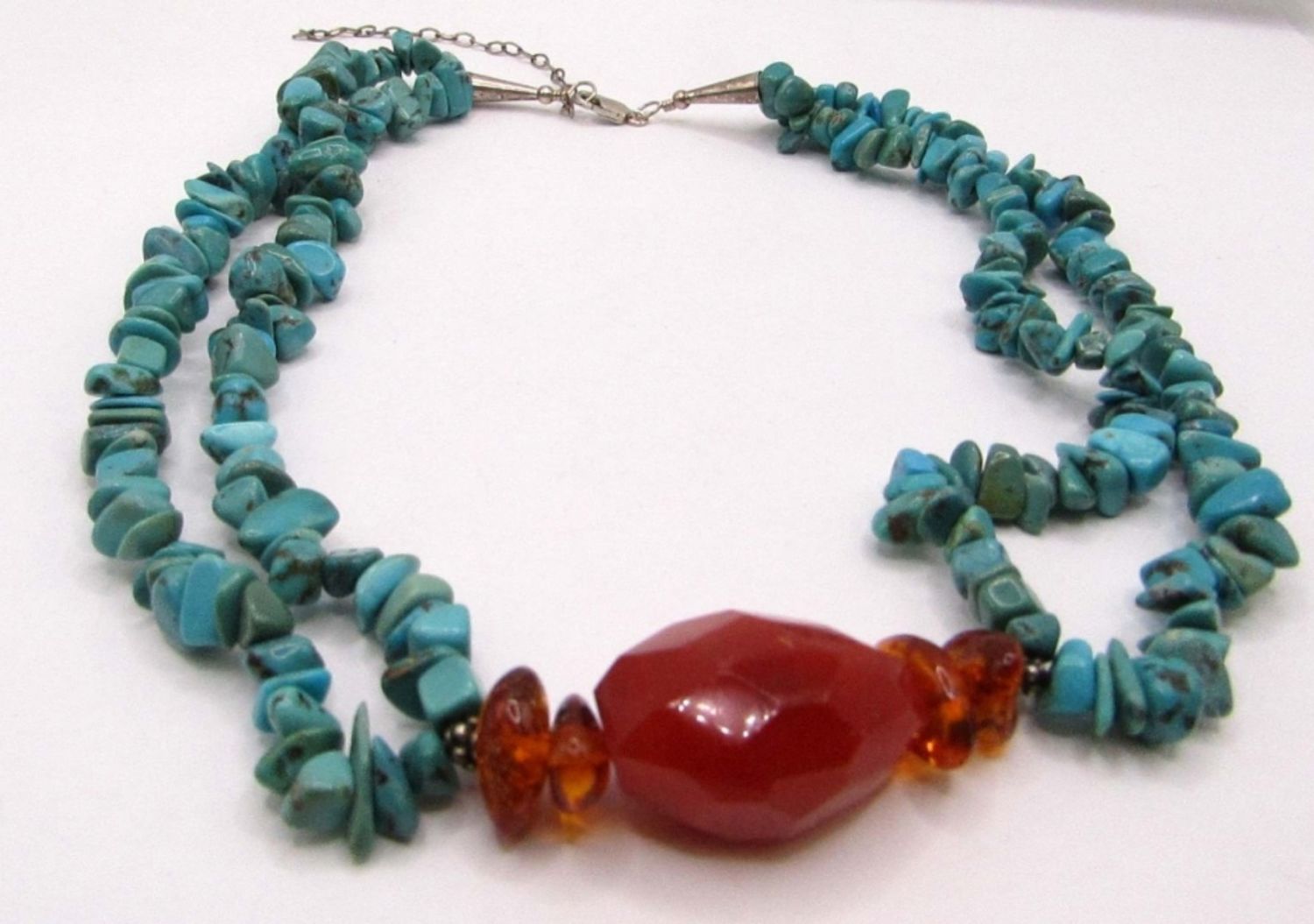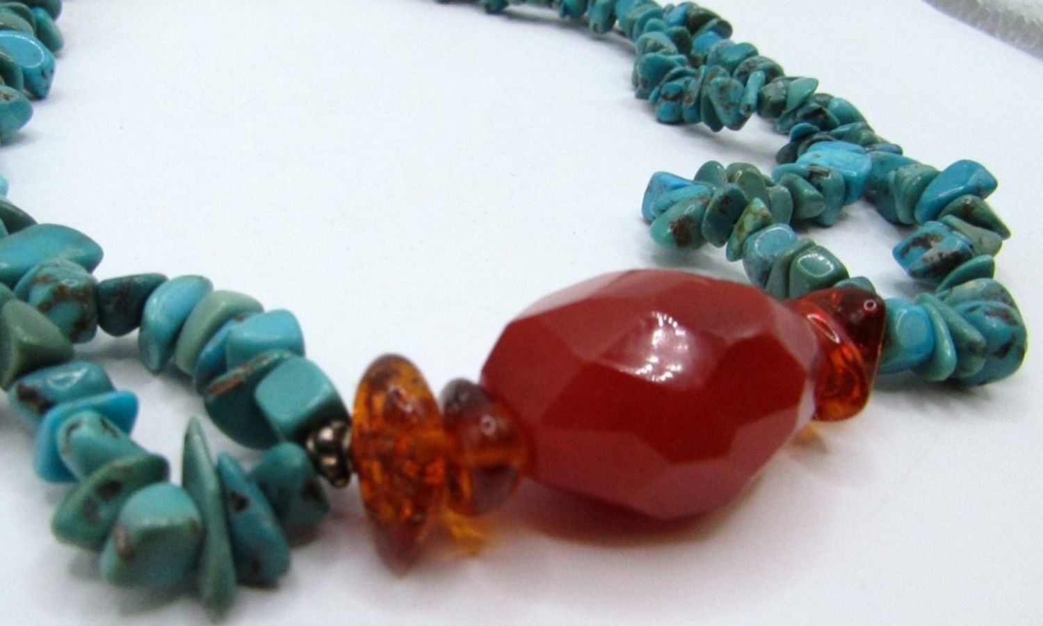 BEADED NECKLACE WITH LARGE AMBER STONE PENDANT-MEASURES 20.5 INCHES-TOTAL 37 DWT