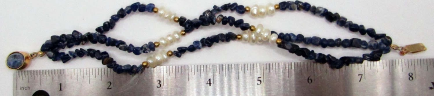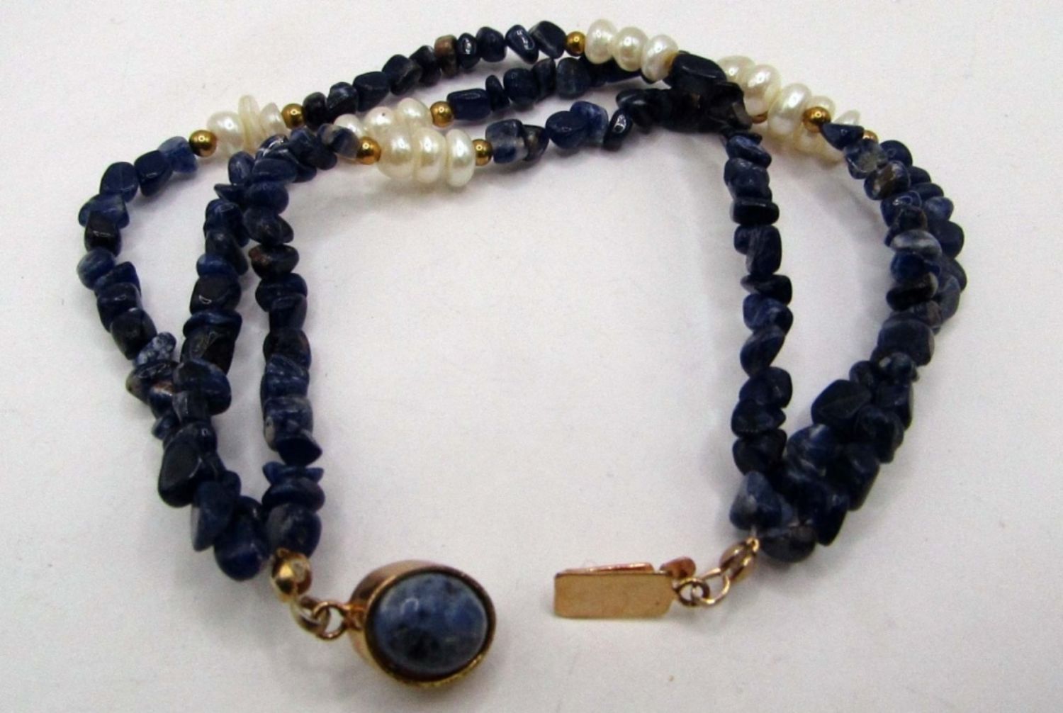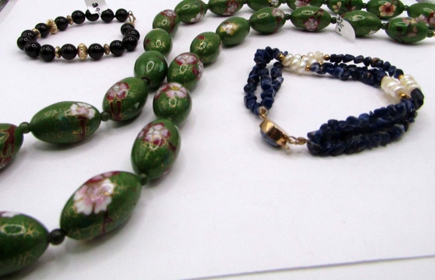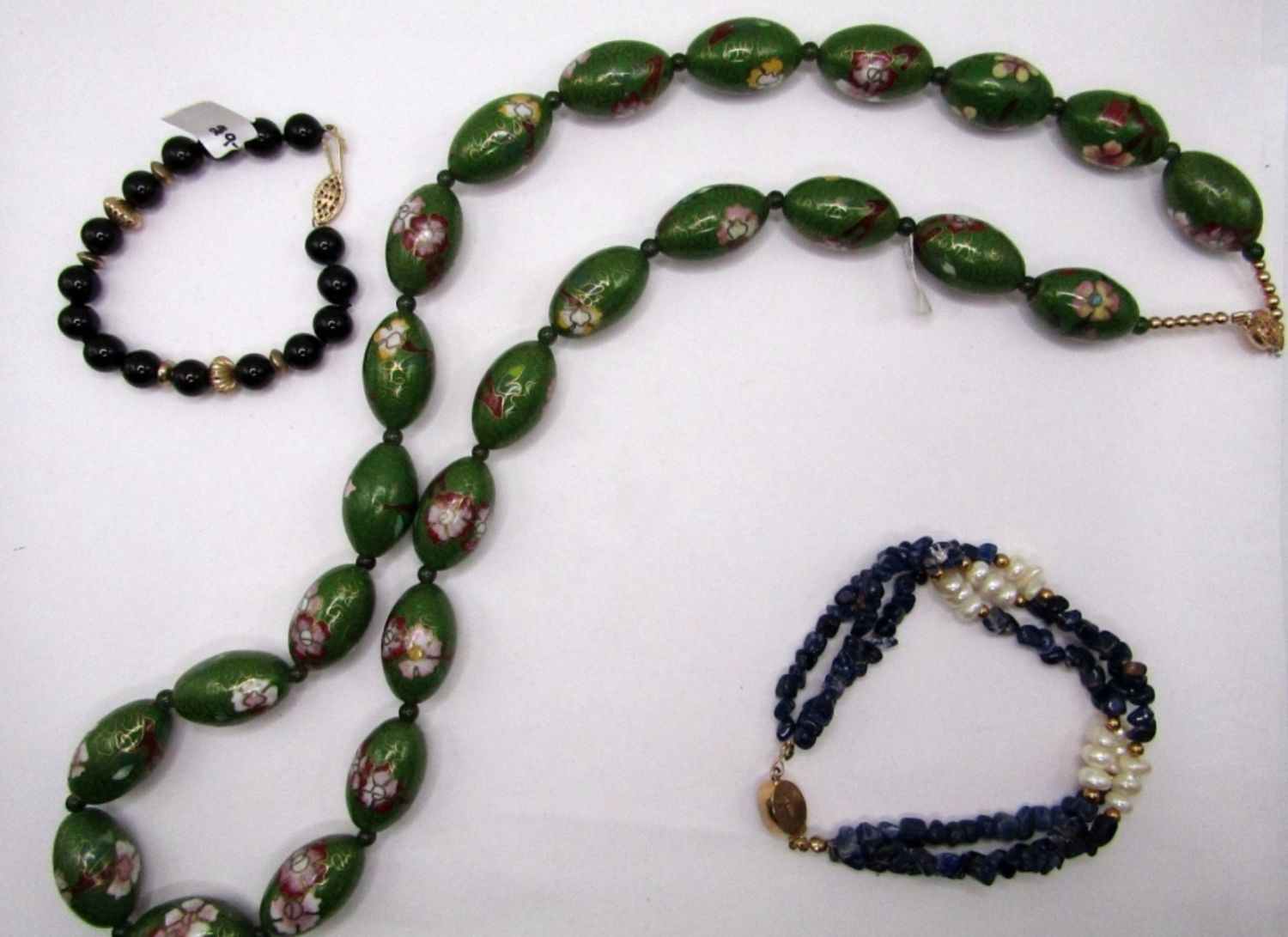 ALL WITH 14K BEADS AND CLASPS. CULTURE PEARLS & DUMORTIERITE, HAND PAINTED BEADS, AND BLACK AND GOLD BEADS.