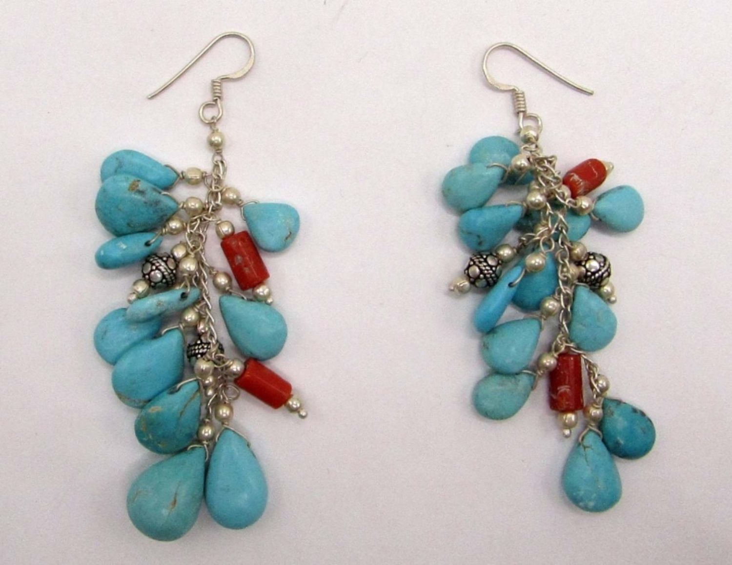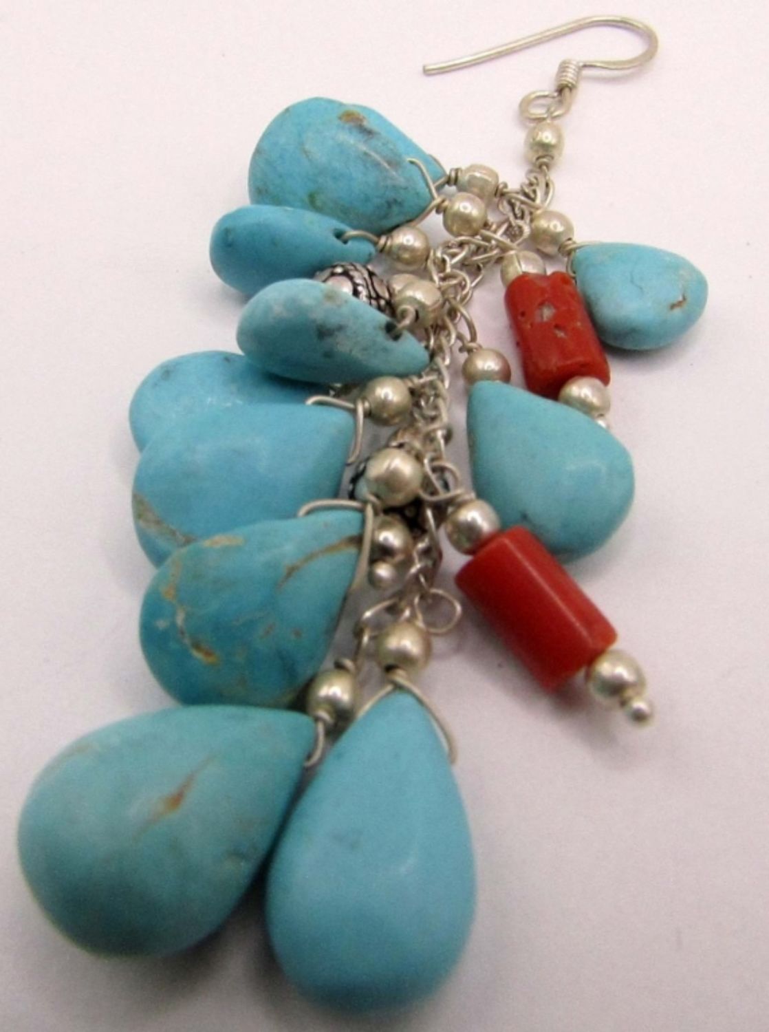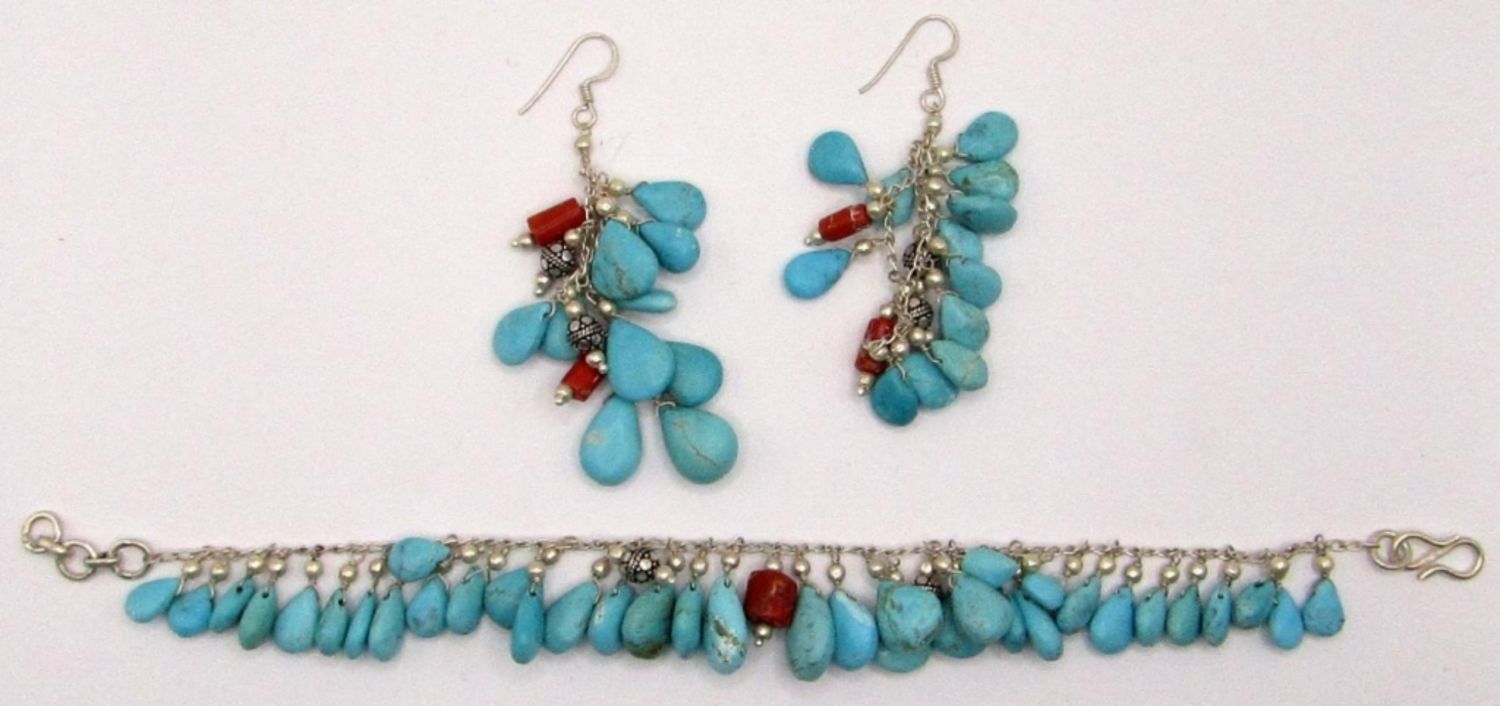 TURQUOISE BEAD CHARMS & RED CORAL ACCENTS WITH MATCHING PAIR OF PIERCED DANGLY EARRINGS-BRACELET MEASURES 8.5 INCHES