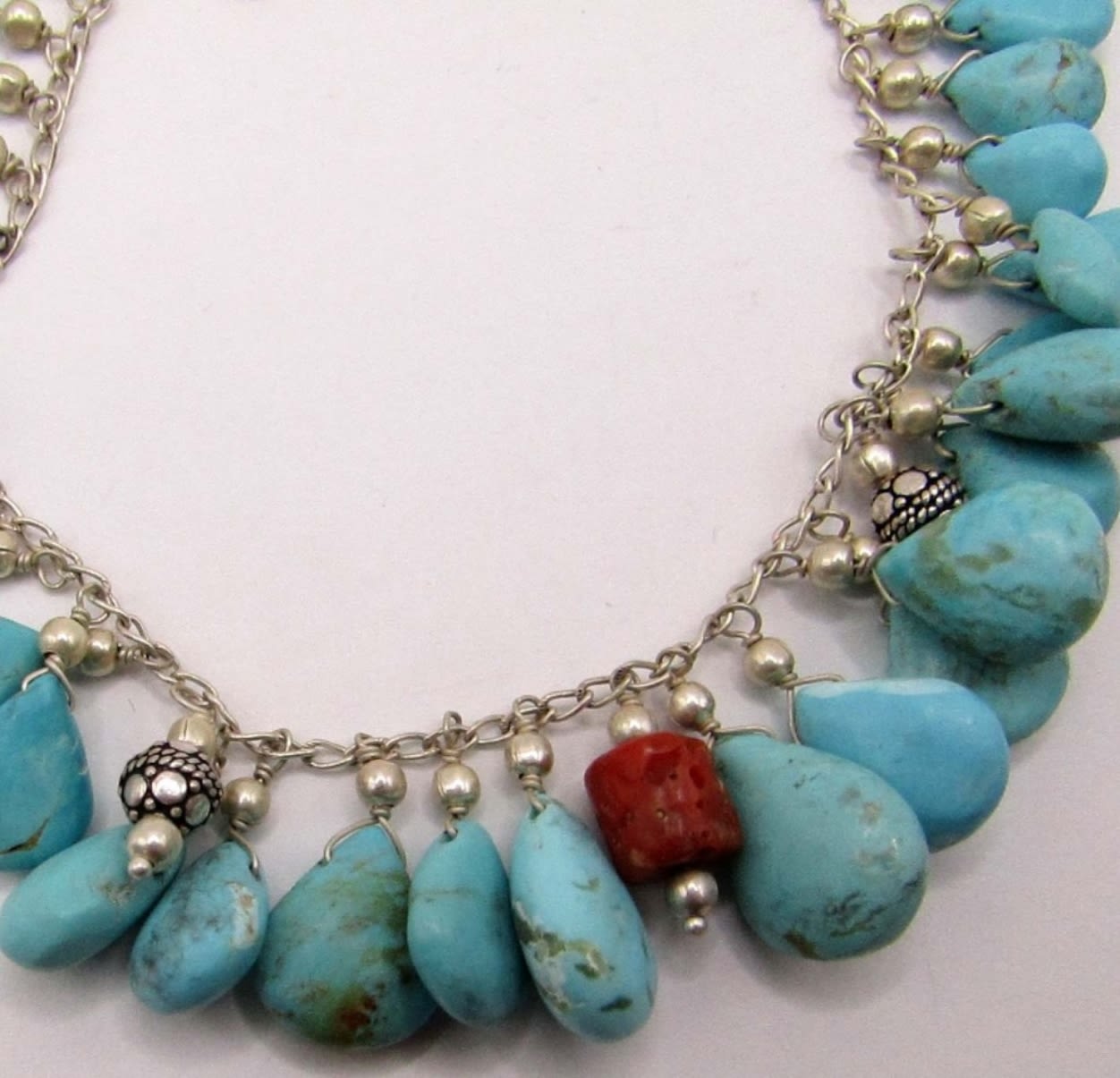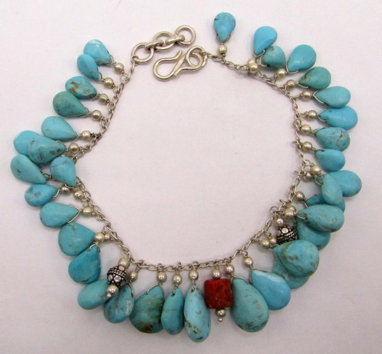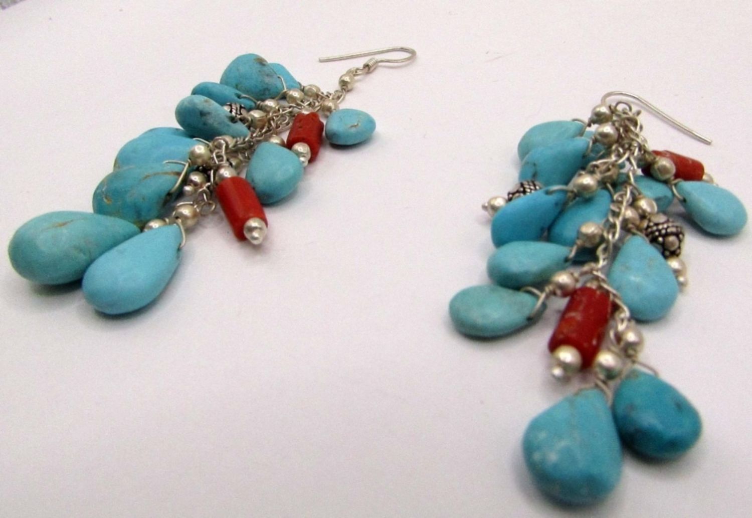 TURQUOISE BEAD CHARMS & RED CORAL ACCENTS WITH MATCHING PAIR OF PIERCED DANGLY EARRINGS-BRACELET MEASURES 8.5 INCHES