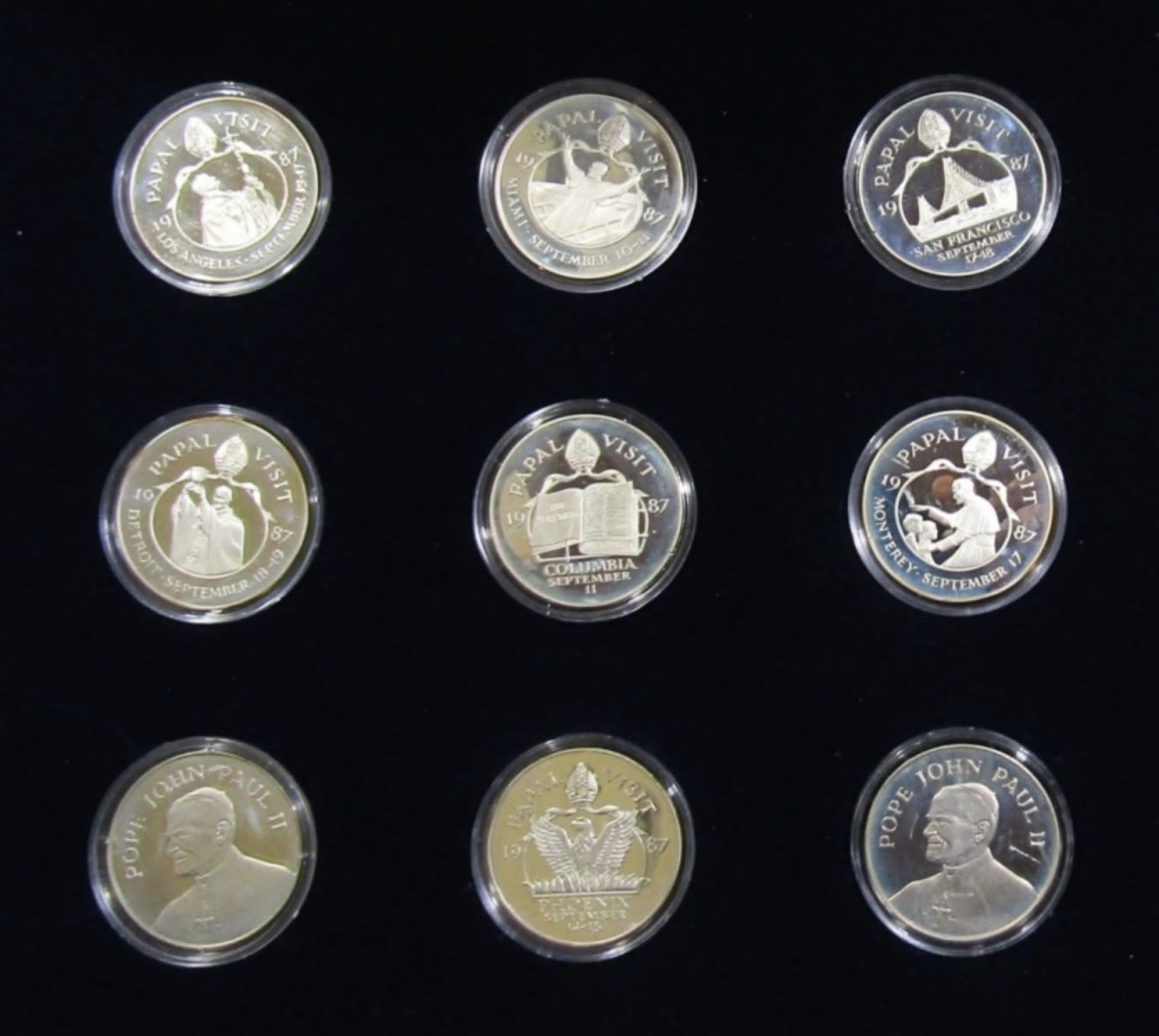 (APPROX 6.75ozt .925 SILVER TOTAL) PROOF 9-COIN COMMEMORATIVE COLLECTION OF THE POPE VISIT TO THE UNITED STATES, IN DISPLAY CASE WITH COA.
