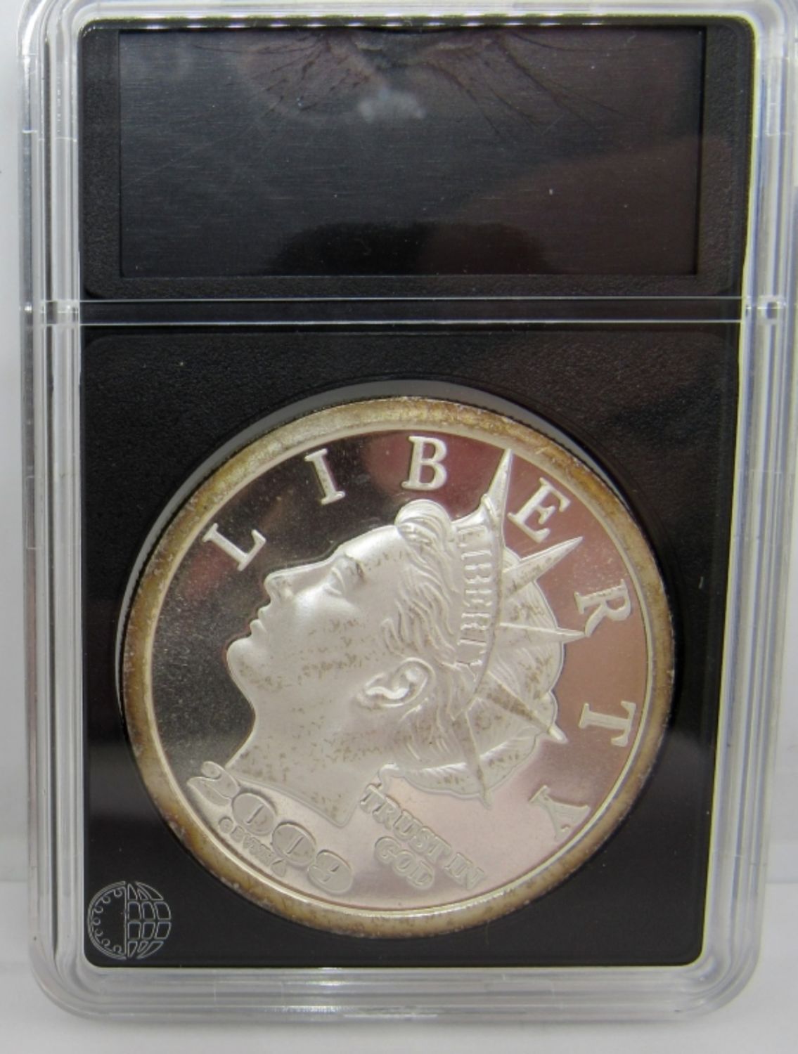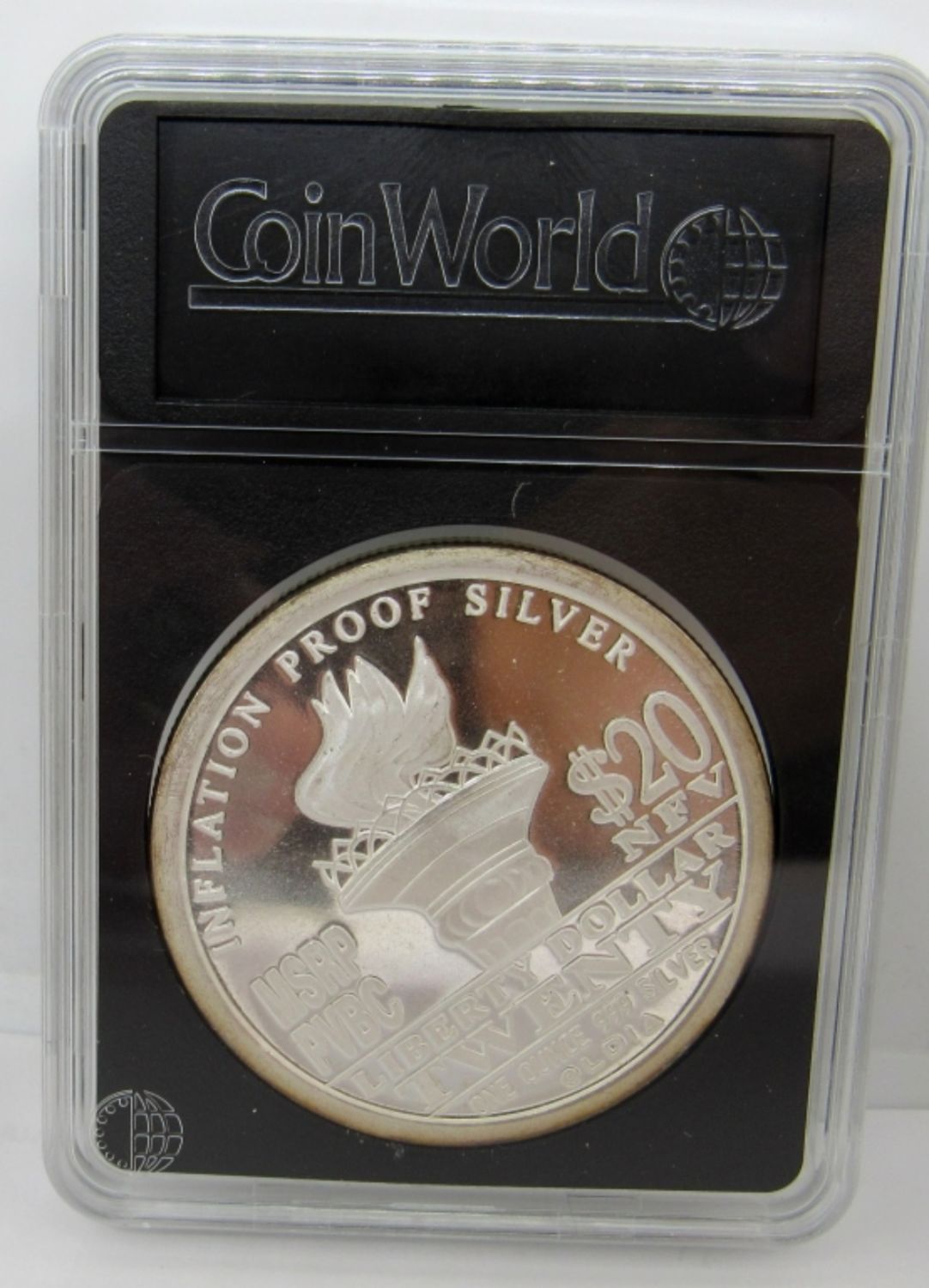 “$20 LIBERTY DOLLAR” SILVER ROUND IN PLASTIC SLAB.