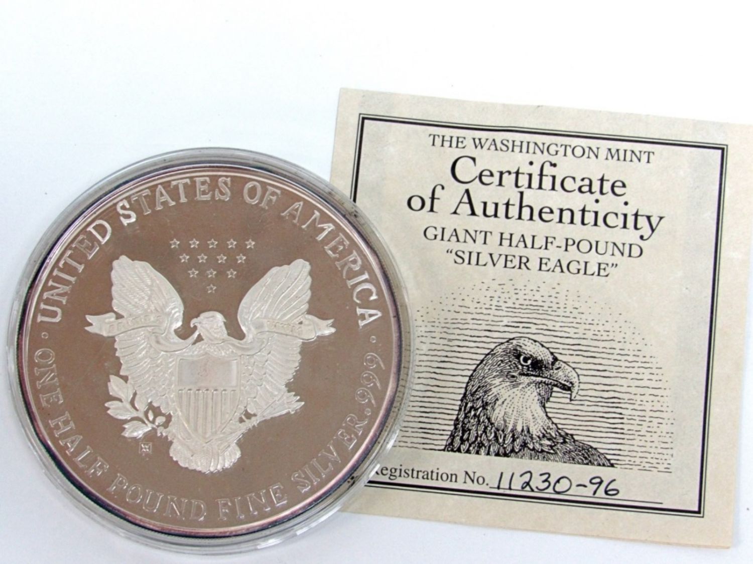 8 TROY OZ SILVER PROOF REPLICA OF 1995 SILVER EAGLE, WITH COA. WASHINGTON MINT.