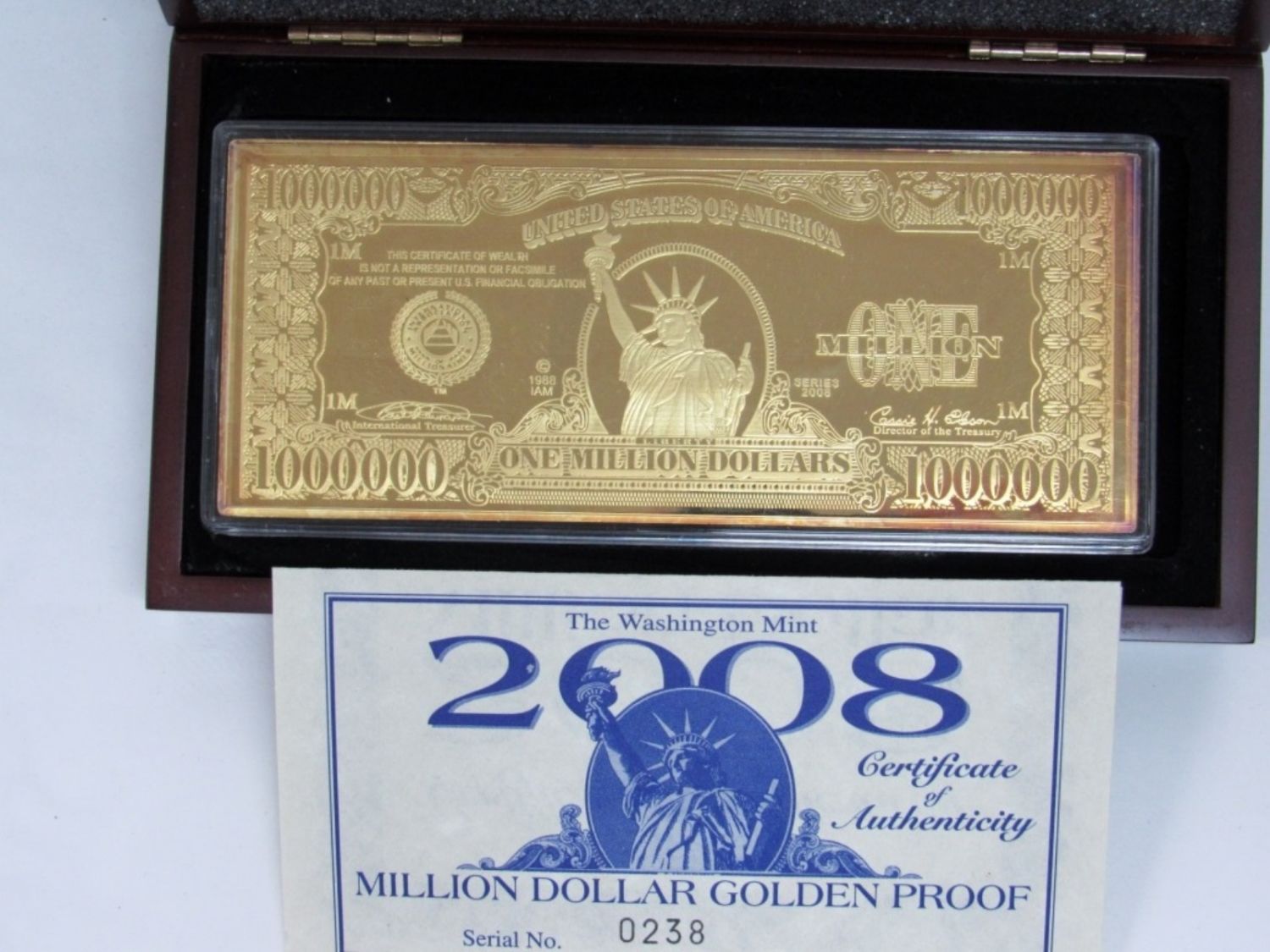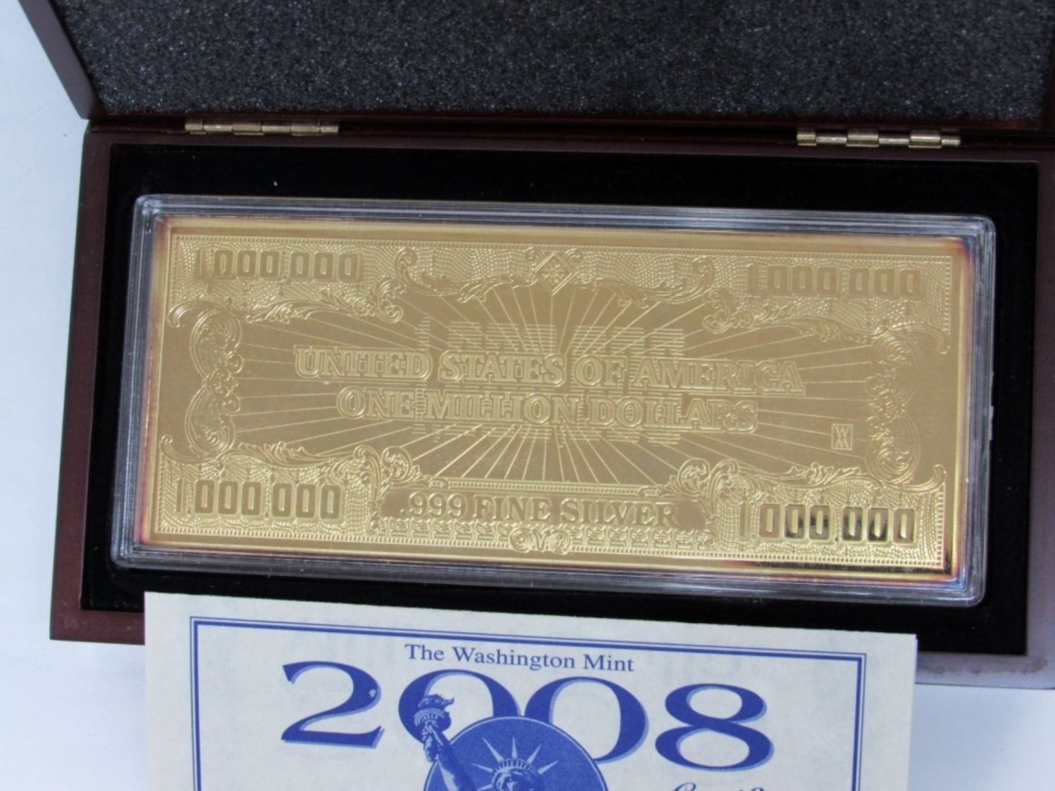 4 TROY OZ SILVER LAYERED IN 24K GOLD $1,000,000 BILL. IN ORIGINAL PACKAGING WITH DISPLAY CASE AND COA. WASHINGTON MINT.