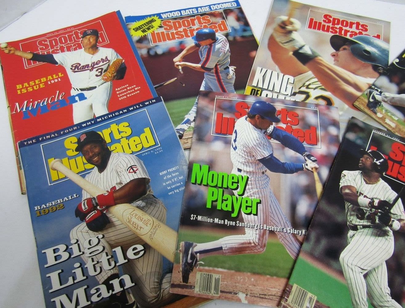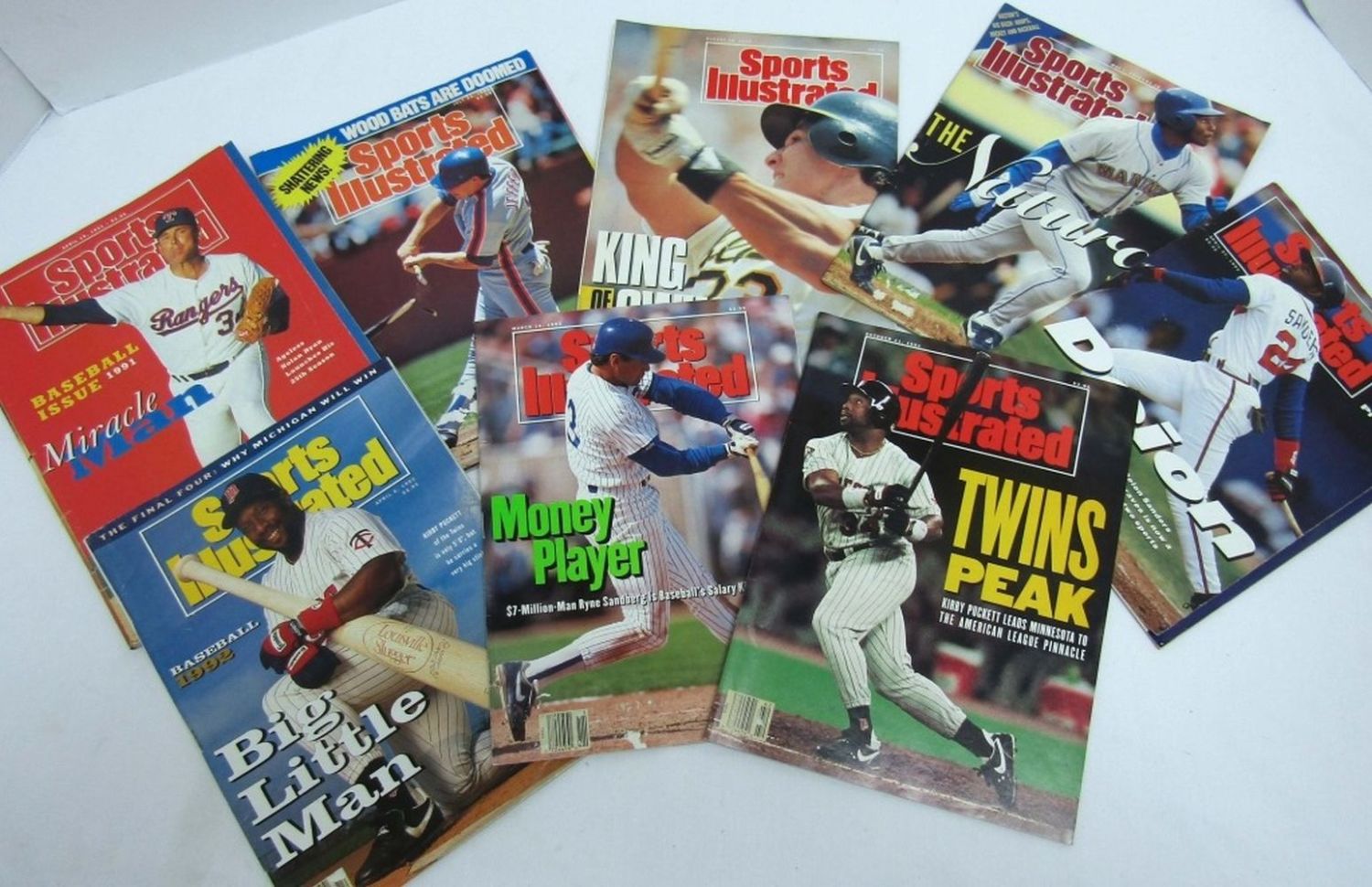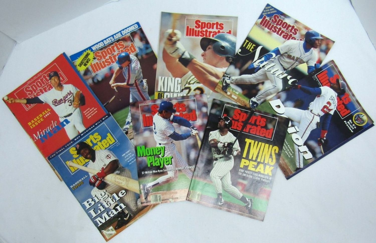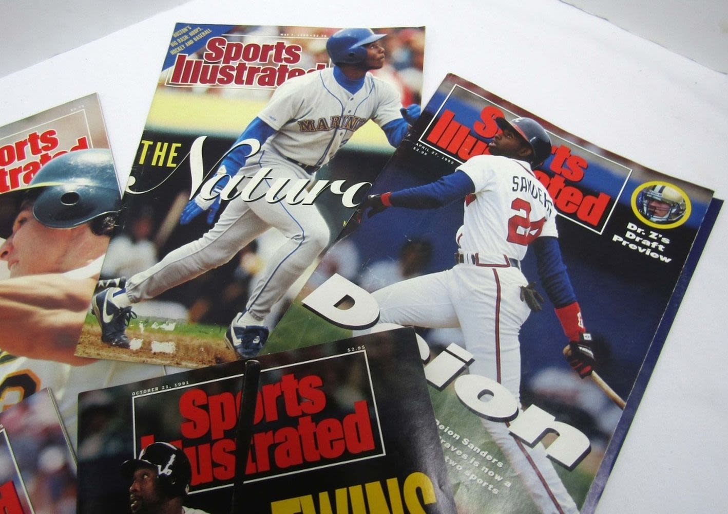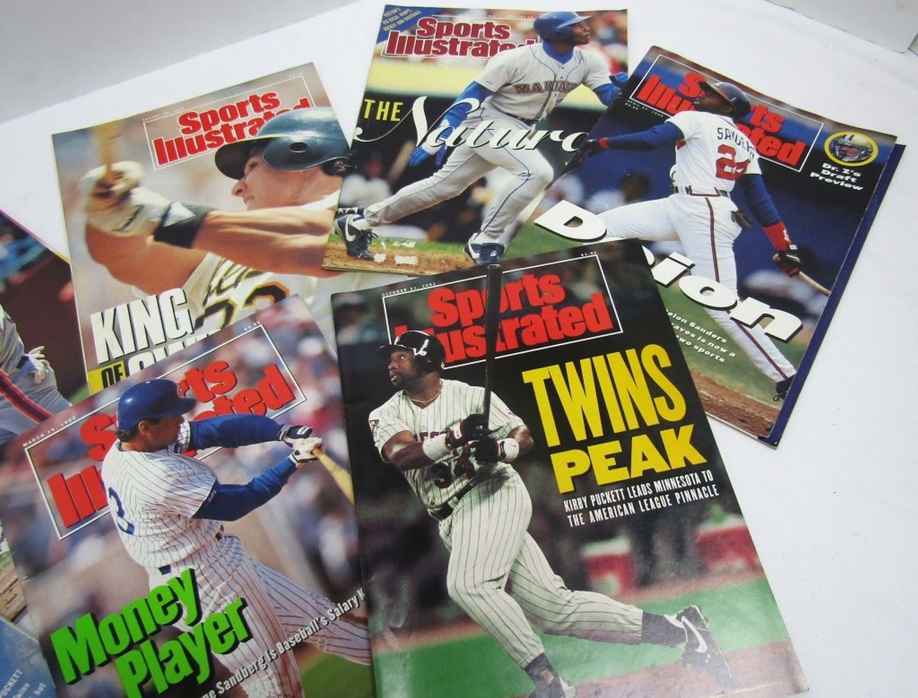 Years from (1) 1989,(2) 1990 Ken Griffery Jr on Cover of one, (2) 1991 Kirby Puckett on cover of one and Nolan Ryan on the other,(3) 1992 Deion Sanders on cover, Kriby Puckett on other cover