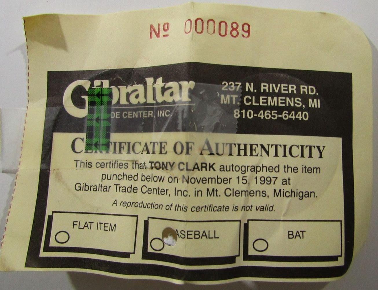 Autograph Baseball, COA Gibraltar Trade Center #000089
