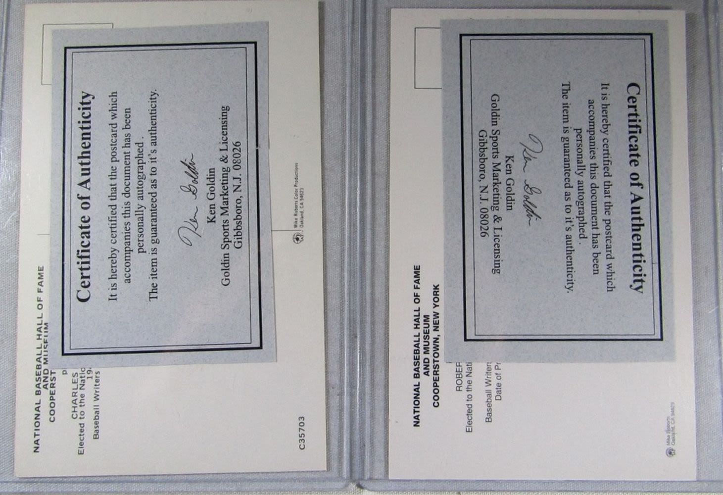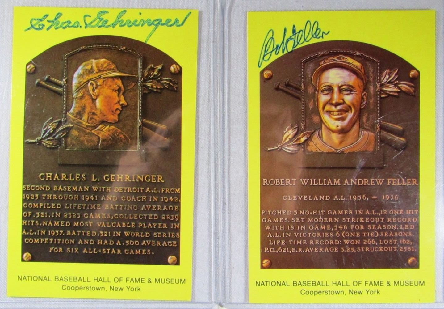 Autograph Hall of Fame Postcards Robert William Andrew Feller and Charles Gehringer, COA for both by Goldin Sports Marketing & Licensing