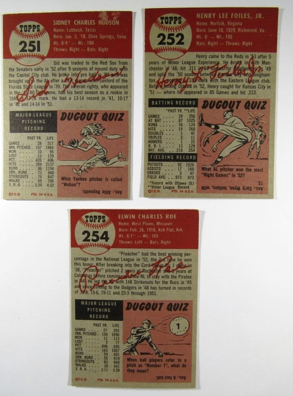 #251 HUDSON VG top border scuff, #252 FOILES EX+, #254 ROE EX – ALL NICE COLOR / GLOSS
