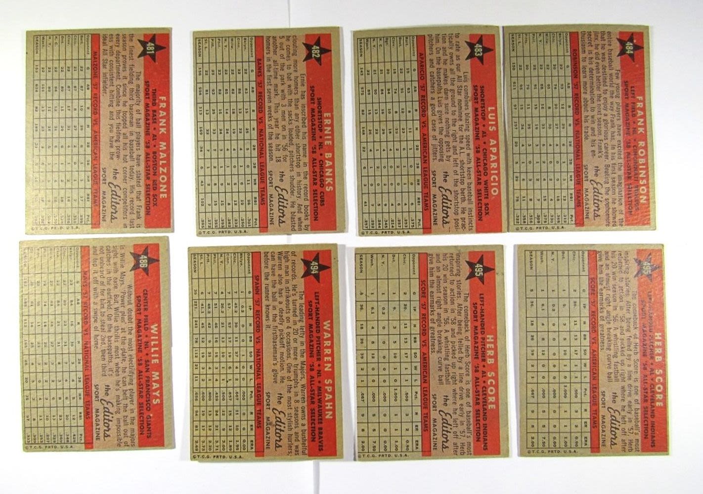 NICE VGEX or BETTER includes #481 MALZONE, #482 BANKS #483 APARICIO, #484 F. ROBINSON, #486 MAYS, #494 SPAHN, (2) #495 SCORE
