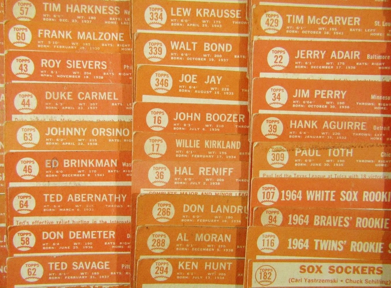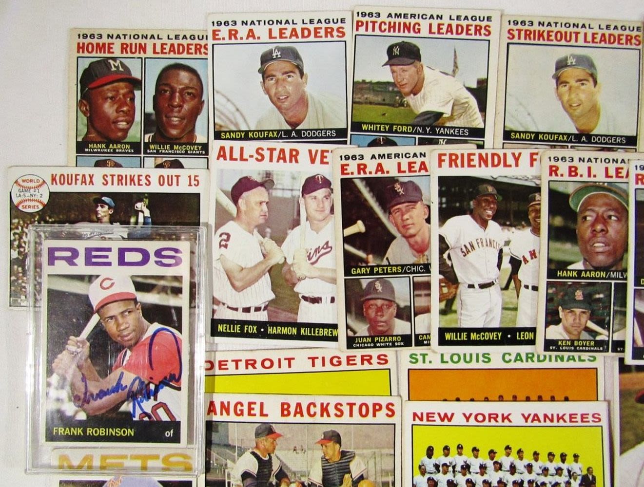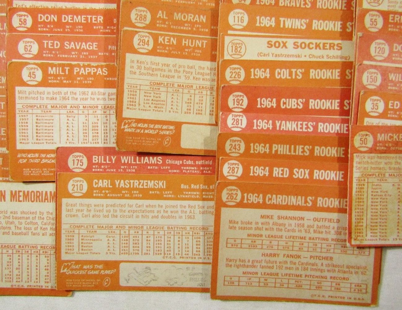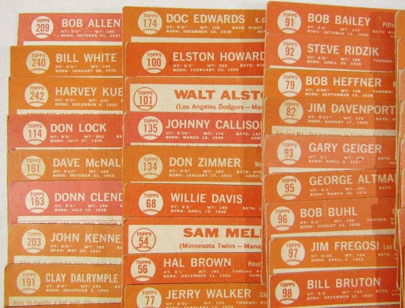 includes (16) LEAGUE LEADERS & WS CARDS; #21 BERRA, #35 MATHEWS, #50 MANTLE with Glue on Back, #55 BANKS, #120 DRYSDALE, #150 AMYS, #167 PINIELLA ROOKIE, #175 WILLIAMS, #210 YASTRZEMSKI, #230 B ROBINSON, #260 FRANK