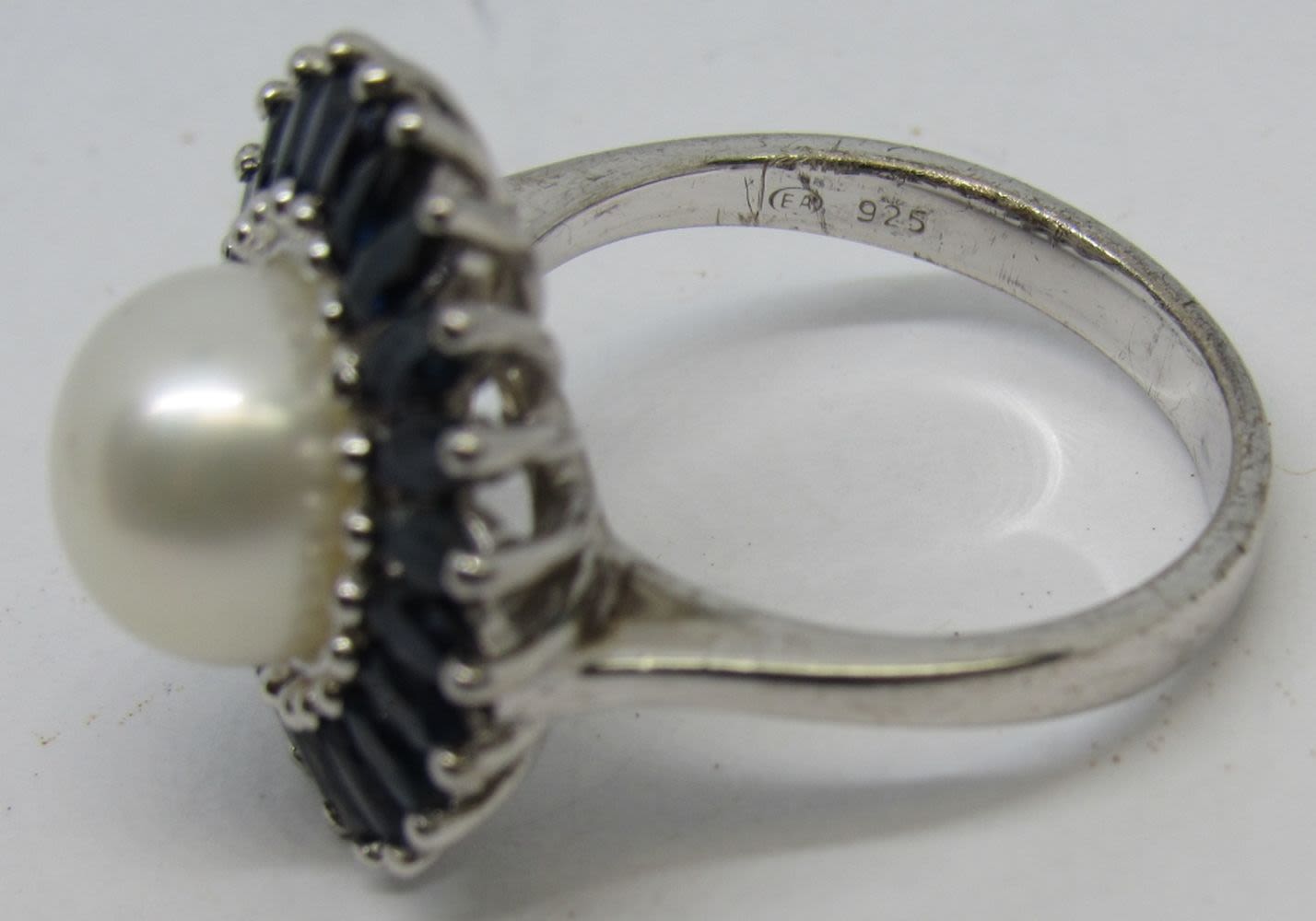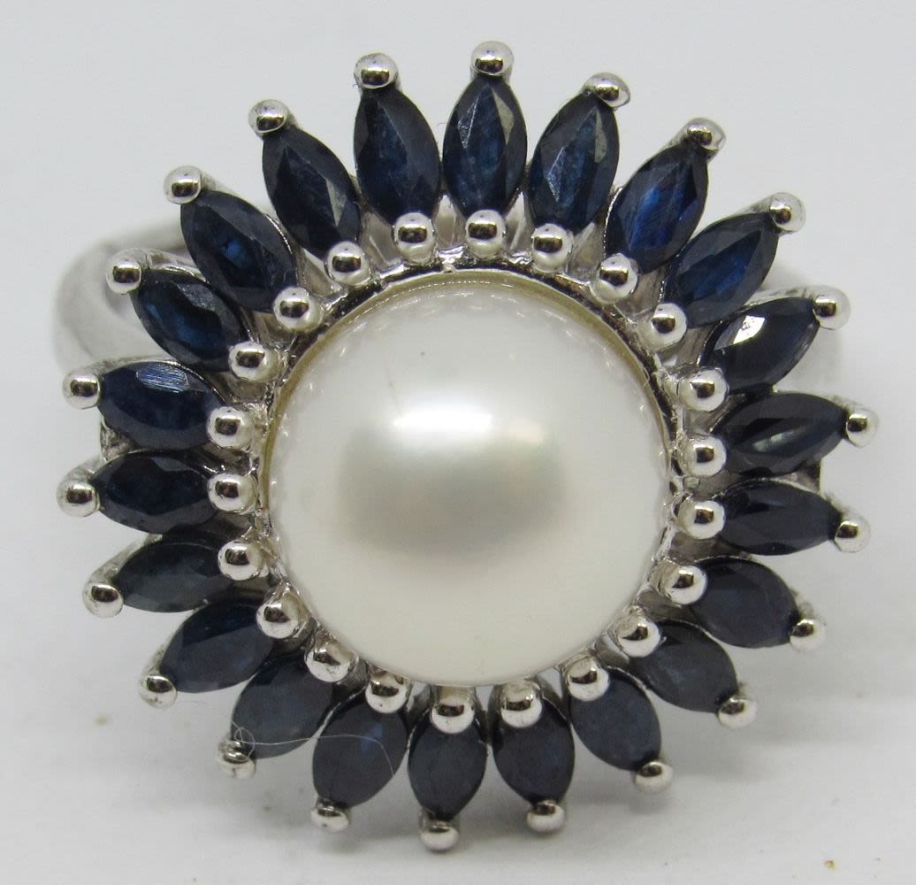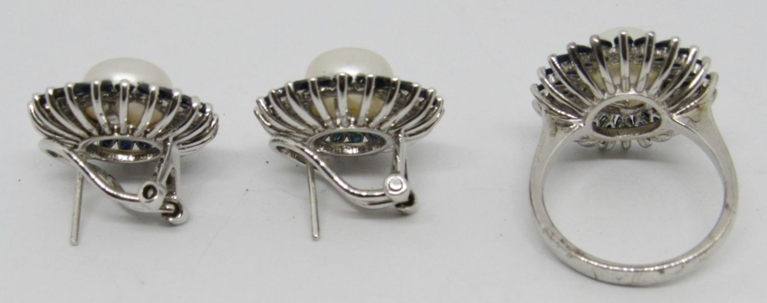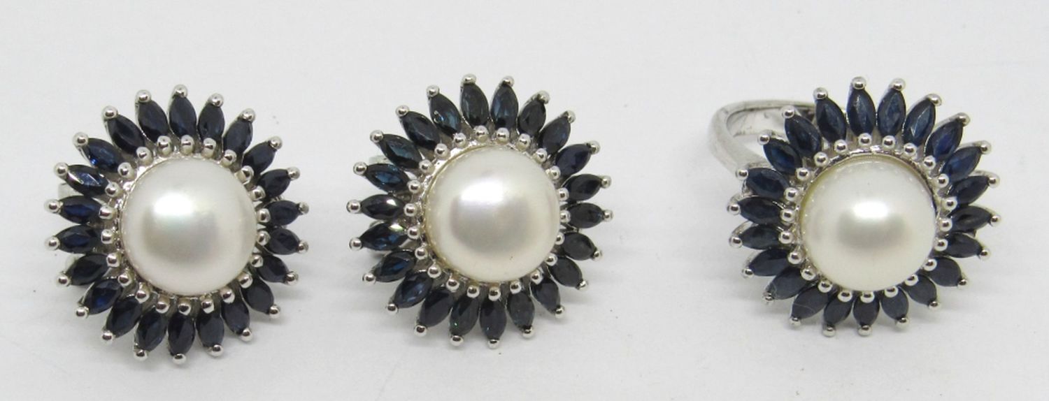 STERLING SILVER RING AND EARRING SET, PEARL CENTER, DARK BLUE GEM STONES, RING SIZE 8 (11.1 DWT)