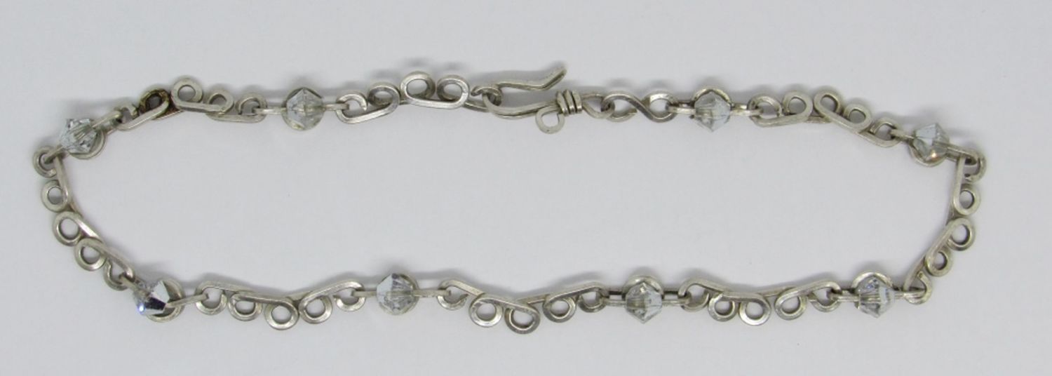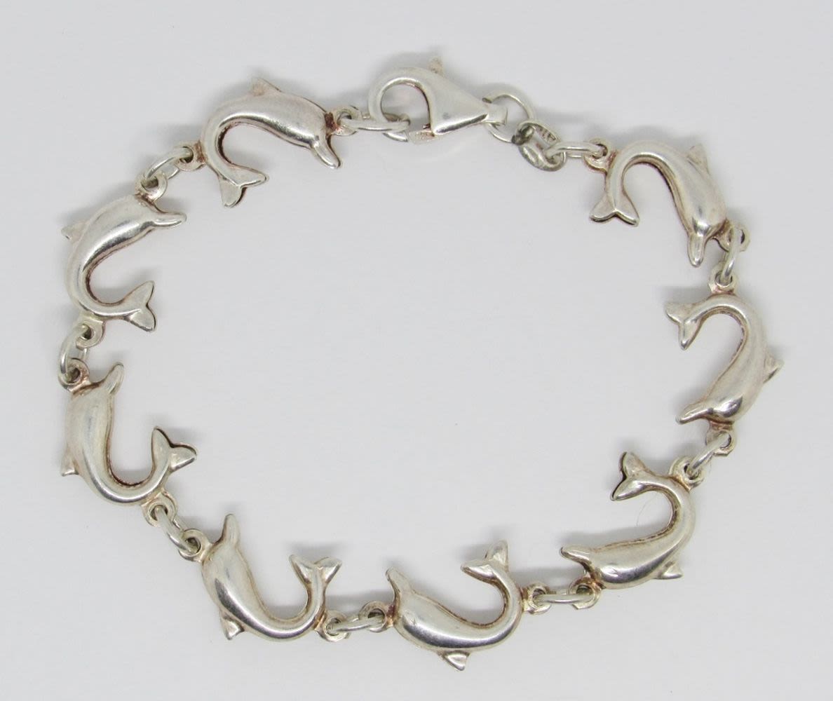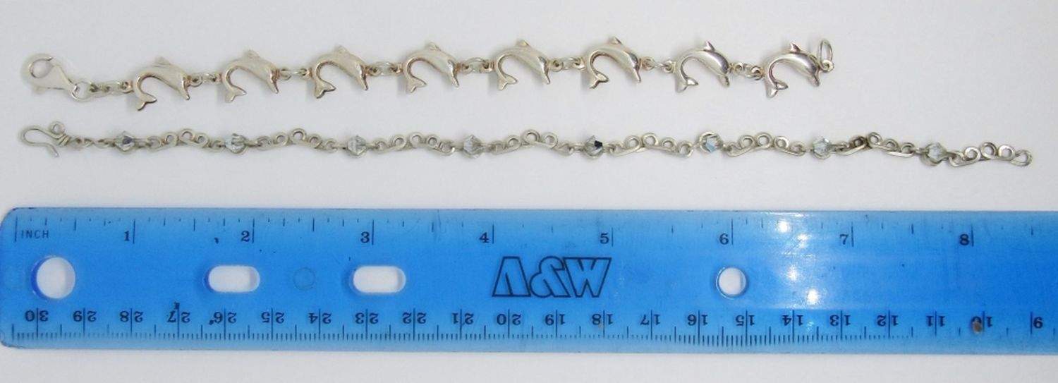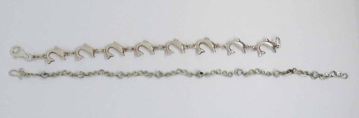 SET OF 2 STERLING SILVER BRACELETS, 1-DOLPHIN DESIGN 7″, 1-SWIRL PATTERN & SMALL GEM STONES 8″ (8 DWT)