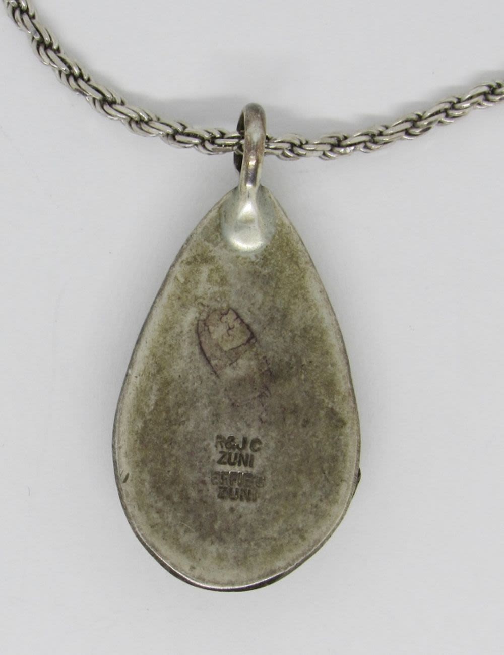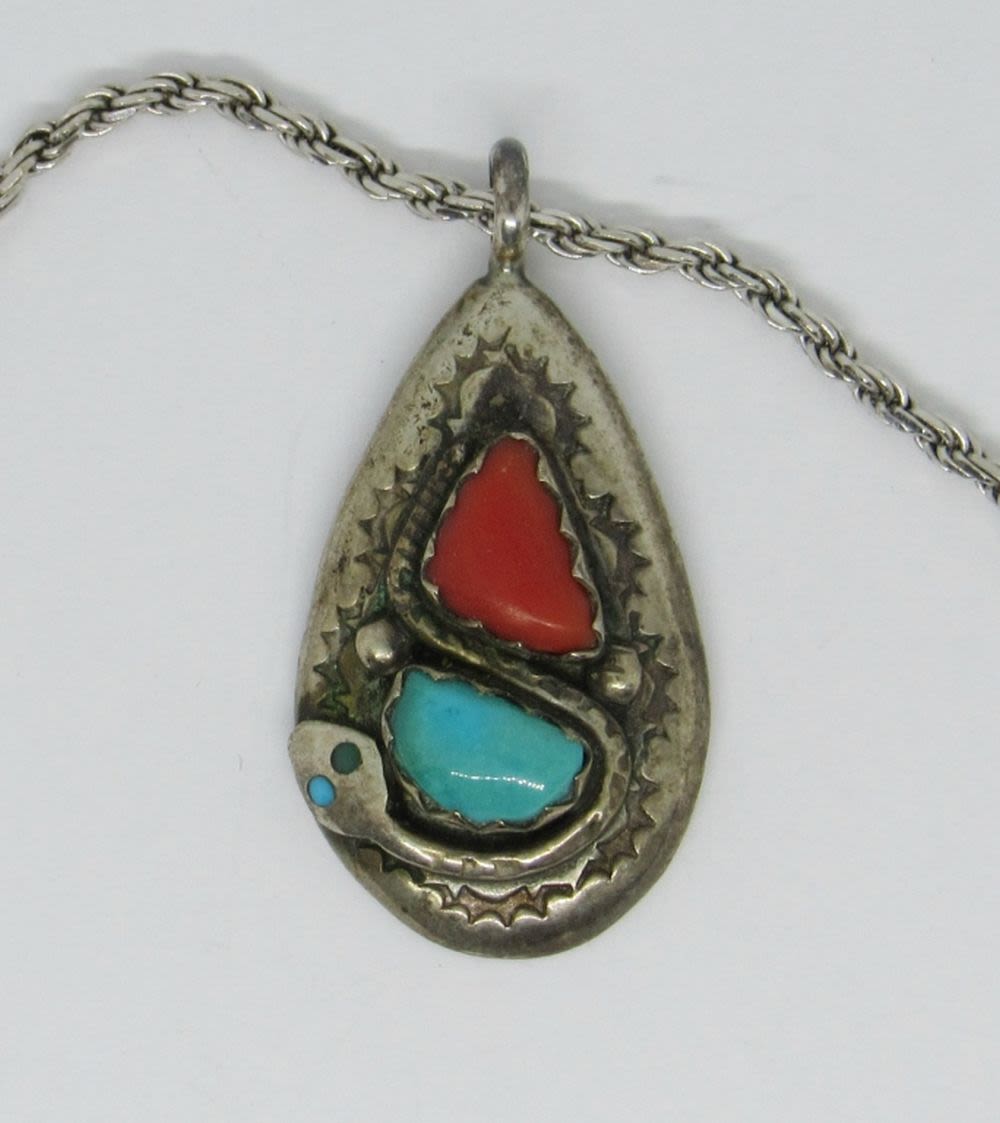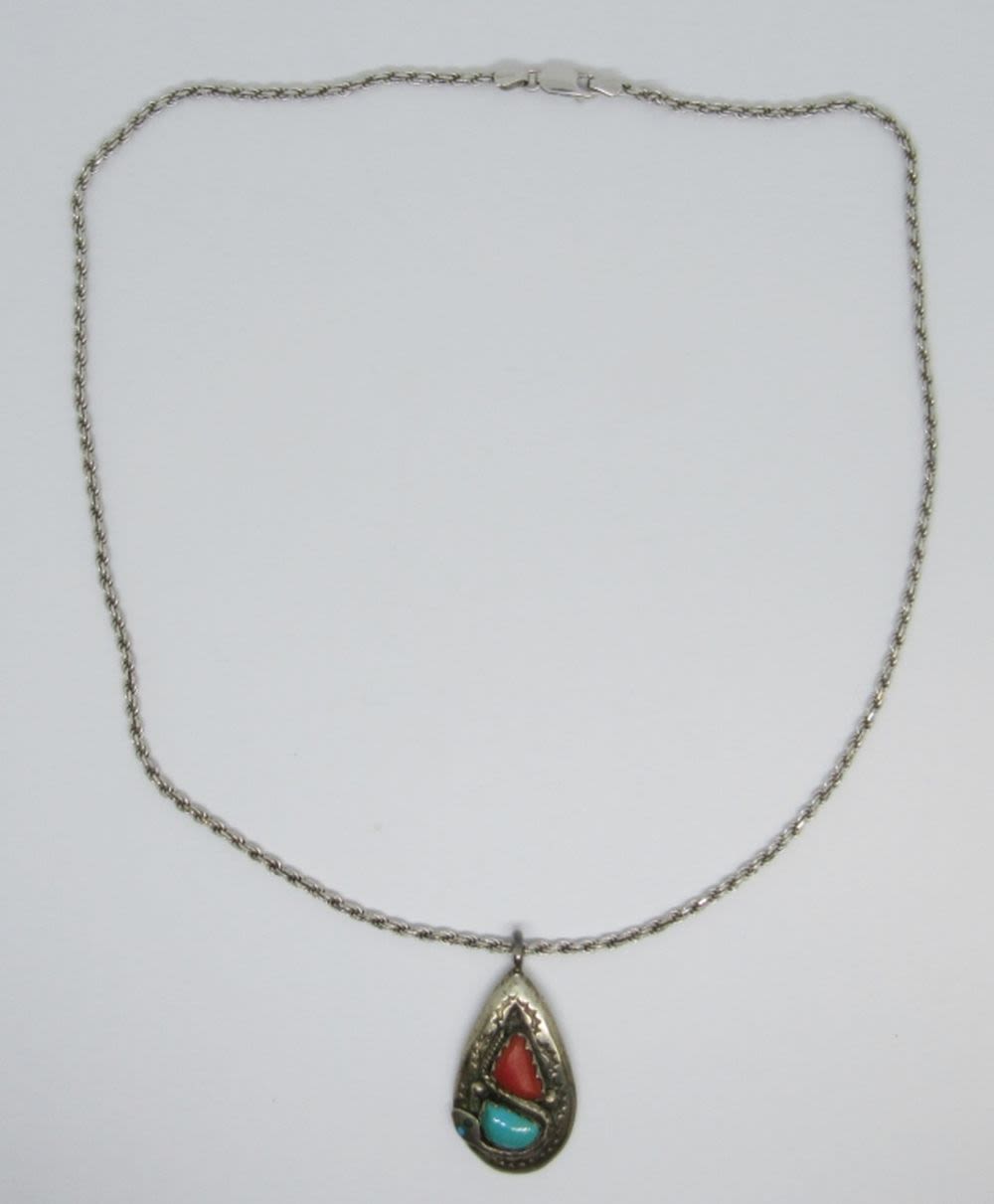 20″ STERLING SILVER CHAIN NECKLACE WITH SOUTHWEST STYLE EFFIE C ZUNI PENDANT, TURQUOISE & RED STONES, ETCHED DESIGN (14 DWT)