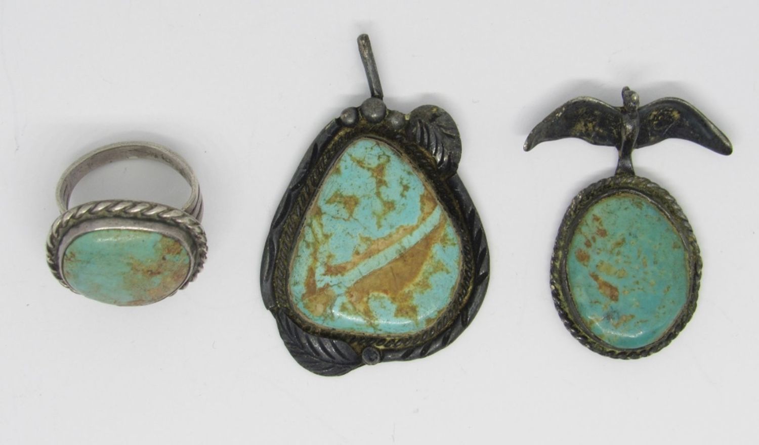 SET OF 3 VINTAGE STERLING TURQUOISE PIECES, 2 PENDANTS, 1 RING SIZE 5 (16.4 DWT)
