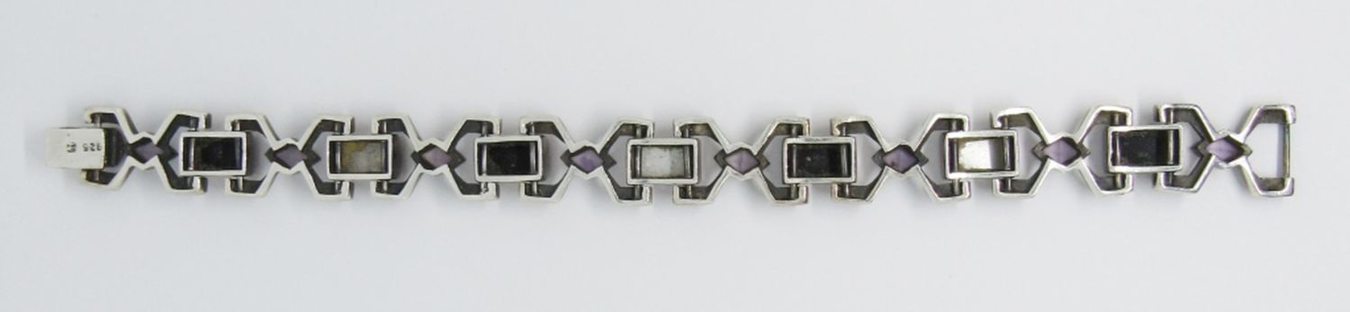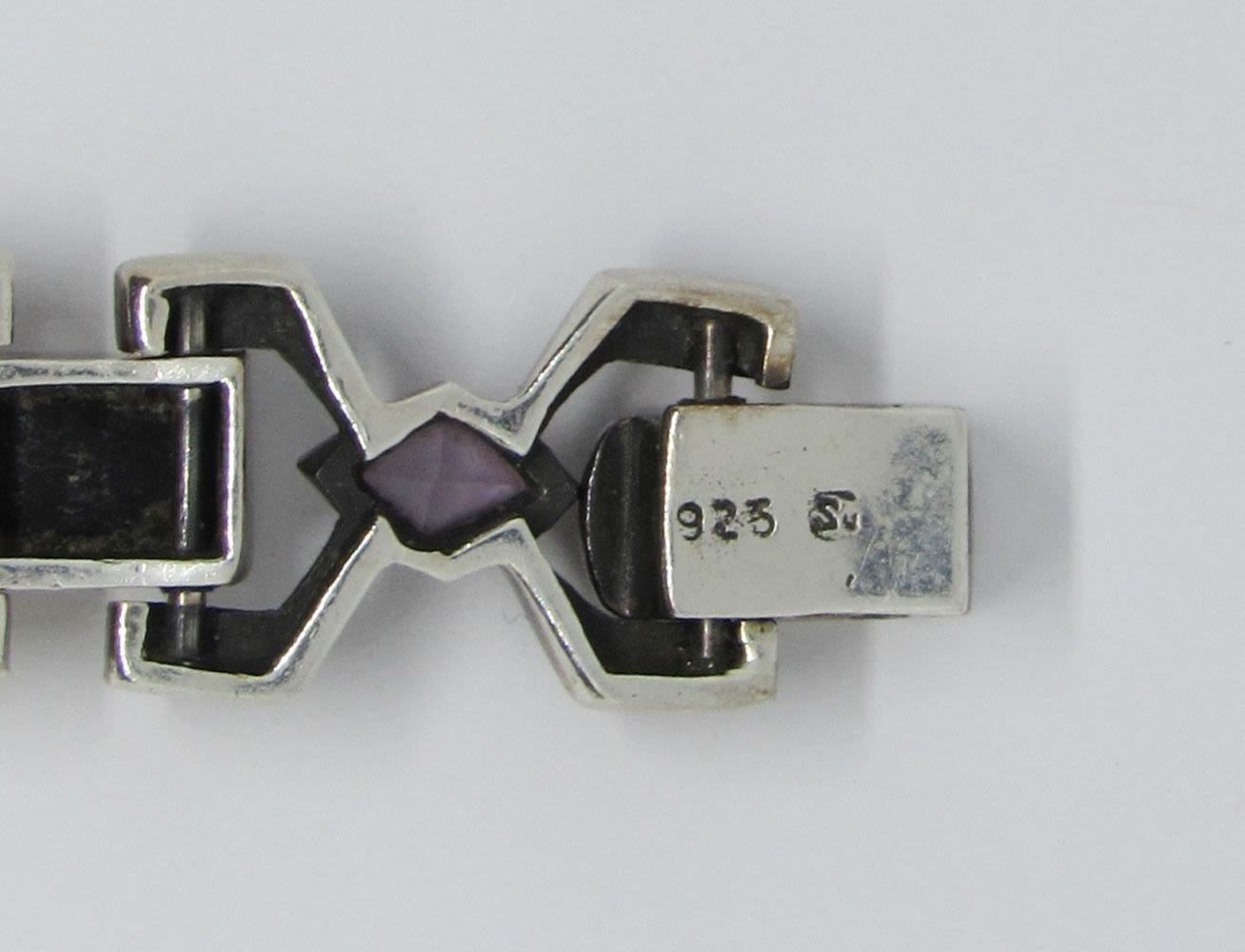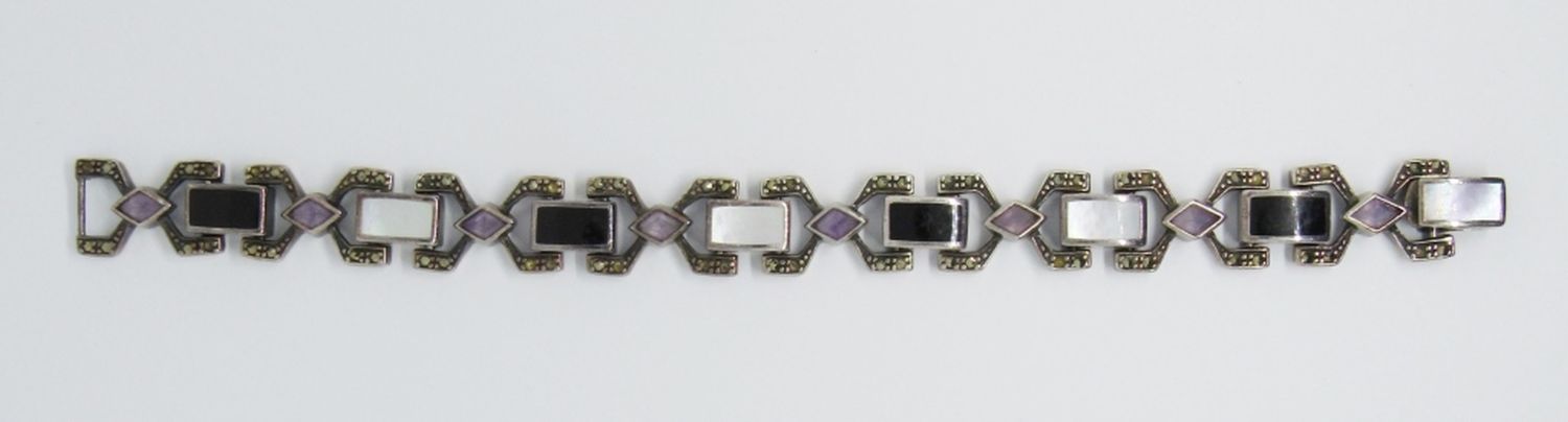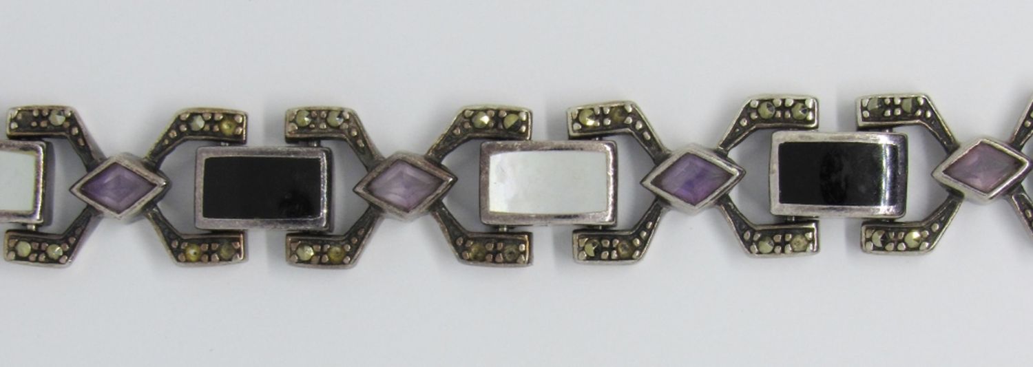 VINTAGE 7″ STERLING SILVER BRACELET WITH MARCASITE, PURPLE, WHITE, & BLACK STONES (18 DWT)