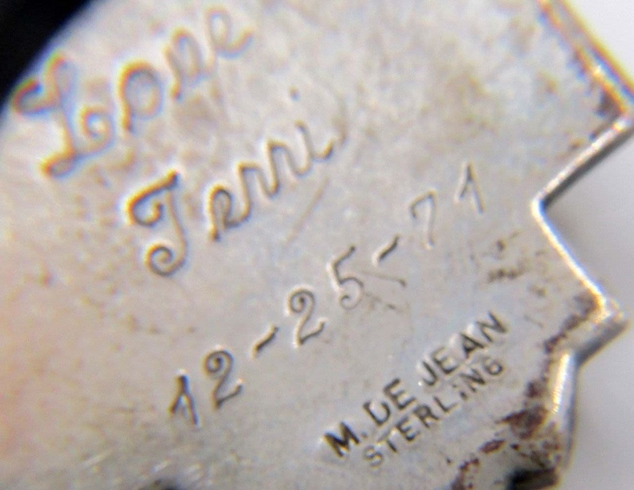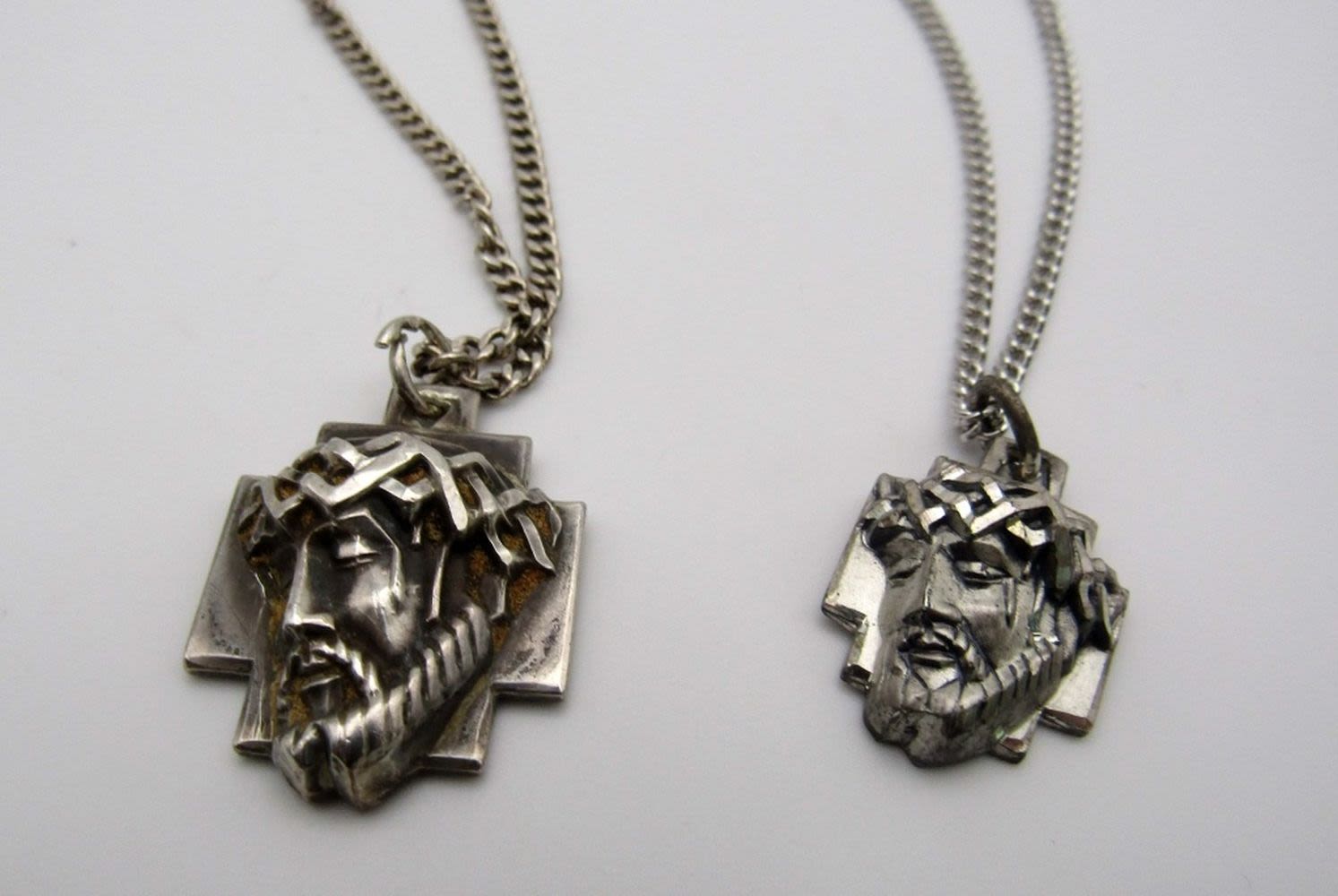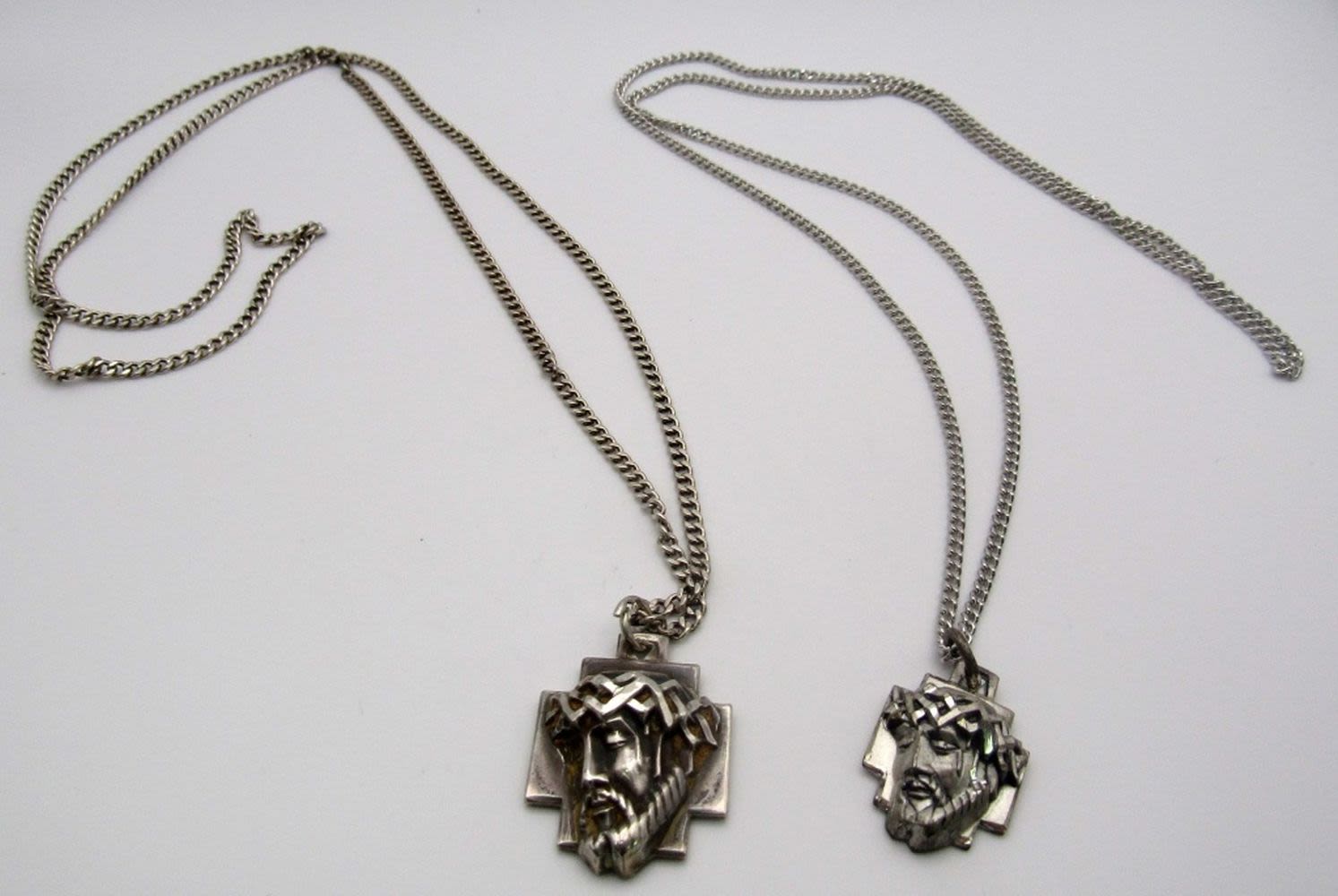 28 DWT, 22 and 26 in chain length,one smaller pendent is marked Creed and sterling, the bigger pendent is marked M. De Jean and sterling on back, also has a engraving