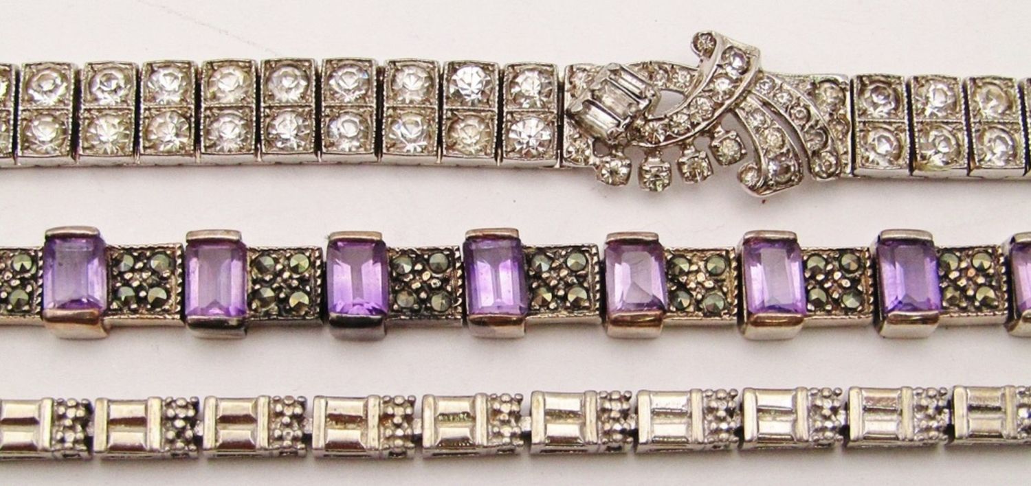 MARCASITE / PURPLE STONE 7″; VINTAGE CLEAR STONE 7″; SILVER 925 7 1/2″ ( 35 DWT)