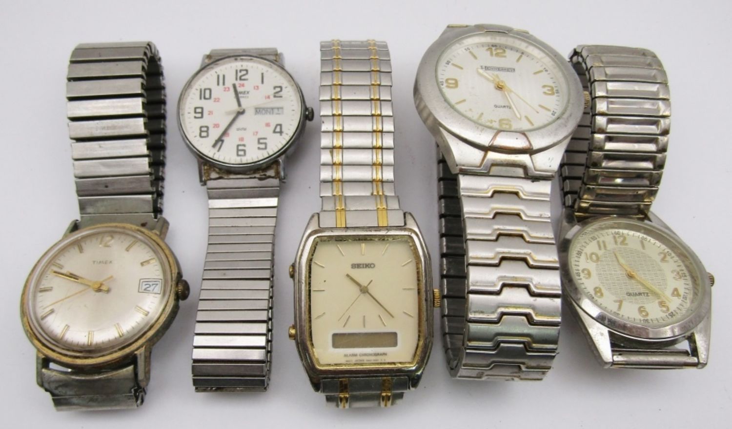 WITH STRETCHY BANDS: HENNESSEY QUARTZ-TIMEX QUARTZ DAY DATE-TIMEX CALENDAR-QUARTZ-SEIKO ALARM CHRONOGRAPH-ALL WATCHES UNTESTED/PARTS/REPAIR